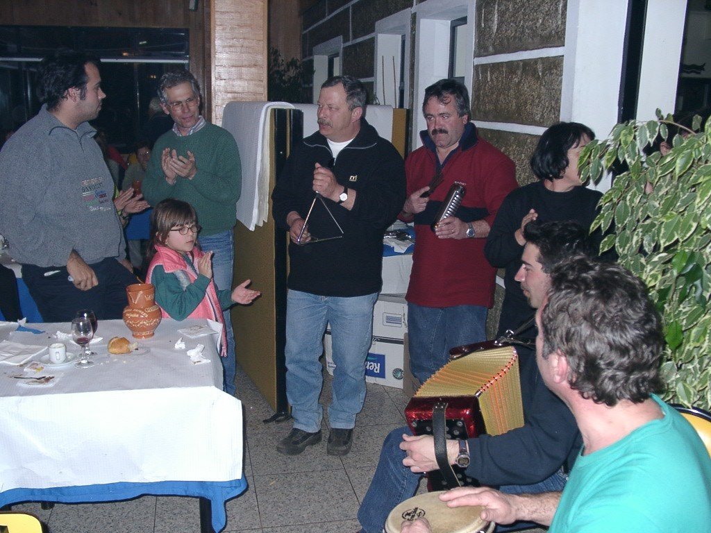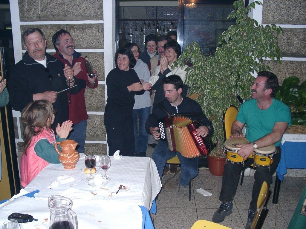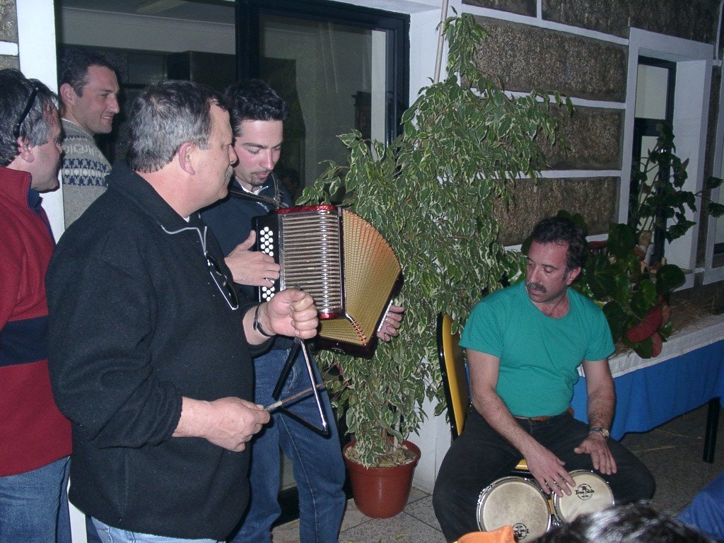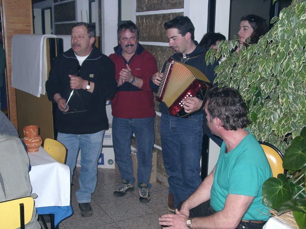 Vamos à sala e tudo preparado, só faltavam uns retoques na cozinha. Todos para a mesa, alguém grita, e a custo lá nos fomos sentando no varandim debruçado sobre a corga do rio Laboreiro, mais parecendo que íamos todos de carruagem e quando olhávamos para o Castelo, a imaginação era da "montanha russa". A noite entardeceu e, num ápice, o chouriço assado e o vinho apalhetado da região, mais o presunto de Castro, calaram a vozearia impaciente. Enquanto, se apreciava o saboroso presunto, o vinho escorria pelas gargantas secas dum dia baforento. Já refastelados e bem quentes, veio a feijoada, à farta, para todos. A caminheira Guilhermina fazia anos e cantaram-se "os parabéns" e todos comeram bolo, menos eu que, atacado de febre, aproveitei a confusão e fiz uma despedida "à francesa". Mas, contaram-me tudinho. O convívio estava para nascer como sempre; o Nuno Reis saca dá concertina e o Rui Lopes, dos tambores e pandeiretas e, ali, foi o "show music" dos Amigos da Chão, em pleno "ensaio do 4º Rancho". O Manuel Lopes fez uma perninha e cantou ao desafio e o vira foi geral.