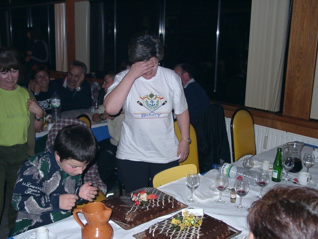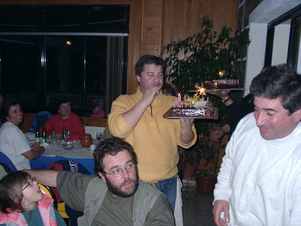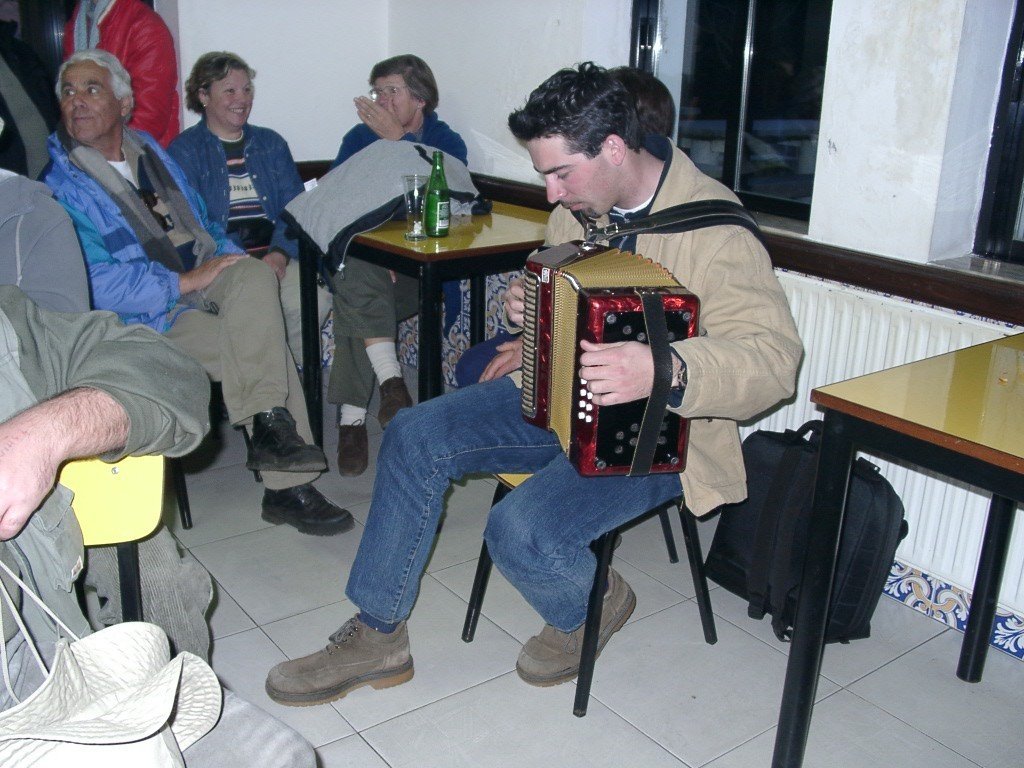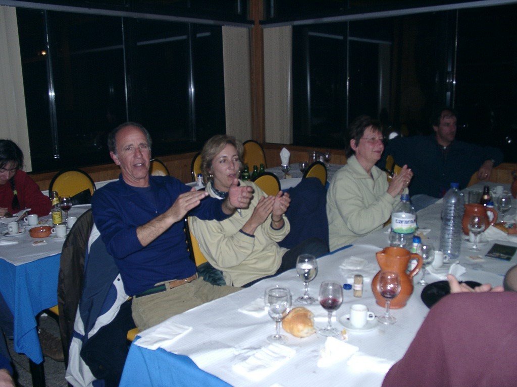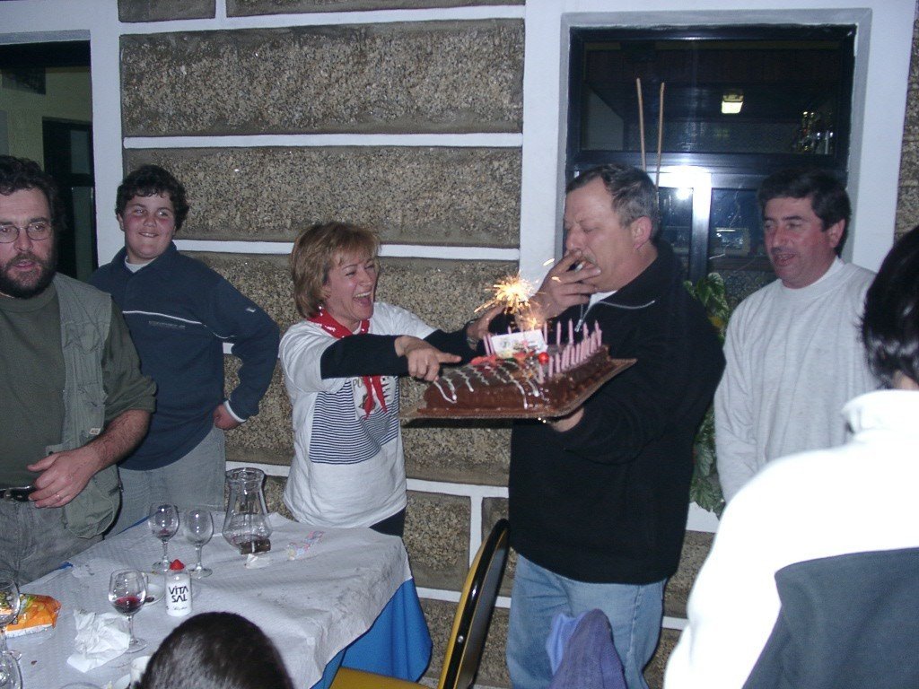 Vamos à sala e tudo preparado, só faltavam uns retoques na cozinha. Todos para a mesa, alguém grita, e a custo lá nos fomos sentando no varandim debruçado sobre a corga do rio Laboreiro, mais parecendo que íamos todos de carruagem e quando olhávamos para o Castelo, a imaginação era da "montanha russa". A noite entardeceu e, num ápice, o chouriço assado e o vinho apalhetado da região, mais o presunto de Castro, calaram a vozearia impaciente. Enquanto, se apreciava o saboroso presunto, o vinho escorria pelas gargantas secas dum dia baforento. Já refastelados e bem quentes, veio a feijoada, à farta, para todos. A caminheira Guilhermina fazia anos e cantaram-se "os parabéns" e todos comeram bolo, menos eu que, atacado de febre, aproveitei a confusão e fiz uma despedida "à francesa". Mas, contaram-me tudinho. O convívio estava para nascer como sempre; o Nuno Reis saca dá concertina e o Rui Lopes, dos tambores e pandeiretas e, ali, foi o "show music" dos Amigos da Chão, em pleno "ensaio do 4º Rancho". O Manuel Lopes fez uma perninha e cantou ao desafio e o vira foi geral.