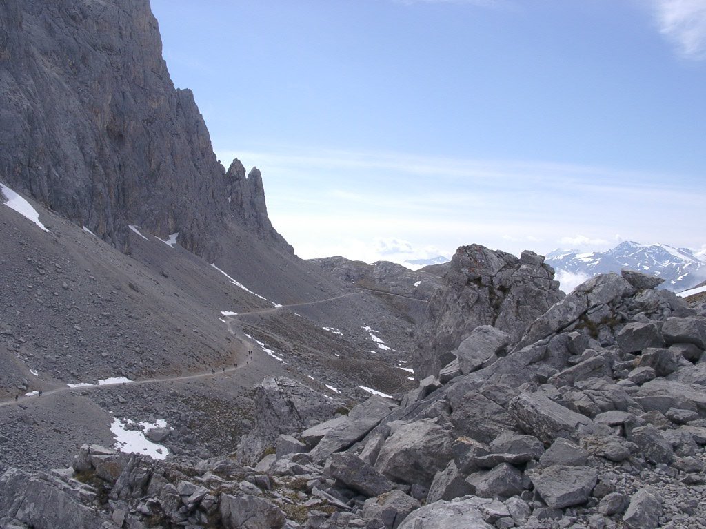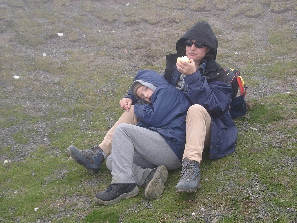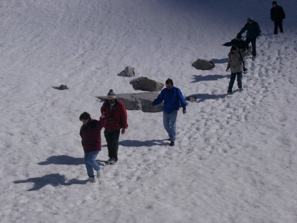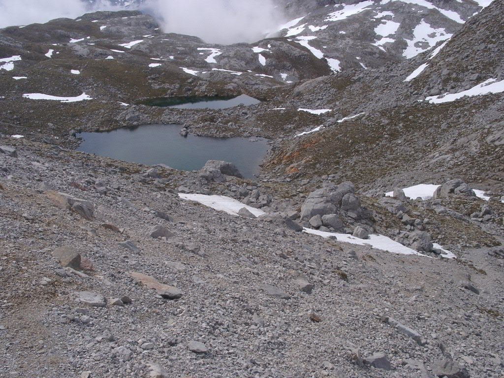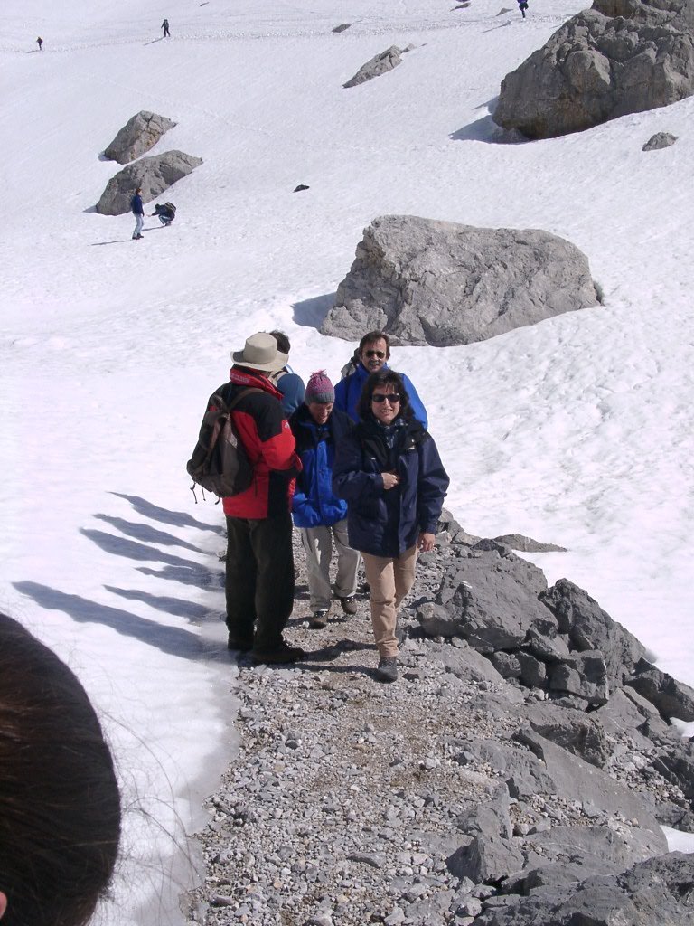 Pudemos observar a paisagem soberba, com seus picos e vales glaciares, mas tivemos que nos quedar antes da última subida para a cabana.