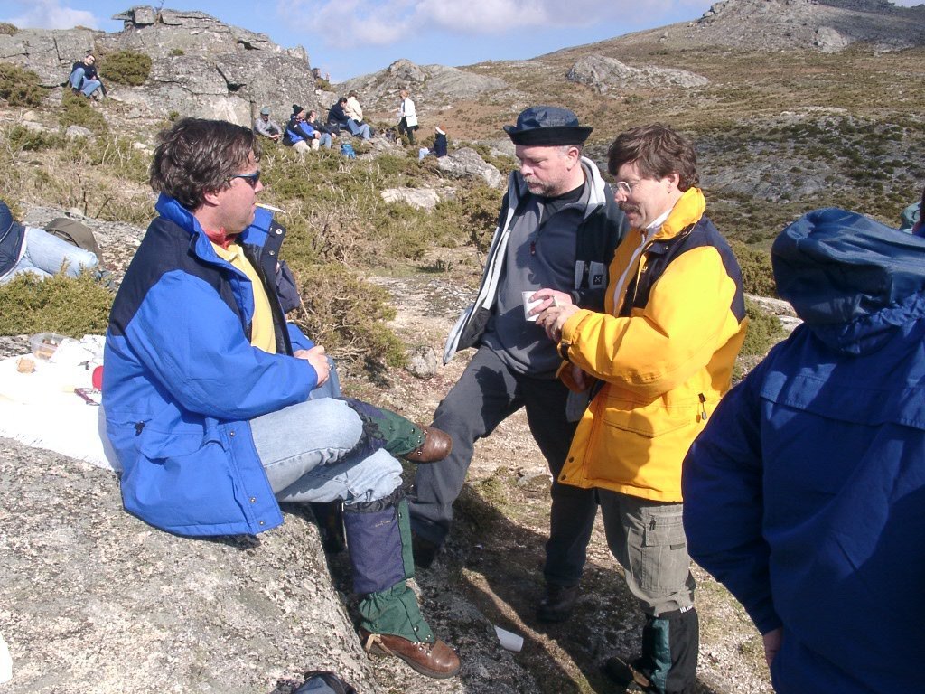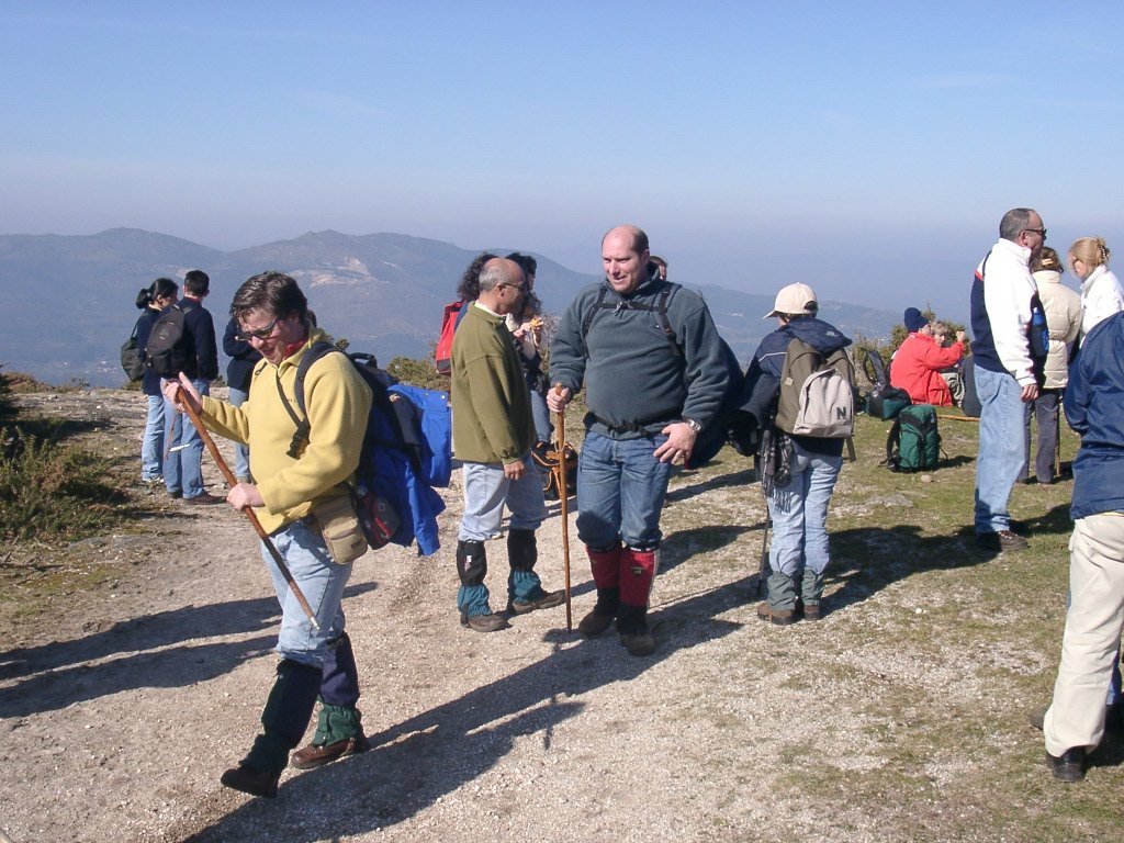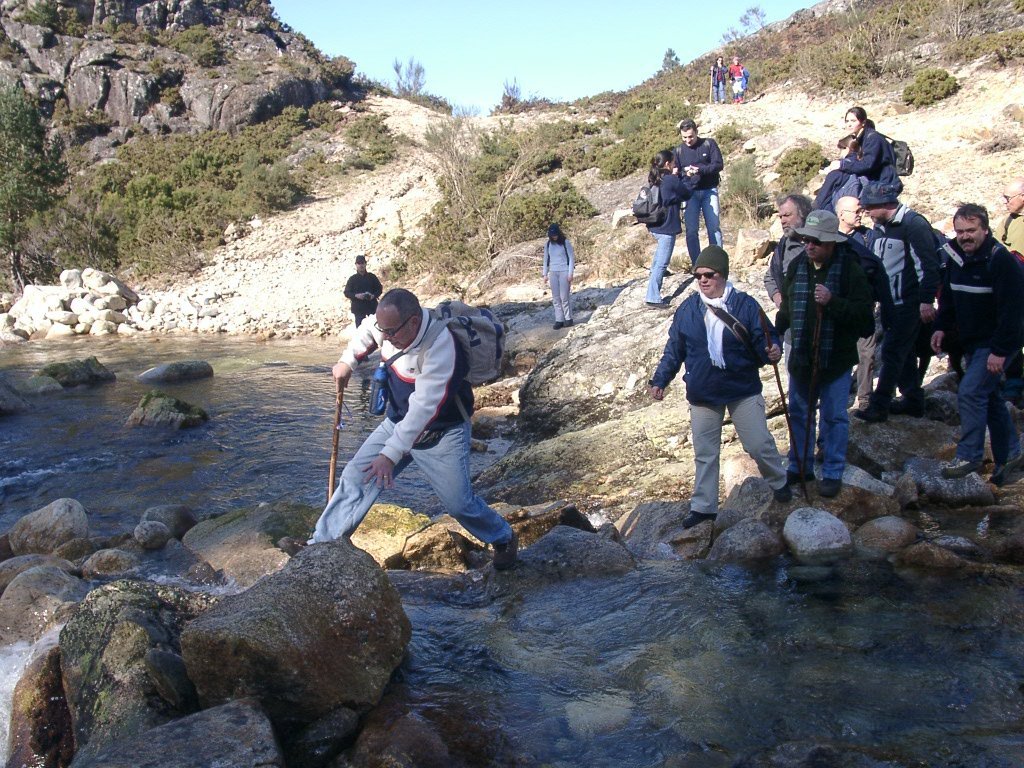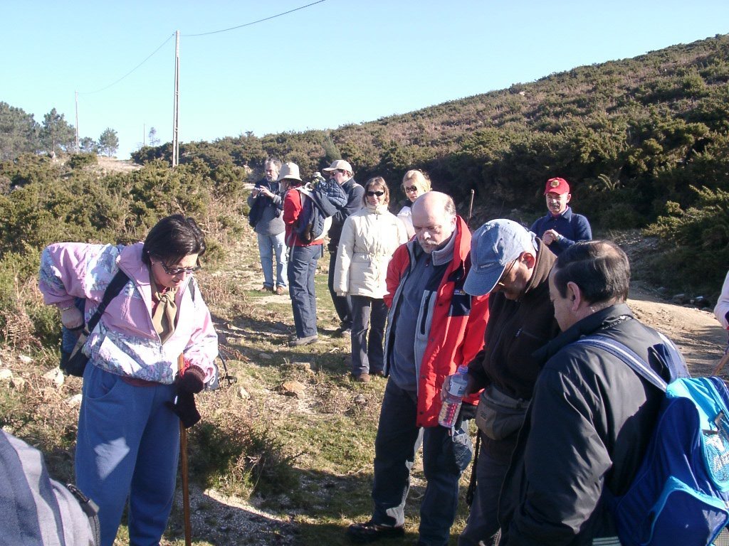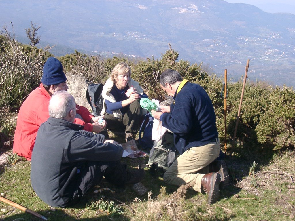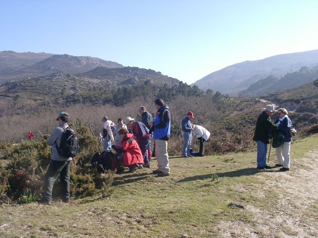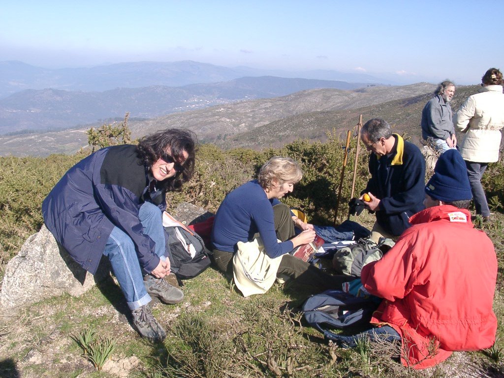 São tiros sim senhor, são dezenas de cães a ladrar, são cornetas a tocar, espanto nosso, ao longo do profundo vale que se estende á nossa frente percebemos que se está realizando uma Montaria ao Javali, com os caçadores colocados nas ”Portas”, locais estratégicos para esperar o animal. È com este cenário que no cimo de um morro, tentando abrigarmo-nos do vento frio e com o “Pedrinho” marco geodésico que assinala o alto da Serra da Peneda, que fazemos o reabastecimento, onde como sempre não faltam saborosas iguarias desencantadas do interior das mochilas, cruzando-se os sabores e com o Simões a mostrar os dotes de enólogo. Chega a hora dos “Baptizados”, o Pimenta e o Vilaça são os padrinhos da sempre solene cerimónia do “Arreum porum, bota abaixarum, Amèm” dos novos caminheiros, Alberto e Sara Leite, António e Isabel Alves, Luís Soares, Carla Freitas, Ivone Rio, Fernando e Sandra Ribeiro.