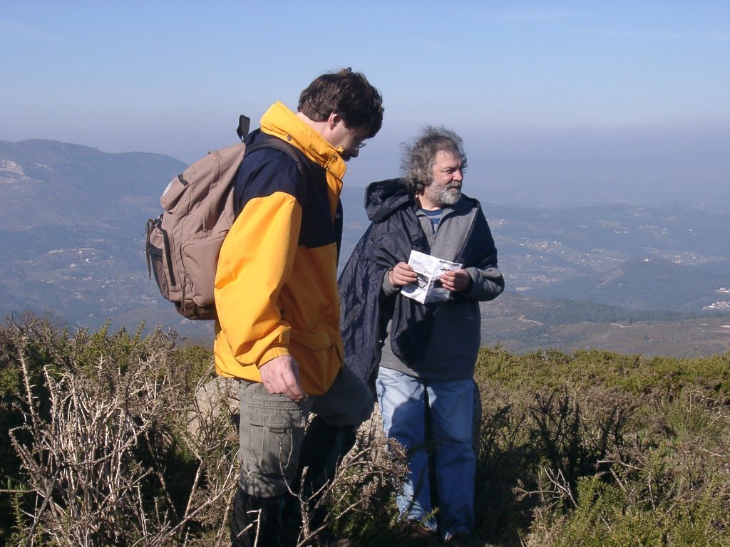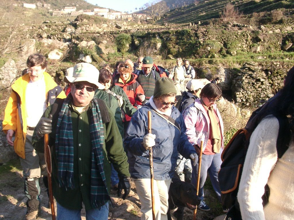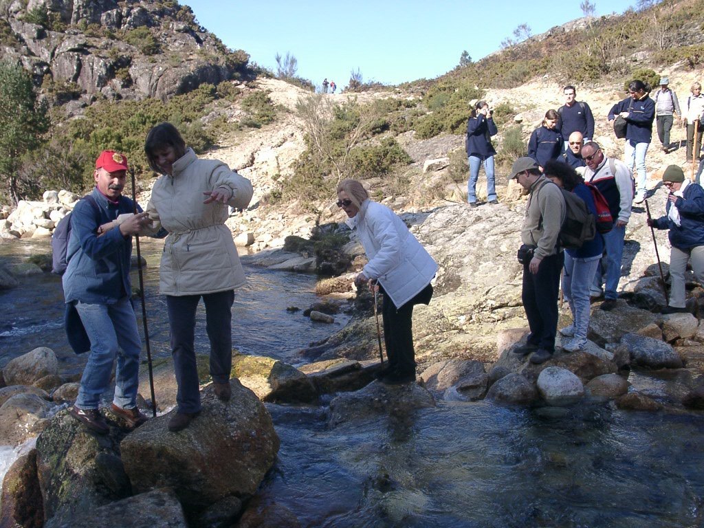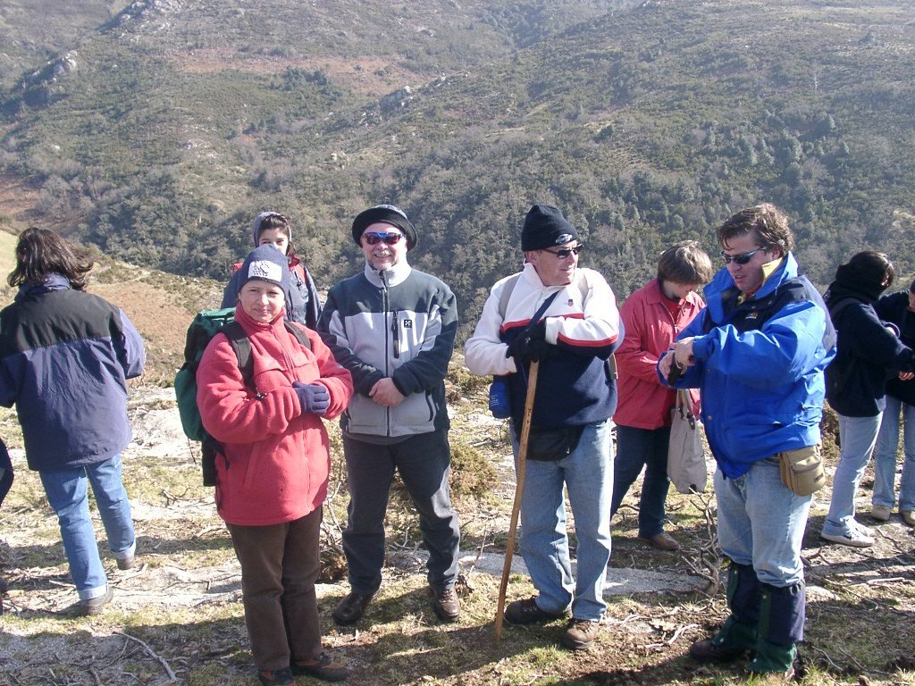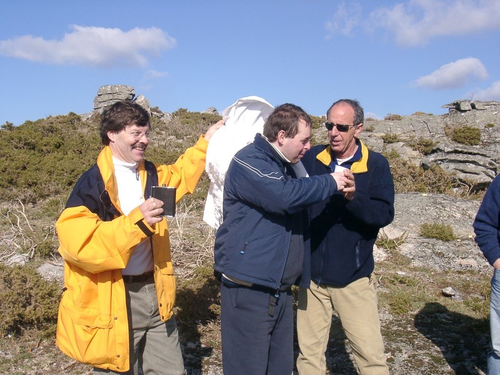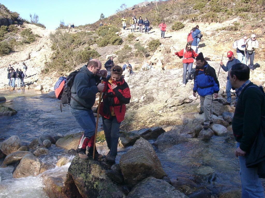 São tiros sim senhor, são dezenas de cães a ladrar, são cornetas a tocar, espanto nosso, ao longo do profundo vale que se estende á nossa frente percebemos que se está realizando uma Montaria ao Javali, com os caçadores colocados nas ”Portas”, locais estratégicos para esperar o animal. È com este cenário que no cimo de um morro, tentando abrigarmo-nos do vento frio e com o “Pedrinho” marco geodésico que assinala o alto da Serra da Peneda, que fazemos o reabastecimento, onde como sempre não faltam saborosas iguarias desencantadas do interior das mochilas, cruzando-se os sabores e com o Simões a mostrar os dotes de enólogo. Chega a hora dos “Baptizados”, o Pimenta e o Vilaça são os padrinhos da sempre solene cerimónia do “Arreum porum, bota abaixarum, Amèm” dos novos caminheiros, Alberto e Sara Leite, António e Isabel Alves, Luís Soares, Carla Freitas, Ivone Rio, Fernando e Sandra Ribeiro.