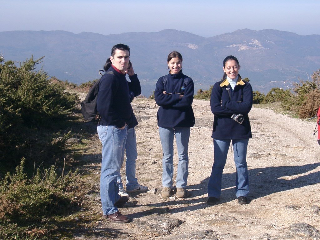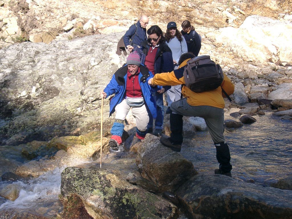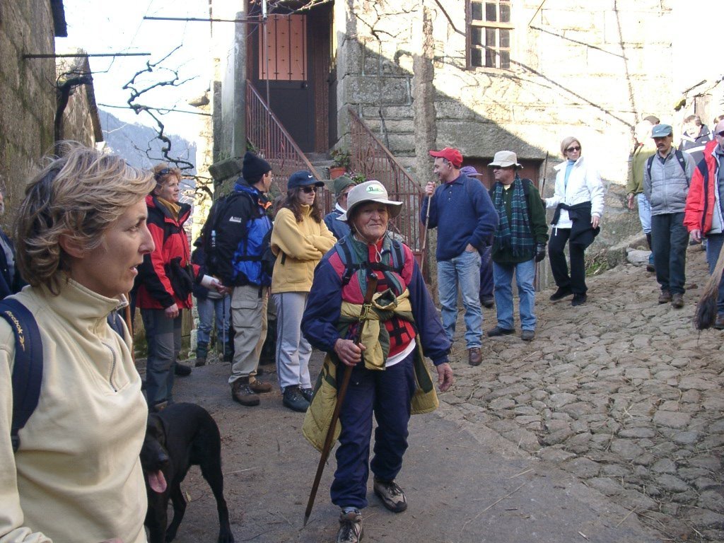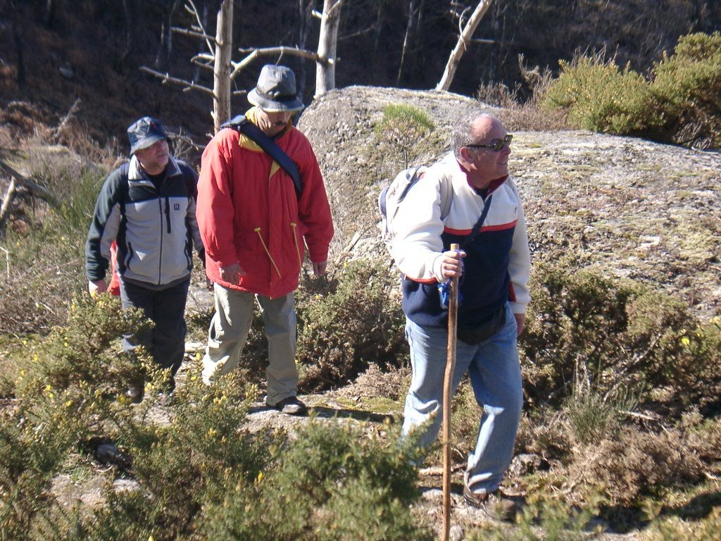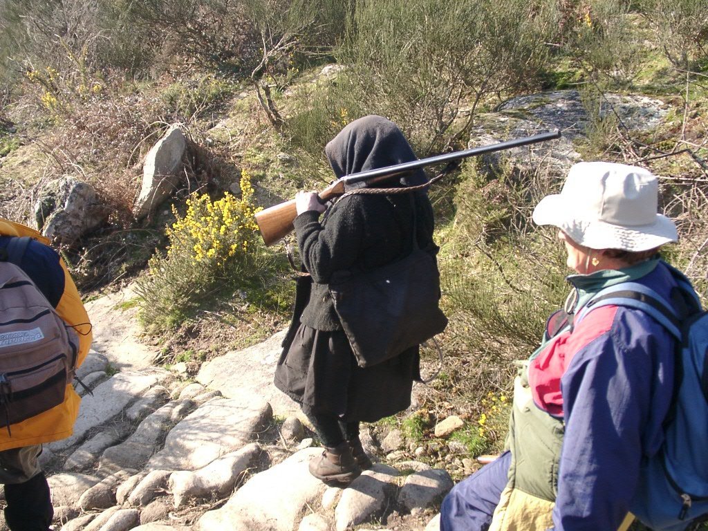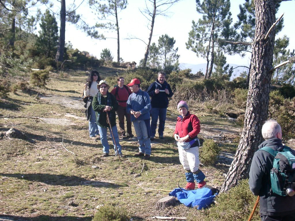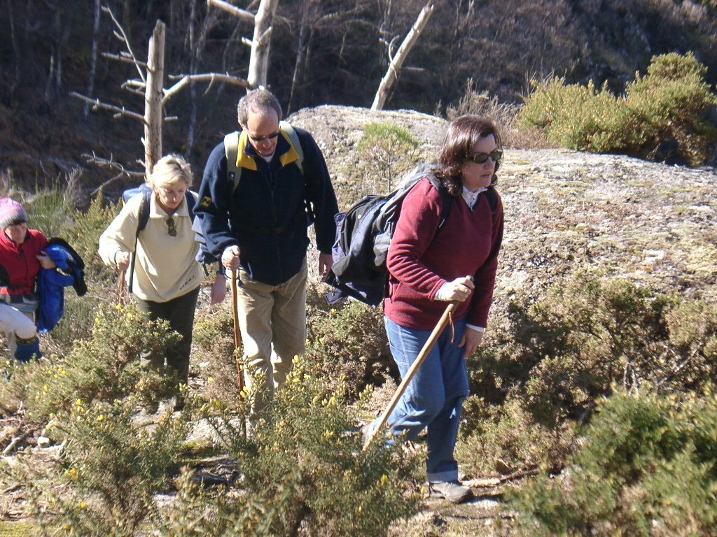 São tiros sim senhor, são dezenas de cães a ladrar, são cornetas a tocar, espanto nosso, ao longo do profundo vale que se estende á nossa frente percebemos que se está realizando uma Montaria ao Javali, com os caçadores colocados nas ”Portas”, locais estratégicos para esperar o animal. È com este cenário que no cimo de um morro, tentando abrigarmo-nos do vento frio e com o “Pedrinho” marco geodésico que assinala o alto da Serra da Peneda, que fazemos o reabastecimento, onde como sempre não faltam saborosas iguarias desencantadas do interior das mochilas, cruzando-se os sabores e com o Simões a mostrar os dotes de enólogo. Chega a hora dos “Baptizados”, o Pimenta e o Vilaça são os padrinhos da sempre solene cerimónia do “Arreum porum, bota abaixarum, Amèm” dos novos caminheiros, Alberto e Sara Leite, António e Isabel Alves, Luís Soares, Carla Freitas, Ivone Rio, Fernando e Sandra Ribeiro.
