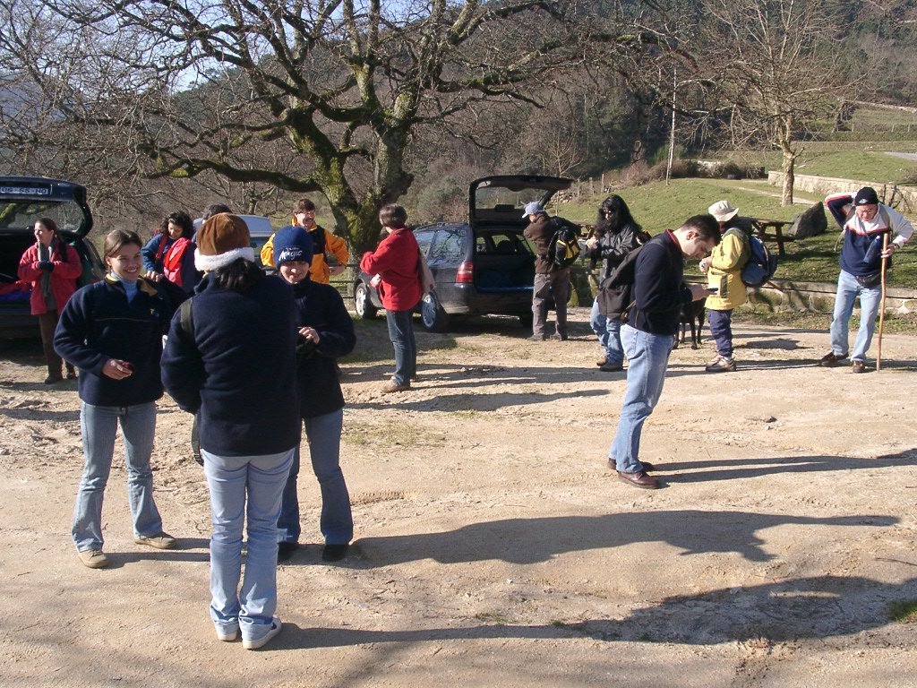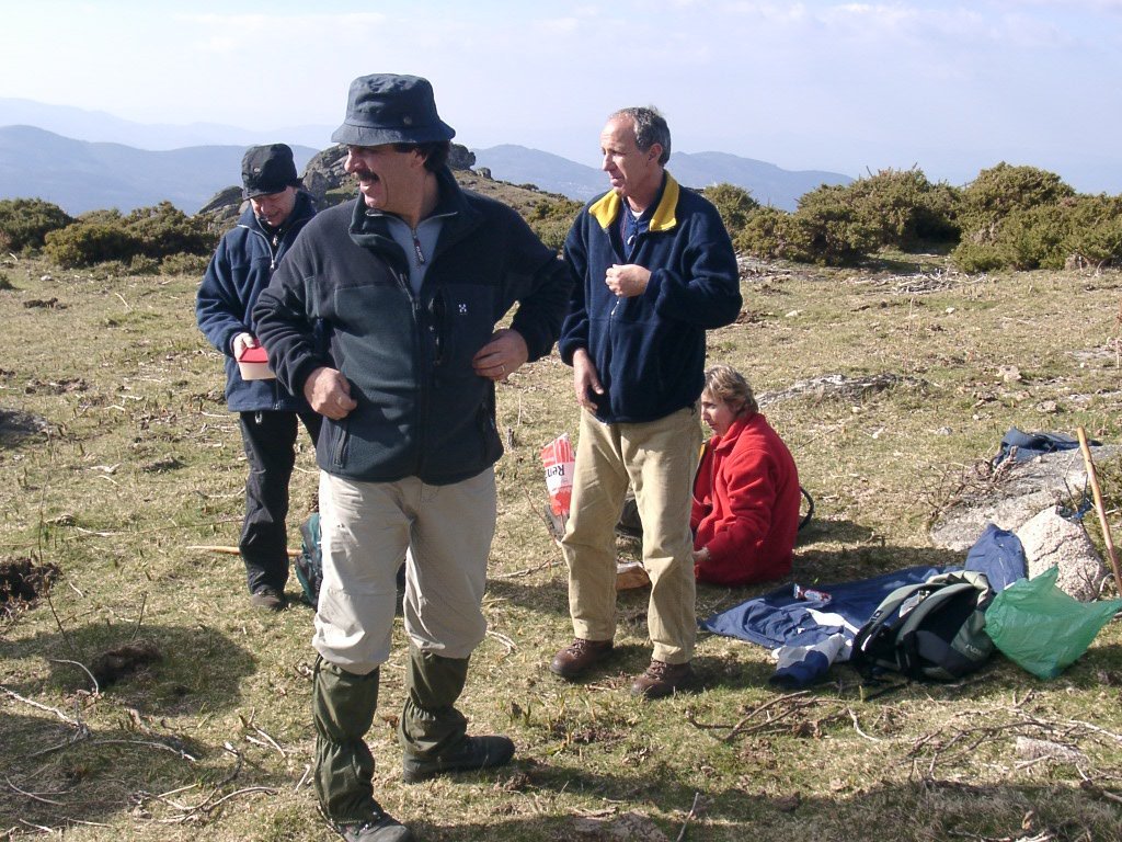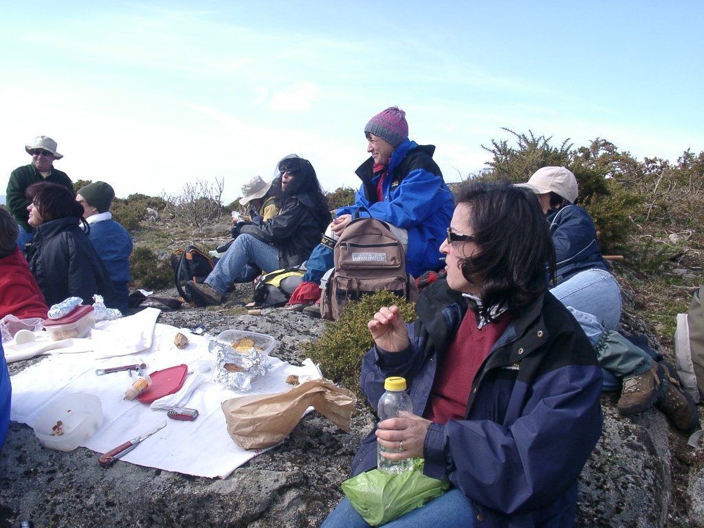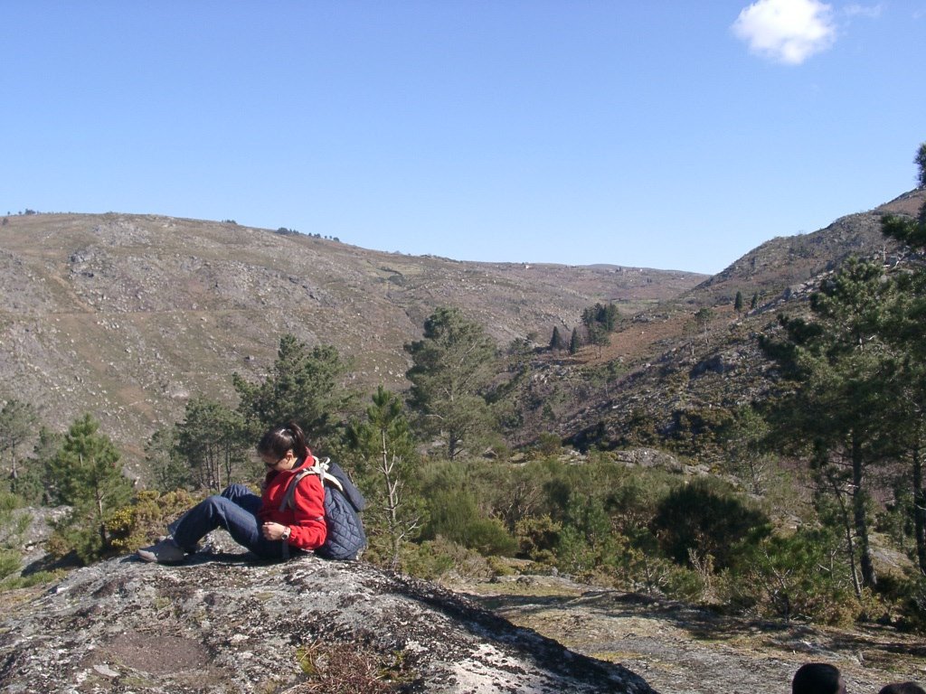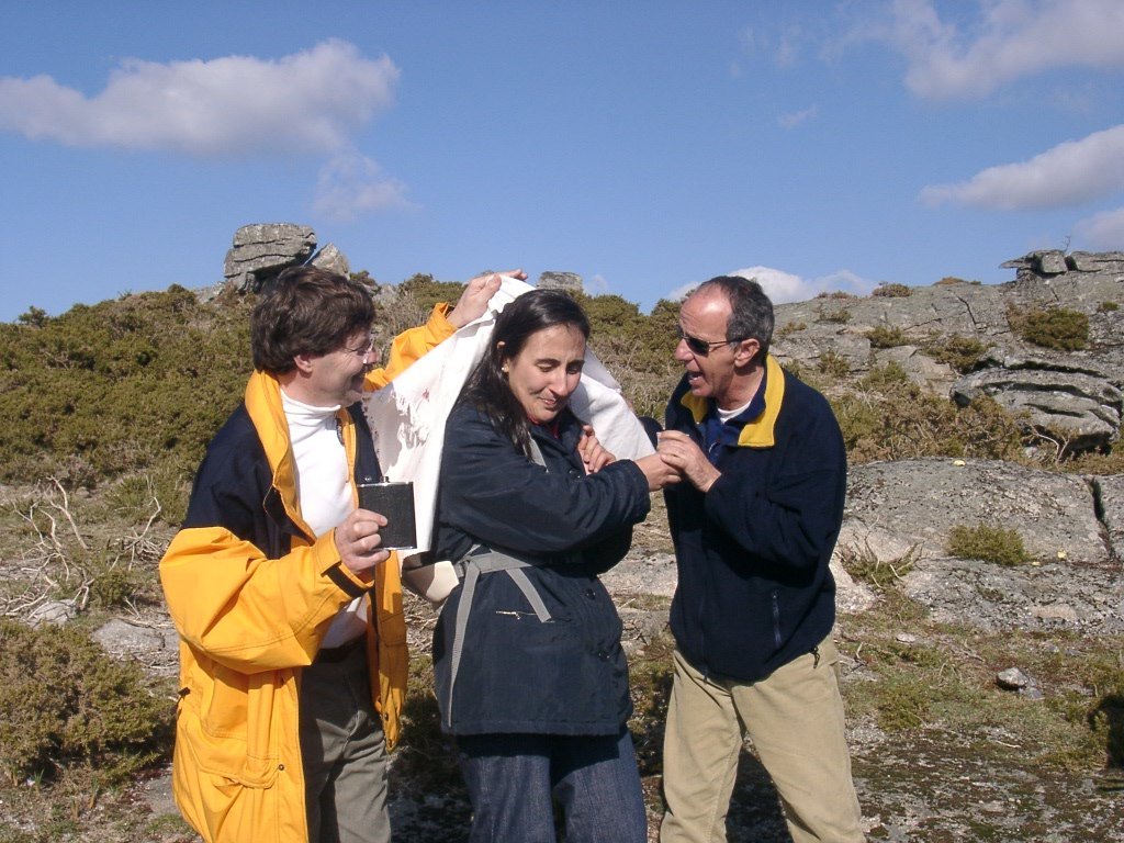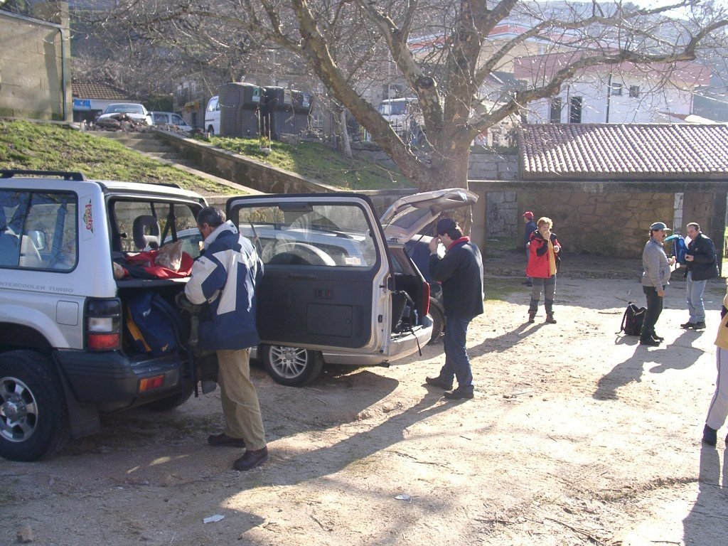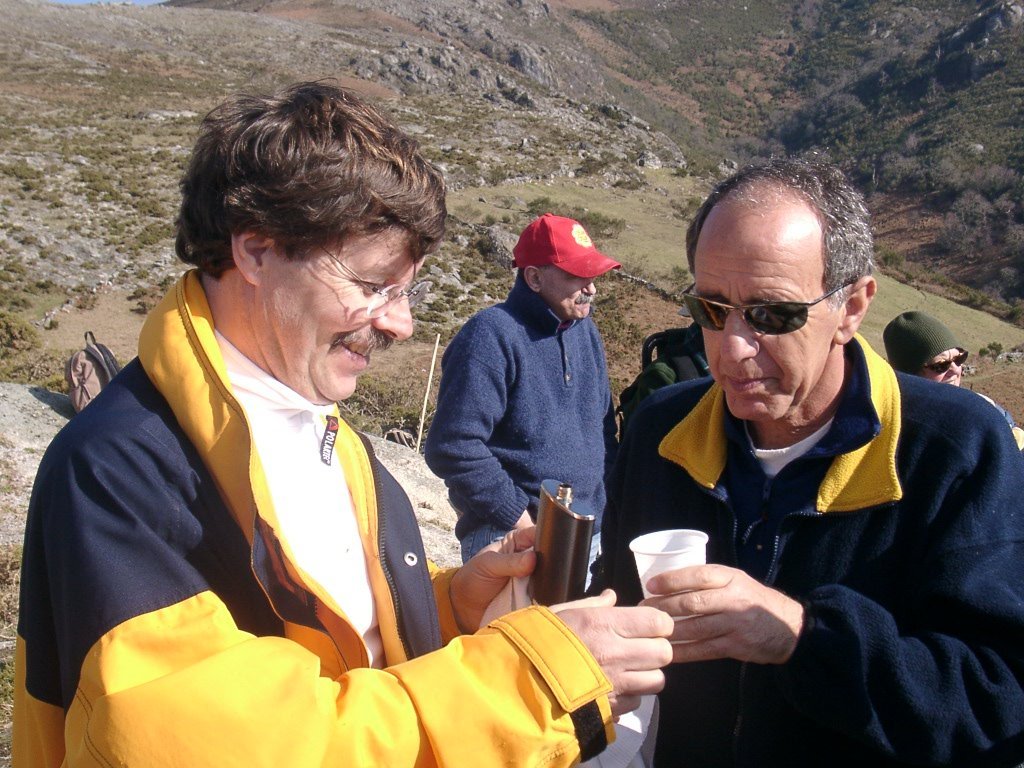 São tiros sim senhor, são dezenas de cães a ladrar, são cornetas a tocar, espanto nosso, ao longo do profundo vale que se estende á nossa frente percebemos que se está realizando uma Montaria ao Javali, com os caçadores colocados nas ”Portas”, locais estratégicos para esperar o animal. È com este cenário que no cimo de um morro, tentando abrigarmo-nos do vento frio e com o “Pedrinho” marco geodésico que assinala o alto da Serra da Peneda, que fazemos o reabastecimento, onde como sempre não faltam saborosas iguarias desencantadas do interior das mochilas, cruzando-se os sabores e com o Simões a mostrar os dotes de enólogo. Chega a hora dos “Baptizados”, o Pimenta e o Vilaça são os padrinhos da sempre solene cerimónia do “Arreum porum, bota abaixarum, Amèm” dos novos caminheiros, Alberto e Sara Leite, António e Isabel Alves, Luís Soares, Carla Freitas, Ivone Rio, Fernando e Sandra Ribeiro.