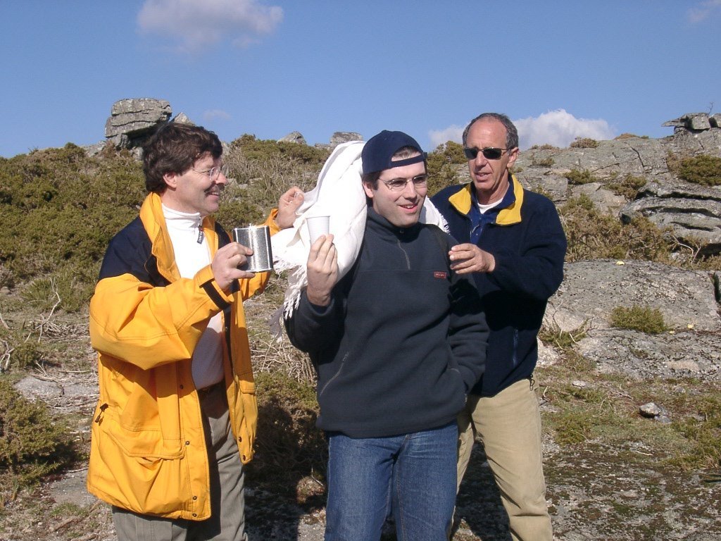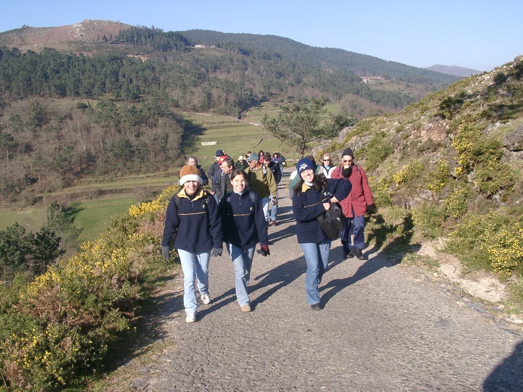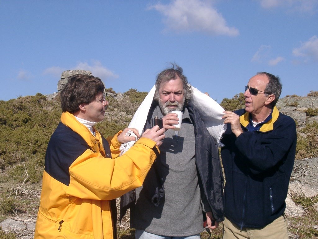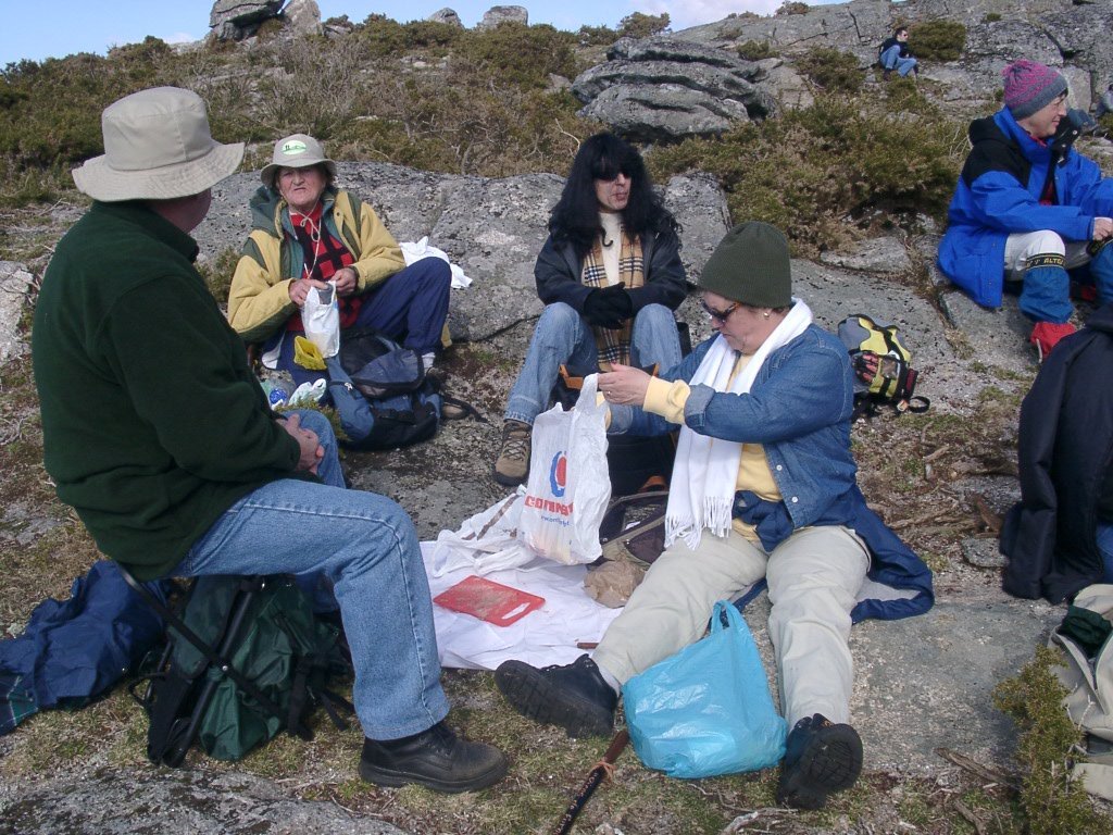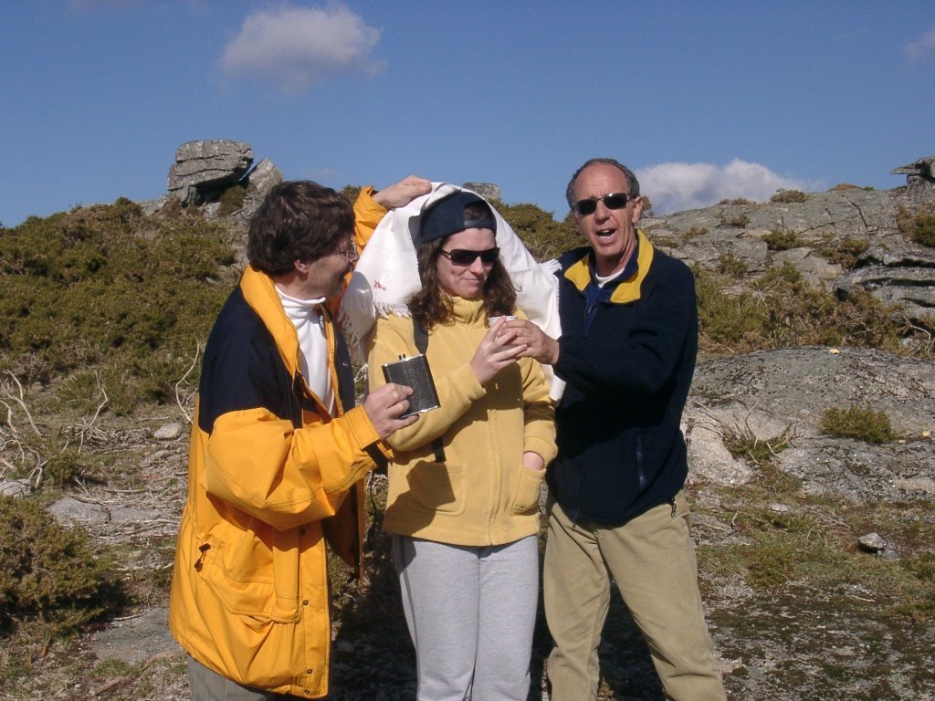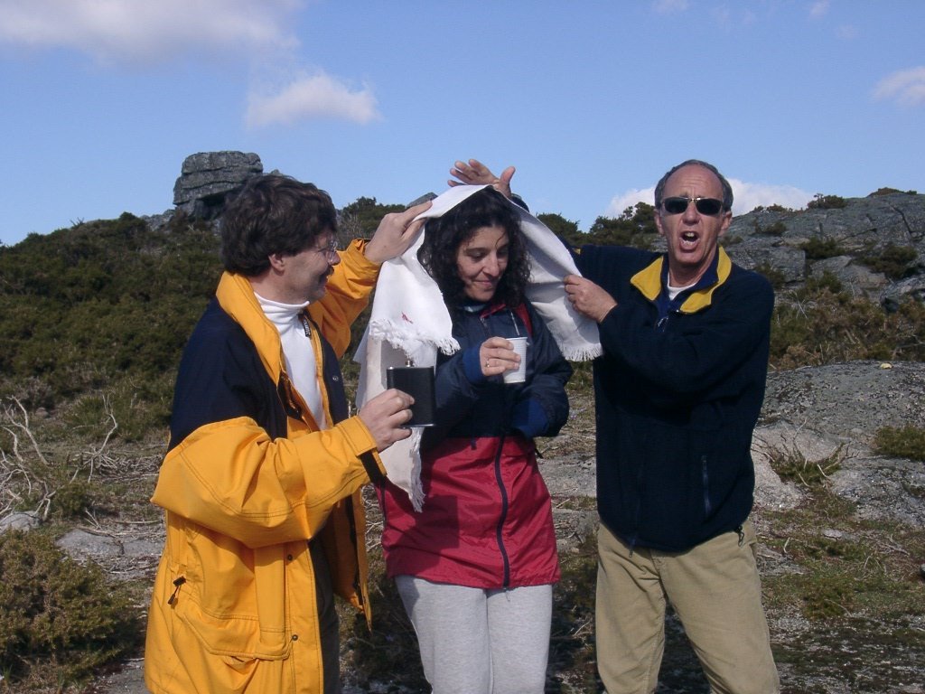São tiros sim senhor, são dezenas de cães a ladrar, são cornetas a tocar, espanto nosso, ao longo do profundo vale que se estende á nossa frente percebemos que se está realizando uma Montaria ao Javali, com os caçadores colocados nas ”Portas”, locais estratégicos para esperar o animal. È com este cenário que no cimo de um morro, tentando abrigarmo-nos do vento frio e com o “Pedrinho” marco geodésico que assinala o alto da Serra da Peneda, que fazemos o reabastecimento, onde como sempre não faltam saborosas iguarias desencantadas do interior das mochilas, cruzando-se os sabores e com o Simões a mostrar os dotes de enólogo. Chega a hora dos “Baptizados”, o Pimenta e o Vilaça são os padrinhos da sempre solene cerimónia do “Arreum porum, bota abaixarum, Amèm” dos novos caminheiros, Alberto e Sara Leite, António e Isabel Alves, Luís Soares, Carla Freitas, Ivone Rio, Fernando e Sandra Ribeiro.