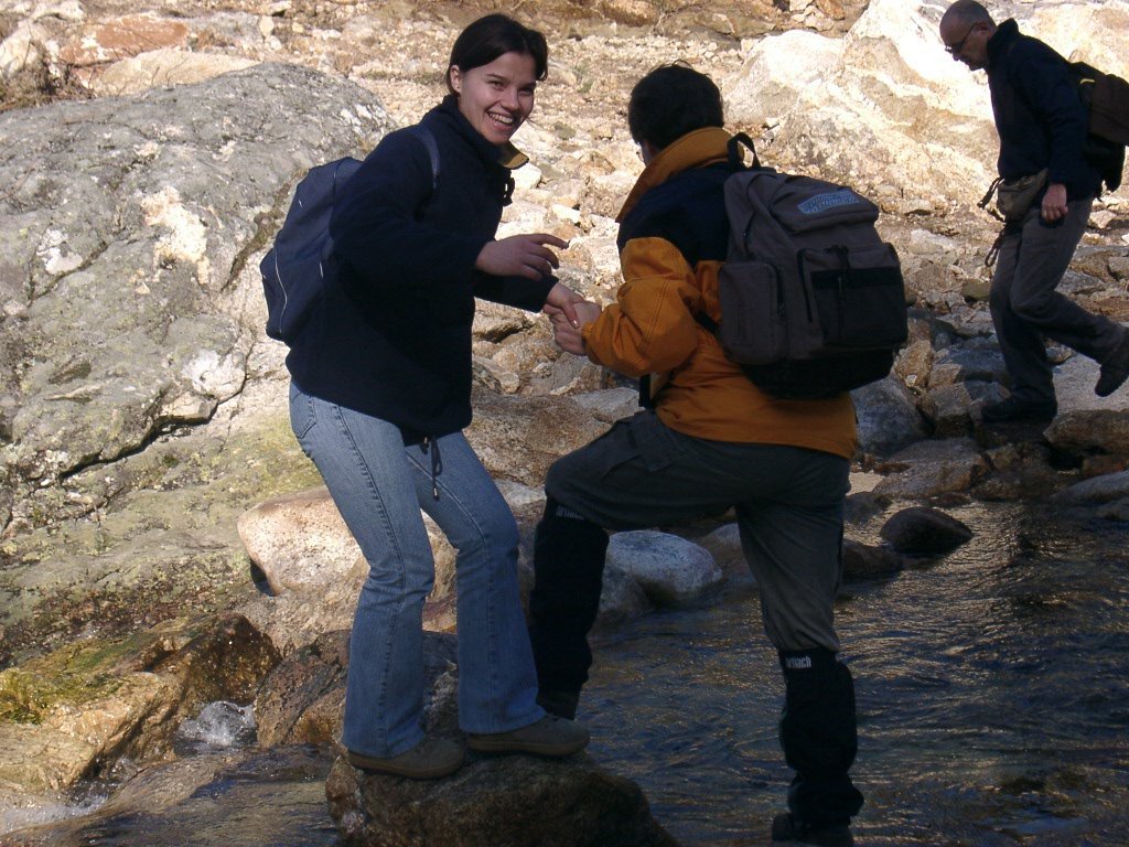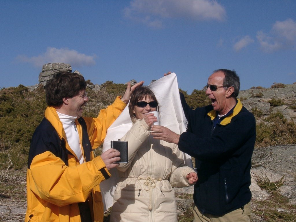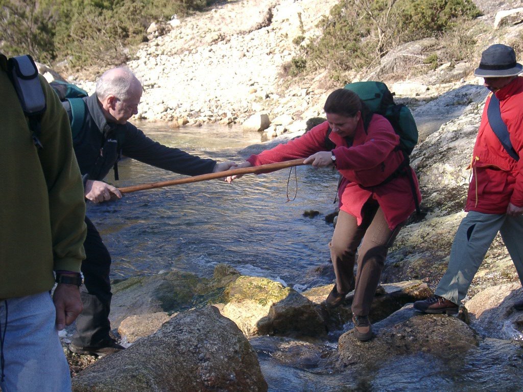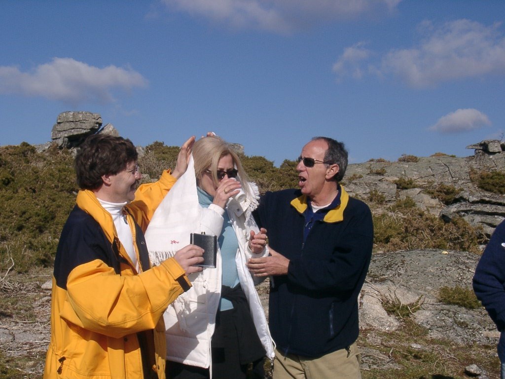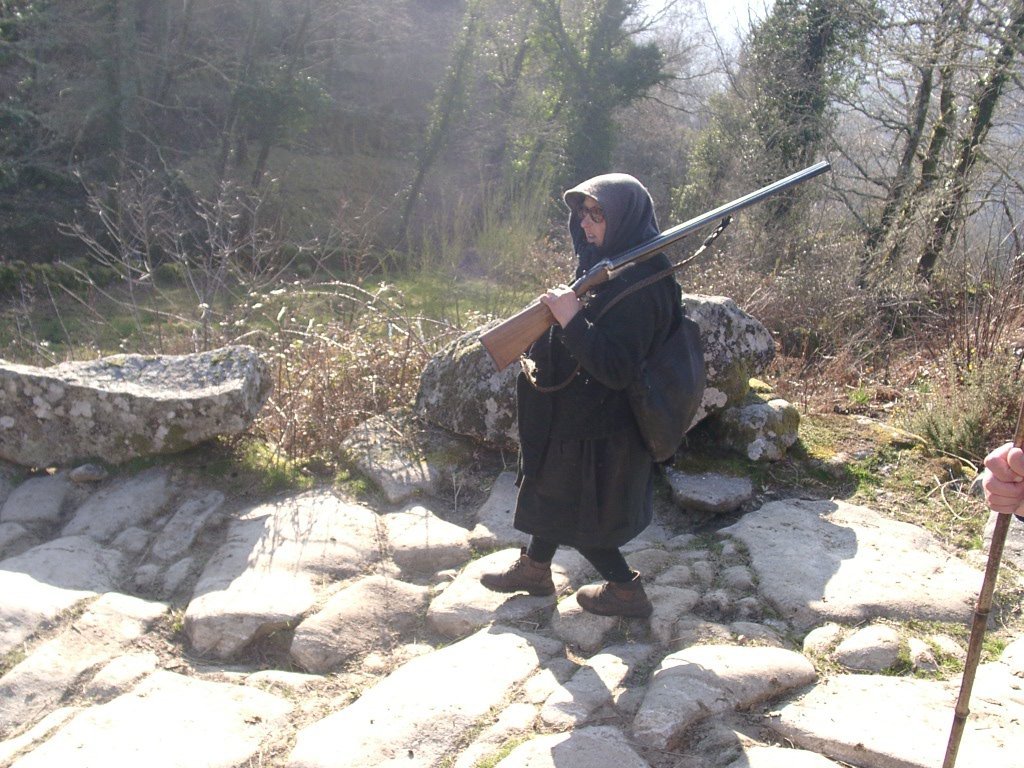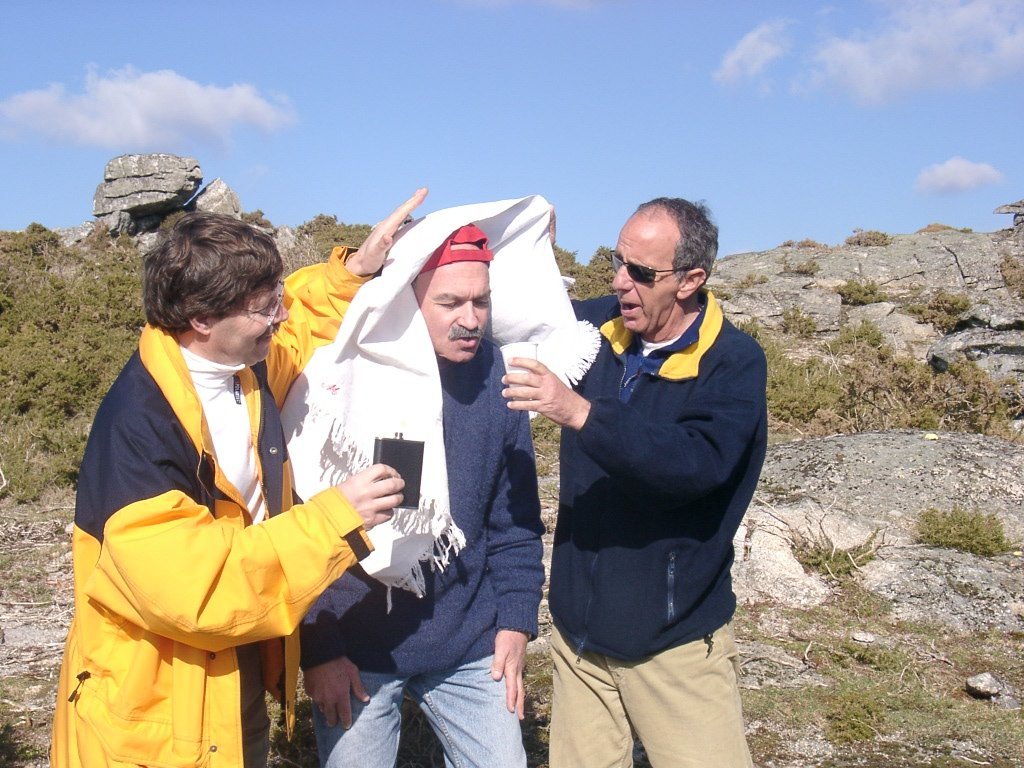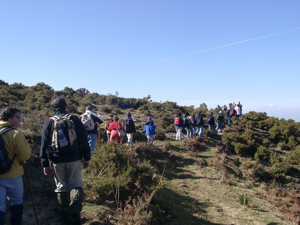 São tiros sim senhor, são dezenas de cães a ladrar, são cornetas a tocar, espanto nosso, ao longo do profundo vale que se estende á nossa frente percebemos que se está realizando uma Montaria ao Javali, com os caçadores colocados nas ”Portas”, locais estratégicos para esperar o animal. È com este cenário que no cimo de um morro, tentando abrigarmo-nos do vento frio e com o “Pedrinho” marco geodésico que assinala o alto da Serra da Peneda, que fazemos o reabastecimento, onde como sempre não faltam saborosas iguarias desencantadas do interior das mochilas, cruzando-se os sabores e com o Simões a mostrar os dotes de enólogo. Chega a hora dos “Baptizados”, o Pimenta e o Vilaça são os padrinhos da sempre solene cerimónia do “Arreum porum, bota abaixarum, Amèm” dos novos caminheiros, Alberto e Sara Leite, António e Isabel Alves, Luís Soares, Carla Freitas, Ivone Rio, Fernando e Sandra Ribeiro.