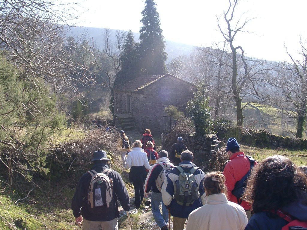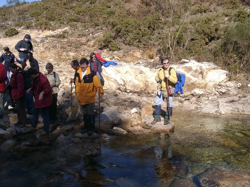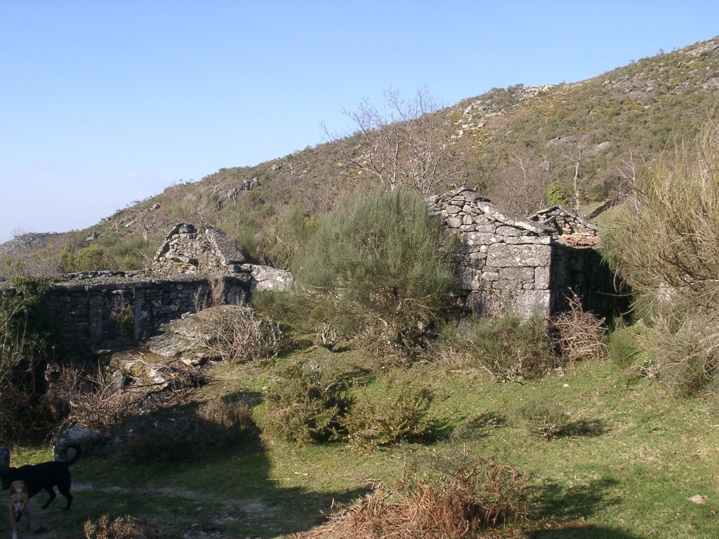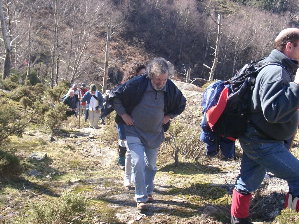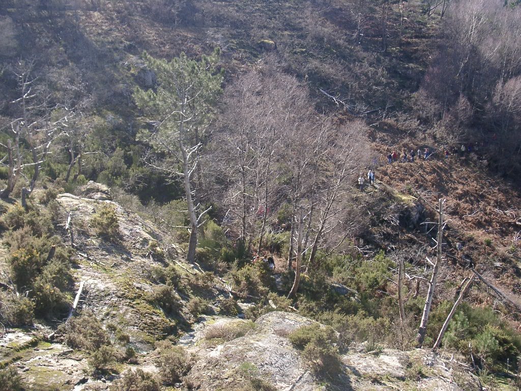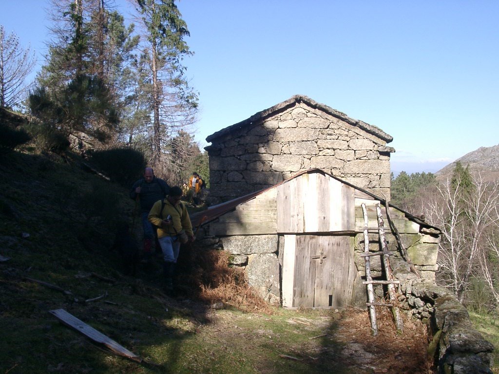 Continuamos subindo, agora envoltos por um denso bosque de pinheiros silvestres e cedros, e logo o azar bate á porta de um colega que mesmo adoentado tenta fazer o percurso, mas em breve e após decisão acertada compreende que este dia não é para si. Faz-se o reagrupamento e logo depois deixamos o estradão florestal para novamente se cruzar o Rio Vez, onde a passagem é sempre alvo das habituais brincadeiras. Entramos agora numa grande mancha arbórea, ziguezagueando, e á nossa esquerda na encosta contrária do rio vemos a antiga Branda de Arieiro com as suas cardenhas. As brandas constituem formas de ocupação humana adaptadas às necessárias movimentações dos rebanhos em busca de melhores àreas de pastoreio. A sua utilização é sobretudo estival, quando na próximidade da aldeia os campos estão cultivados. Existem Brandas de gado (que não teem campos de cultivo) com pitorescos abrigos de planta circular, hoje muito pouco utilizados. Alguns só com um piso, serviam apenas para abrigar animais. Noutros há um piso superior onde o pastor acendia uma fogueira nos dias mais frios e se abrigava do mau tempo. As paredes destes abrigos são constituidas por simples sobreposição de pedras de tal forma dispostas que formam uma falsa cúpula, usando apenas o granito, abundante no local, e que preservam toda a sua genuidade.