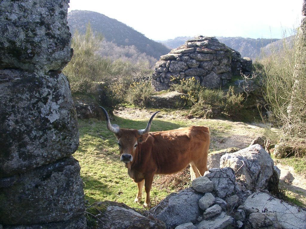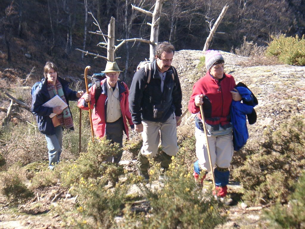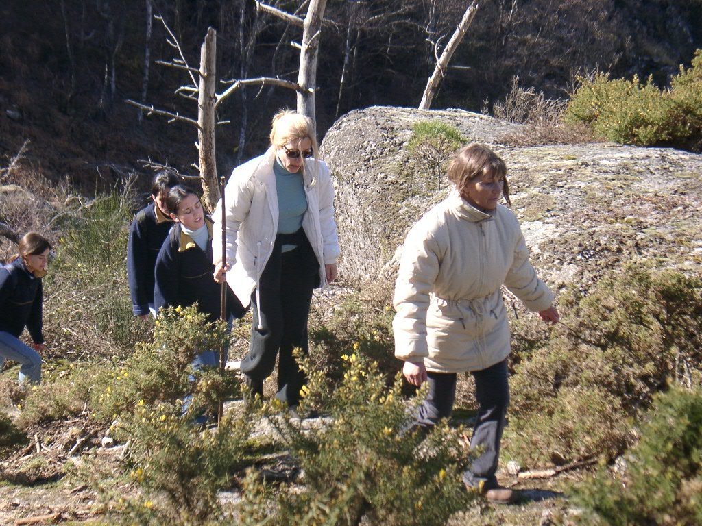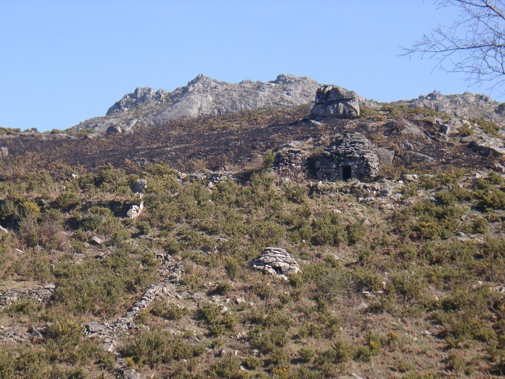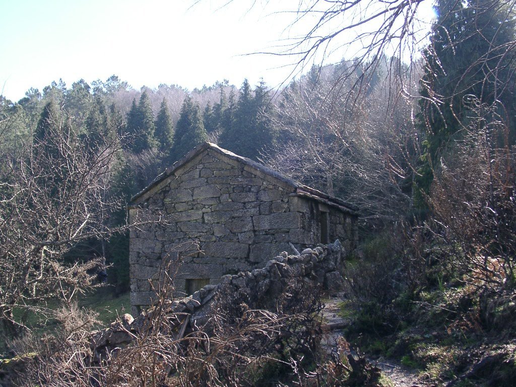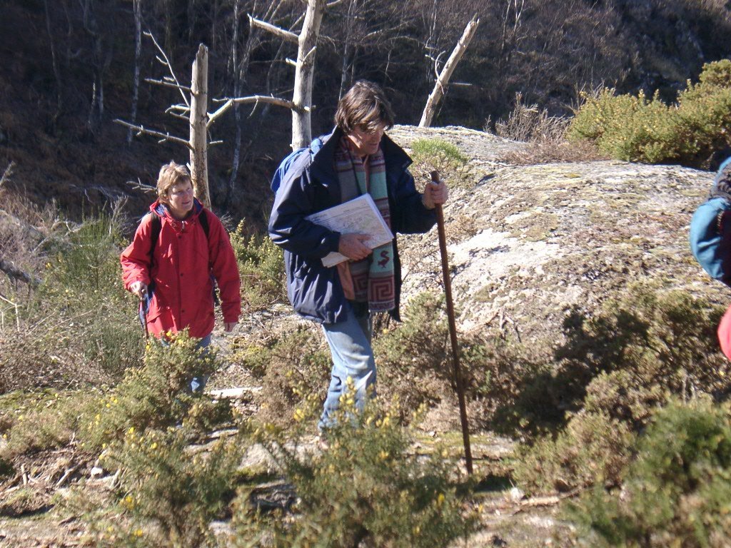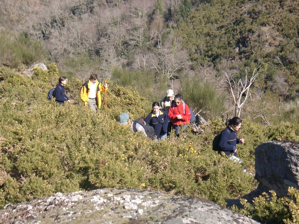 Continuamos subindo, agora envoltos por um denso bosque de pinheiros silvestres e cedros, e logo o azar bate á porta de um colega que mesmo adoentado tenta fazer o percurso, mas em breve e após decisão acertada compreende que este dia não é para si. Faz-se o reagrupamento e logo depois deixamos o estradão florestal para novamente se cruzar o Rio Vez, onde a passagem é sempre alvo das habituais brincadeiras. Entramos agora numa grande mancha arbórea, ziguezagueando, e á nossa esquerda na encosta contrária do rio vemos a antiga Branda de Arieiro com as suas cardenhas. As brandas constituem formas de ocupação humana adaptadas às necessárias movimentações dos rebanhos em busca de melhores àreas de pastoreio. A sua utilização é sobretudo estival, quando na próximidade da aldeia os campos estão cultivados. Existem Brandas de gado (que não teem campos de cultivo) com pitorescos abrigos de planta circular, hoje muito pouco utilizados. Alguns só com um piso, serviam apenas para abrigar animais. Noutros há um piso superior onde o pastor acendia uma fogueira nos dias mais frios e se abrigava do mau tempo. As paredes destes abrigos são constituidas por simples sobreposição de pedras de tal forma dispostas que formam uma falsa cúpula, usando apenas o granito, abundante no local, e que preservam toda a sua genuidade.