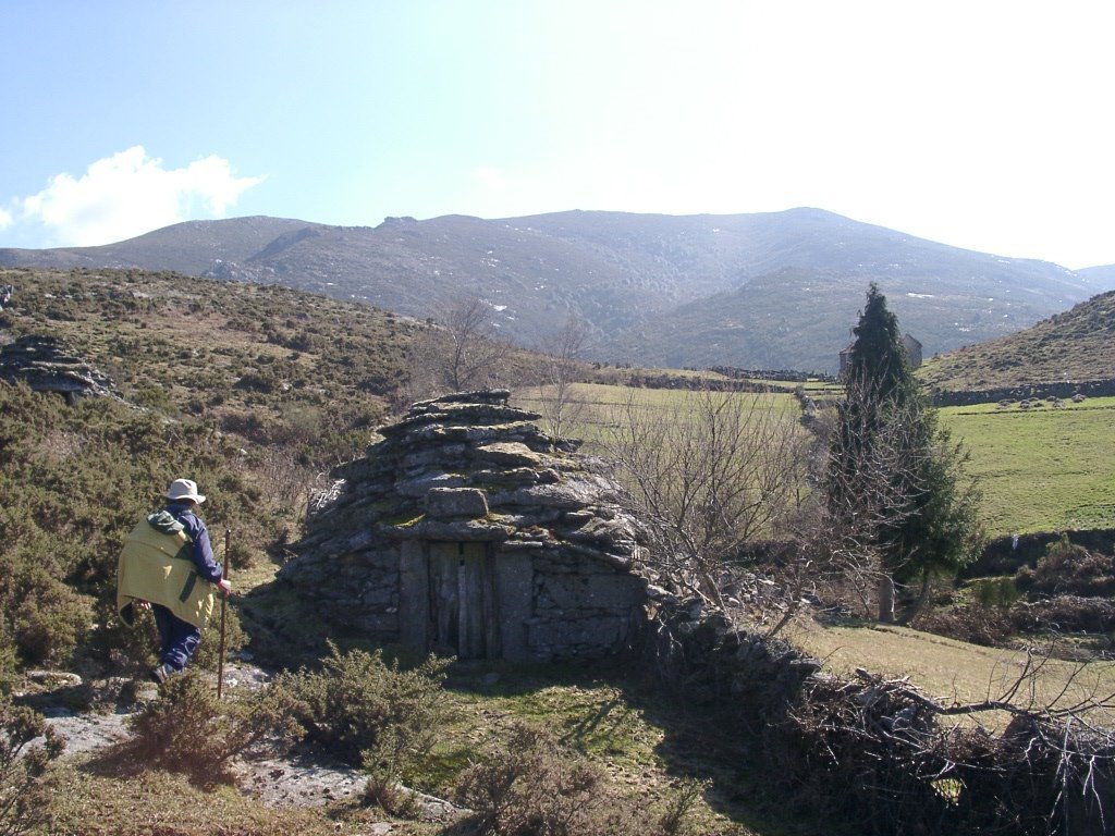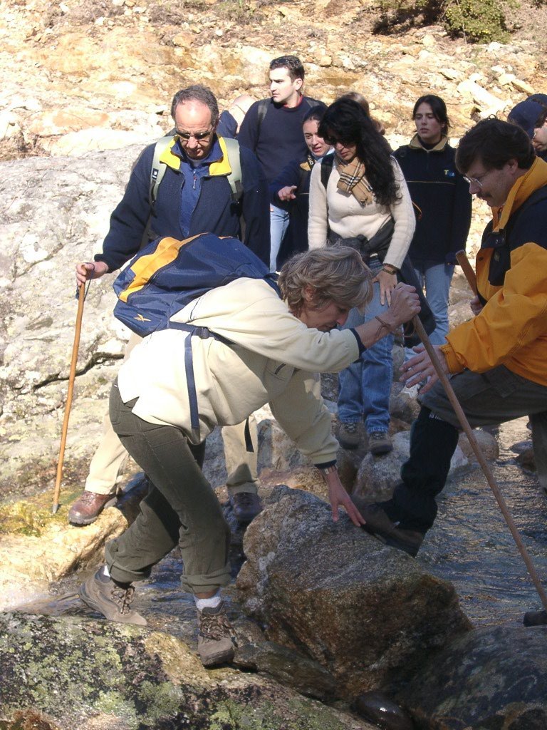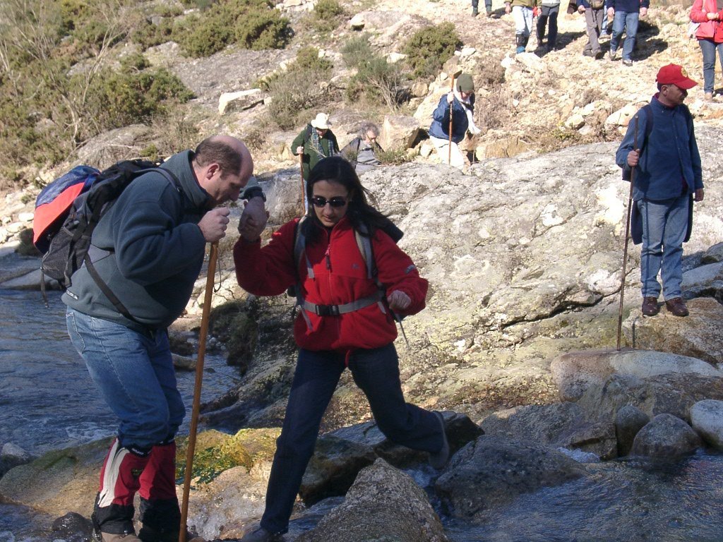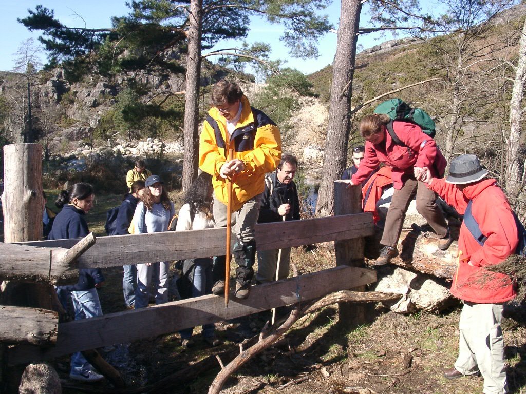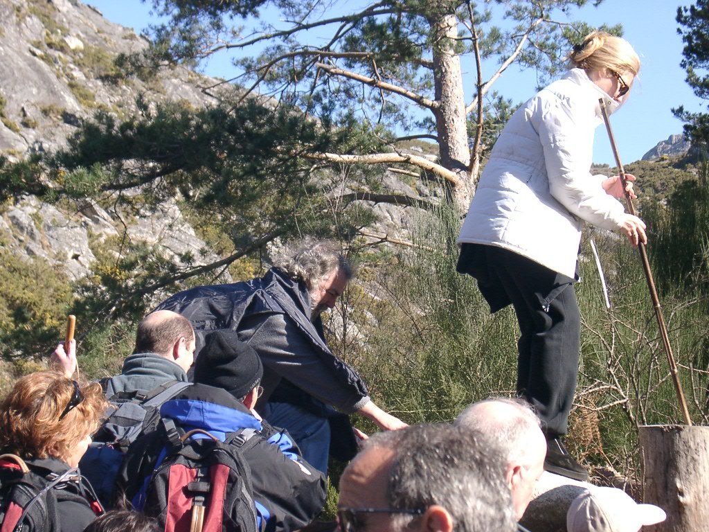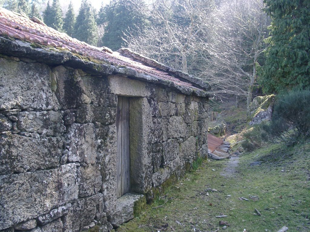 Continuamos subindo, agora envoltos por um denso bosque de pinheiros silvestres e cedros, e logo o azar bate á porta de um colega que mesmo adoentado tenta fazer o percurso, mas em breve e após decisão acertada compreende que este dia não é para si. Faz-se o reagrupamento e logo depois deixamos o estradão florestal para novamente se cruzar o Rio Vez, onde a passagem é sempre alvo das habituais brincadeiras. Entramos agora numa grande mancha arbórea, ziguezagueando, e á nossa esquerda na encosta contrária do rio vemos a antiga Branda de Arieiro com as suas cardenhas. As brandas constituem formas de ocupação humana adaptadas às necessárias movimentações dos rebanhos em busca de melhores àreas de pastoreio. A sua utilização é sobretudo estival, quando na próximidade da aldeia os campos estão cultivados. Existem Brandas de gado (que não teem campos de cultivo) com pitorescos abrigos de planta circular, hoje muito pouco utilizados. Alguns só com um piso, serviam apenas para abrigar animais. Noutros há um piso superior onde o pastor acendia uma fogueira nos dias mais frios e se abrigava do mau tempo. As paredes destes abrigos são constituidas por simples sobreposição de pedras de tal forma dispostas que formam uma falsa cúpula, usando apenas o granito, abundante no local, e que preservam toda a sua genuidade.