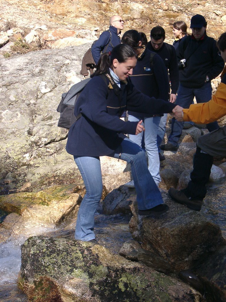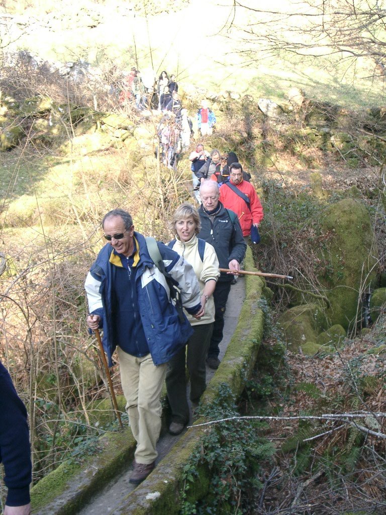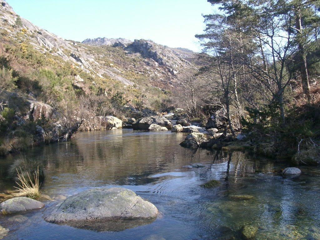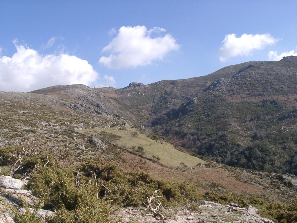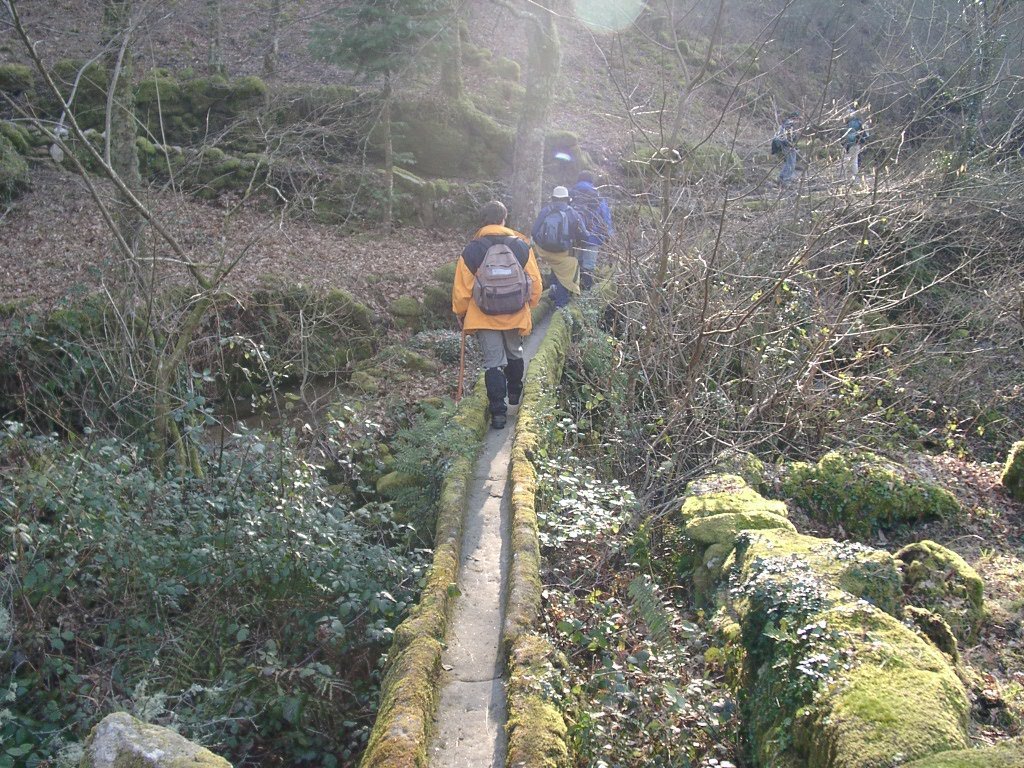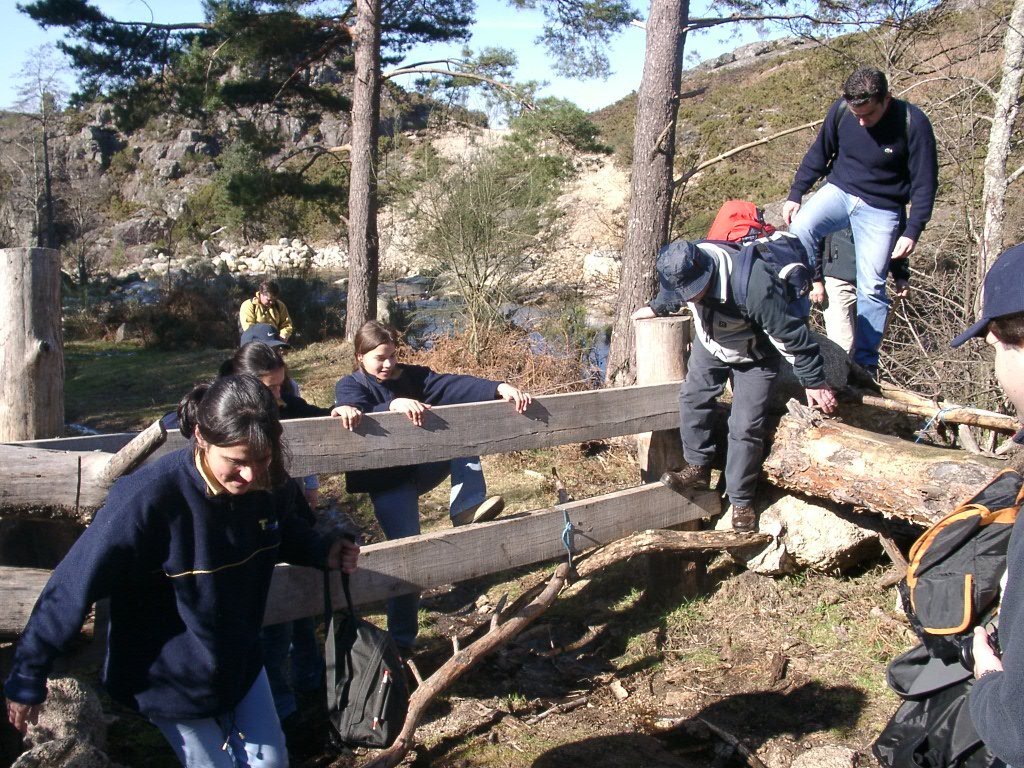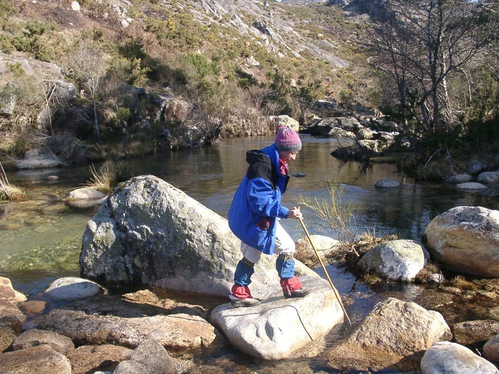 Continuamos subindo, agora envoltos por um denso bosque de pinheiros silvestres e cedros, e logo o azar bate á porta de um colega que mesmo adoentado tenta fazer o percurso, mas em breve e após decisão acertada compreende que este dia não é para si. Faz-se o reagrupamento e logo depois deixamos o estradão florestal para novamente se cruzar o Rio Vez, onde a passagem é sempre alvo das habituais brincadeiras. Entramos agora numa grande mancha arbórea, ziguezagueando, e á nossa esquerda na encosta contrária do rio vemos a antiga Branda de Arieiro com as suas cardenhas. As brandas constituem formas de ocupação humana adaptadas às necessárias movimentações dos rebanhos em busca de melhores àreas de pastoreio. A sua utilização é sobretudo estival, quando na próximidade da aldeia os campos estão cultivados. Existem Brandas de gado (que não teem campos de cultivo) com pitorescos abrigos de planta circular, hoje muito pouco utilizados. Alguns só com um piso, serviam apenas para abrigar animais. Noutros há um piso superior onde o pastor acendia uma fogueira nos dias mais frios e se abrigava do mau tempo. As paredes destes abrigos são constituidas por simples sobreposição de pedras de tal forma dispostas que formam uma falsa cúpula, usando apenas o granito, abundante no local, e que preservam toda a sua genuidade.
