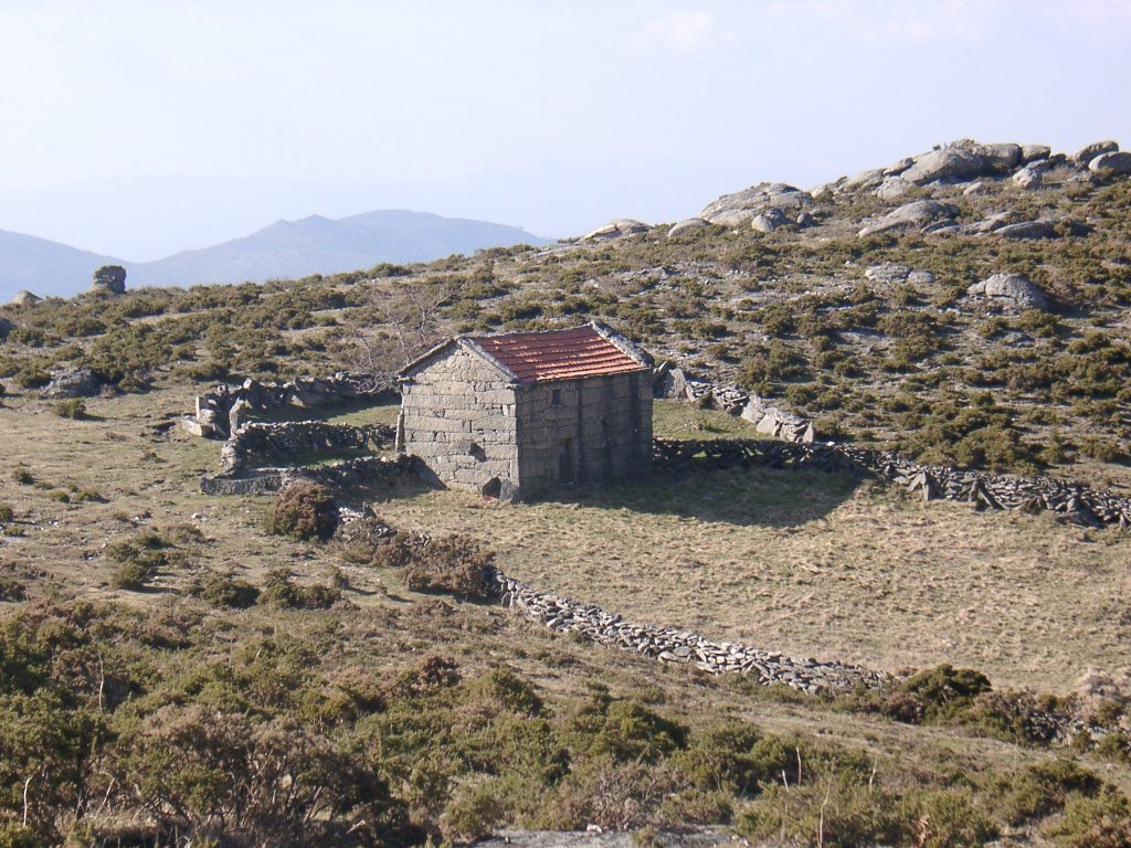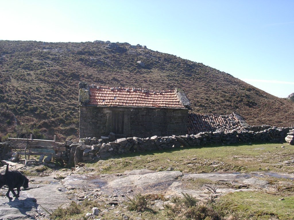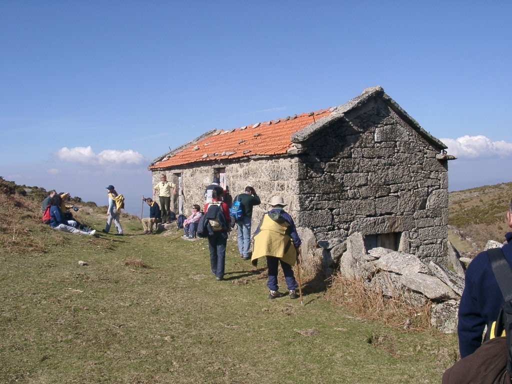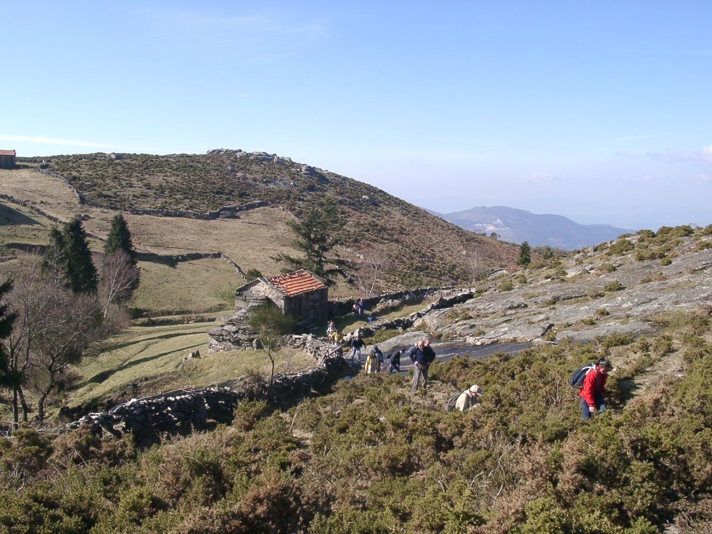 Continuamos em fila indiana pois o estreito trilho só assim o permite, e lá mais para cima começamos a avistar a branda da Aveleira, é altura de nos despedirmos dos holandeses, com um até breve. A partir daqui é a céu aberto sem carreiro, subindo ao longo de uma encosta de granito, para depois apanhar nova calçada. Já começa a ser horas de reabastecimento mas ainda falta mais um pouco, anima-se o grupo, ao longe já se avista o nosso destino, e após cruzarmos antigos campos de cultivo a meia encosta, chegamos à Branda de Porta Cuco.