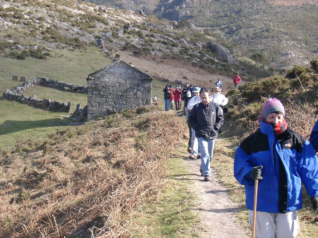 O grupo estende-se agora através do bosque, e espanto nosso, encontramos dois caminheiros e uma caminheira, holandeses, um pouco perdidos, fazendo o reconhecimento de uma futura marcha que ligará Castro Laboreiro/Moledo do Minho, confraterniza-se cruzam-se informações e resolvem seguir-nos para chegar á Branda da Aveleira. Continuamos sempre sobre o bosque, passando por uma antiga habitação situada junto a um bonito lameiro murado, local onde é ocasião para um pequeno descanso e reabastecimento. Os Lameiros ou Prados de lima, são prados semi-naturais para o pastoreio do gado bovino e produção de feno. Situam-se em parcelas de terreno mais inclinadas, algumas vezes com declives muito acentuados. Uma continua pelicula de água corrente, alimentada por bocas distanciadas entre si de cerca de meio metro, funciona como protecção eficaz contra as geadas invernais e primaveris.