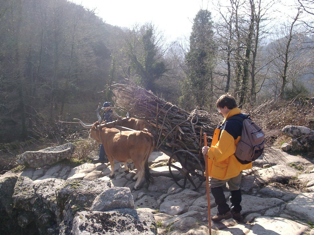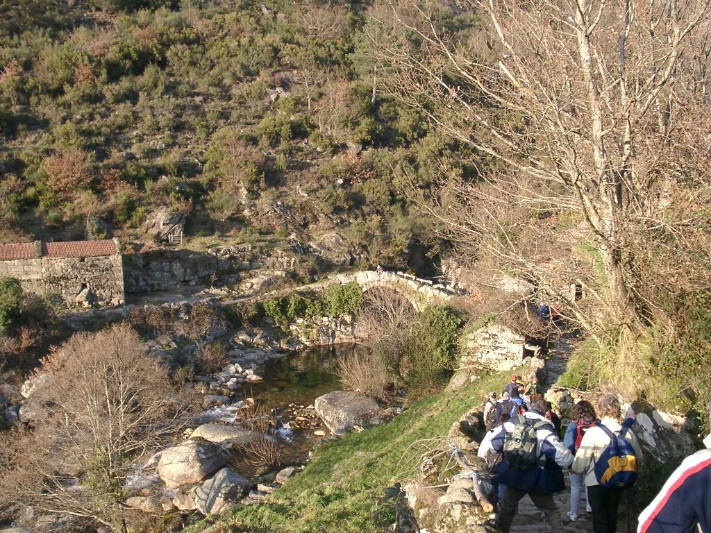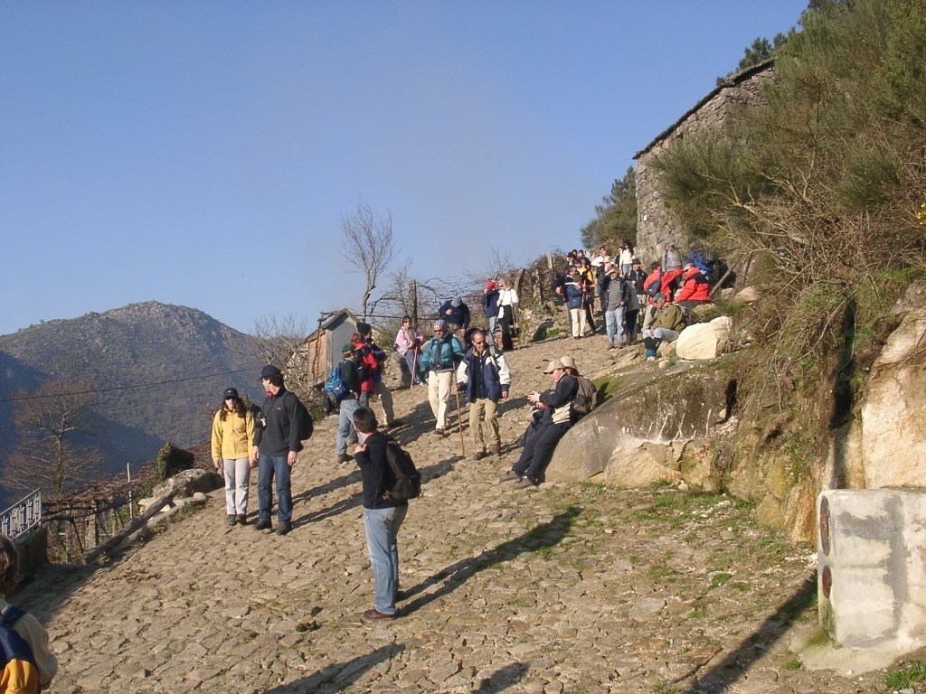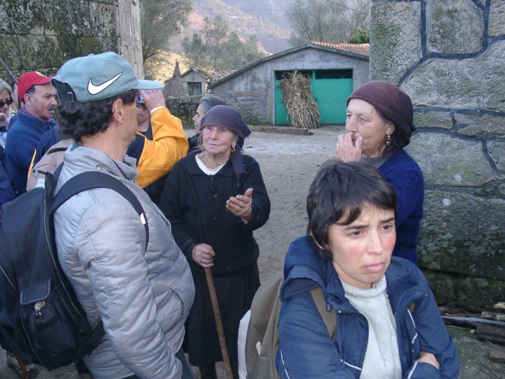Feito o descanso, continuamos a descida agora através da antiga calçada de acesso á Branda, no caminho encontramos um curioso casal conduzindo um carro de bois carregado com mato descendo a íngreme calçada, chiando sobre o eixo talvez de oliveira, e com a mulher carregando ao ombro a arma de caça. Trocam-se palavras e acompanhamo-los até ao pequeno povoado de Porta Cova onde no seu interior se conversa com os naturais. A vontade de ficar mais um pouco é grande mas o sol já vai descendo ao longo das encostas da serra, descemos ao fundo do vale para atravessar o rio Vez sobre uma antiga e bonita ponte romana, onde é feita a foto do grupo. Já é tarde avançada, vamos agora subindo o trilho através de uma calçada que nos conduz até Paçô do Monte, e onde mais uma vez se aguça a curiosidade conversando com os populares. Olhamos mais uma vez para trás e a vista é impressionante perdendo-se nos socalcos das encostas com os lugares da Porta Cova e Padrão lá colocados como um presépio vivo, onde até ao alto se estende toda a encosta da serra da Peneda.