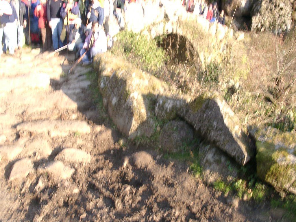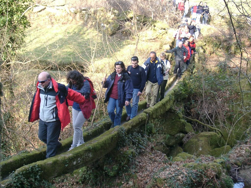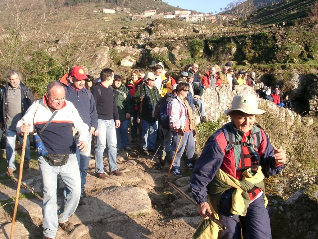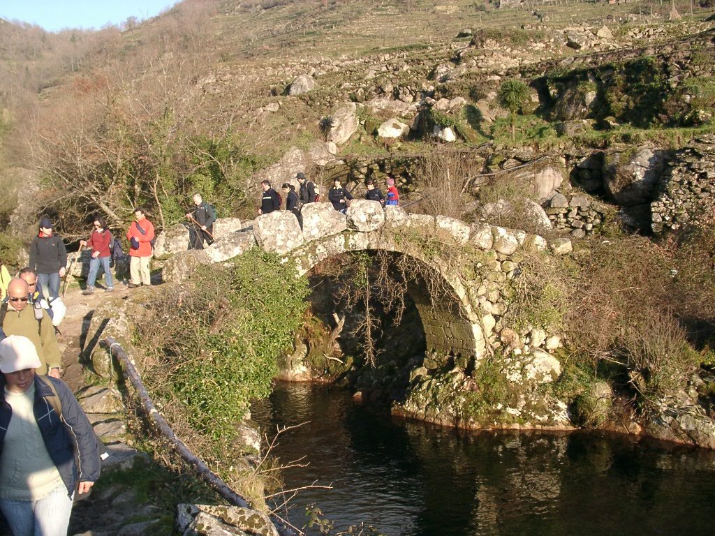 Feito o descanso, continuamos a descida agora através da antiga calçada de acesso á Branda, no caminho encontramos um curioso casal conduzindo um carro de bois carregado com mato descendo a íngreme calçada, chiando sobre o eixo talvez de oliveira, e com a mulher carregando ao ombro a arma de caça. Trocam-se palavras e acompanhamo-los até ao pequeno povoado de Porta Cova onde no seu interior se conversa com os naturais. A vontade de ficar mais um pouco é grande mas o sol já vai descendo ao longo das encostas da serra, descemos ao fundo do vale para atravessar o rio Vez sobre uma antiga e bonita ponte romana, onde é feita a foto do grupo. Já é tarde avançada, vamos agora subindo o trilho através de uma calçada que nos conduz até Paçô do Monte, e onde mais uma vez se aguça a curiosidade conversando com os populares. Olhamos mais uma vez para trás e a vista é impressionante perdendo-se nos socalcos das encostas com os lugares da Porta Cova e Padrão lá colocados como um presépio vivo, onde até ao alto se estende toda a encosta da serra da Peneda.