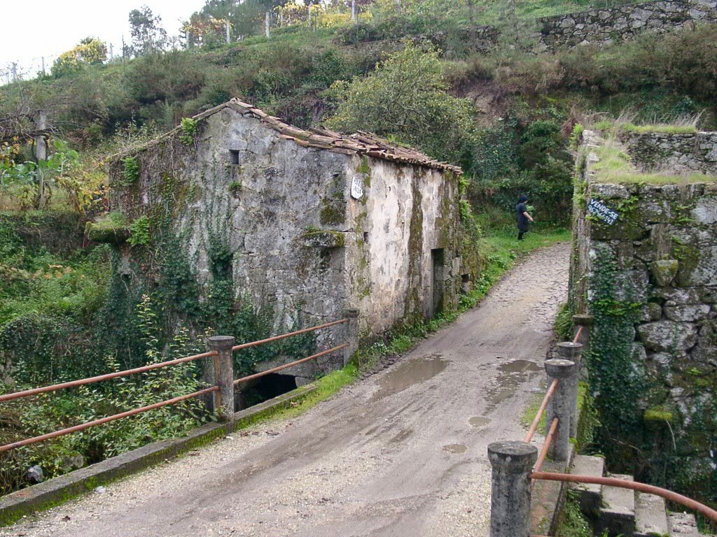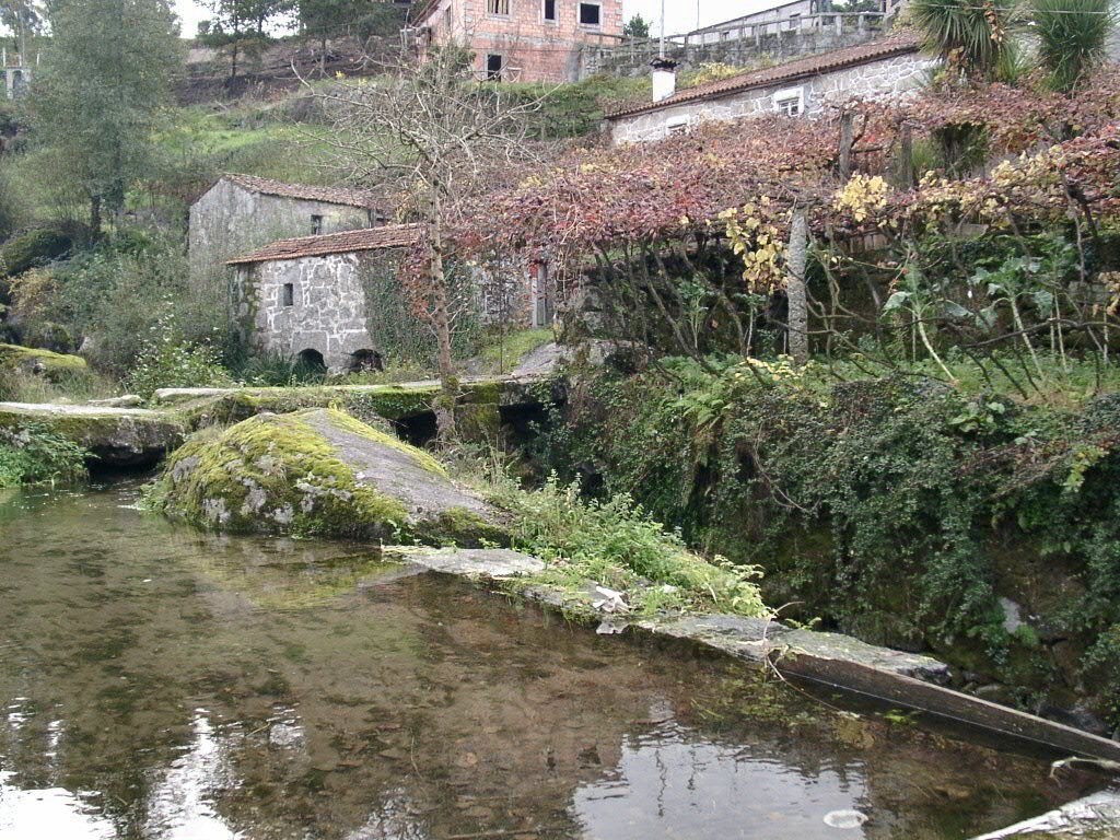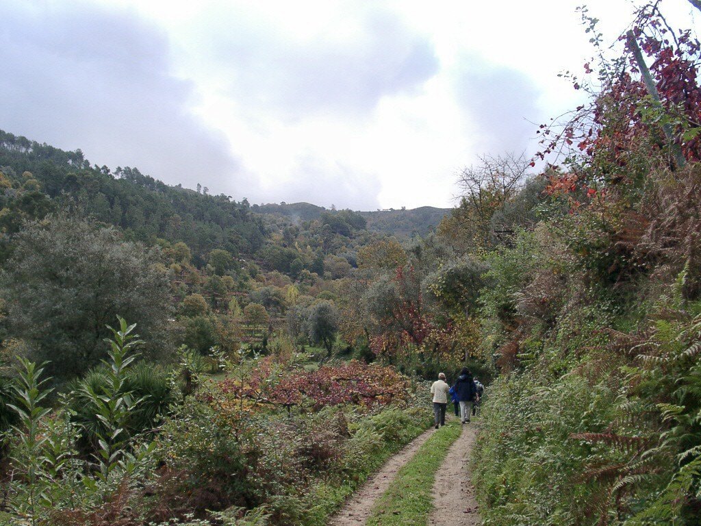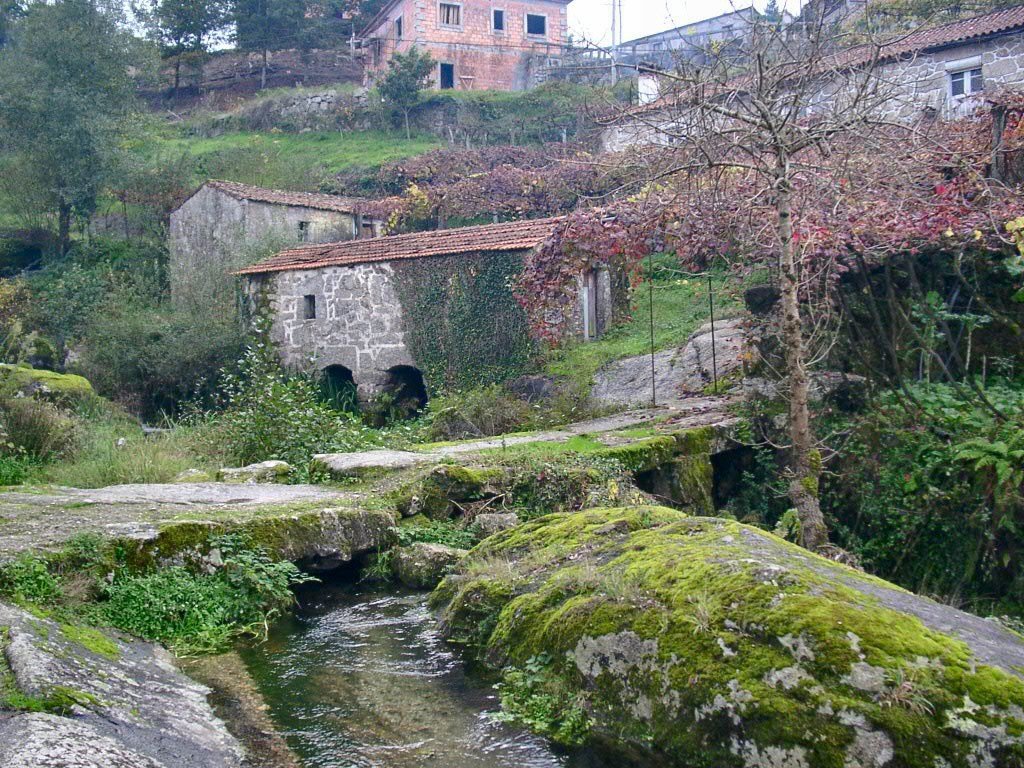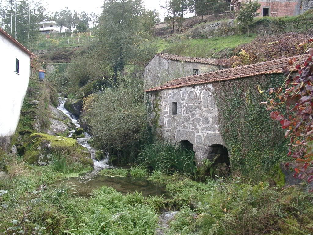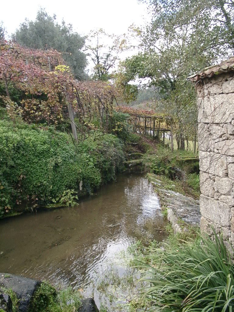 Cruzamos a estrada nacional 203 e fomos subindo, através de campos de cultivo, até atingir um ribeiro, que seguimos passando junto a vários moinhos.
