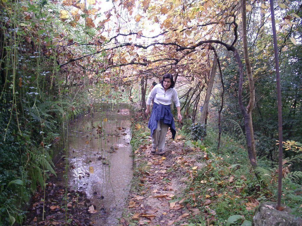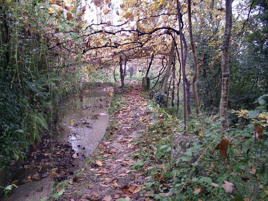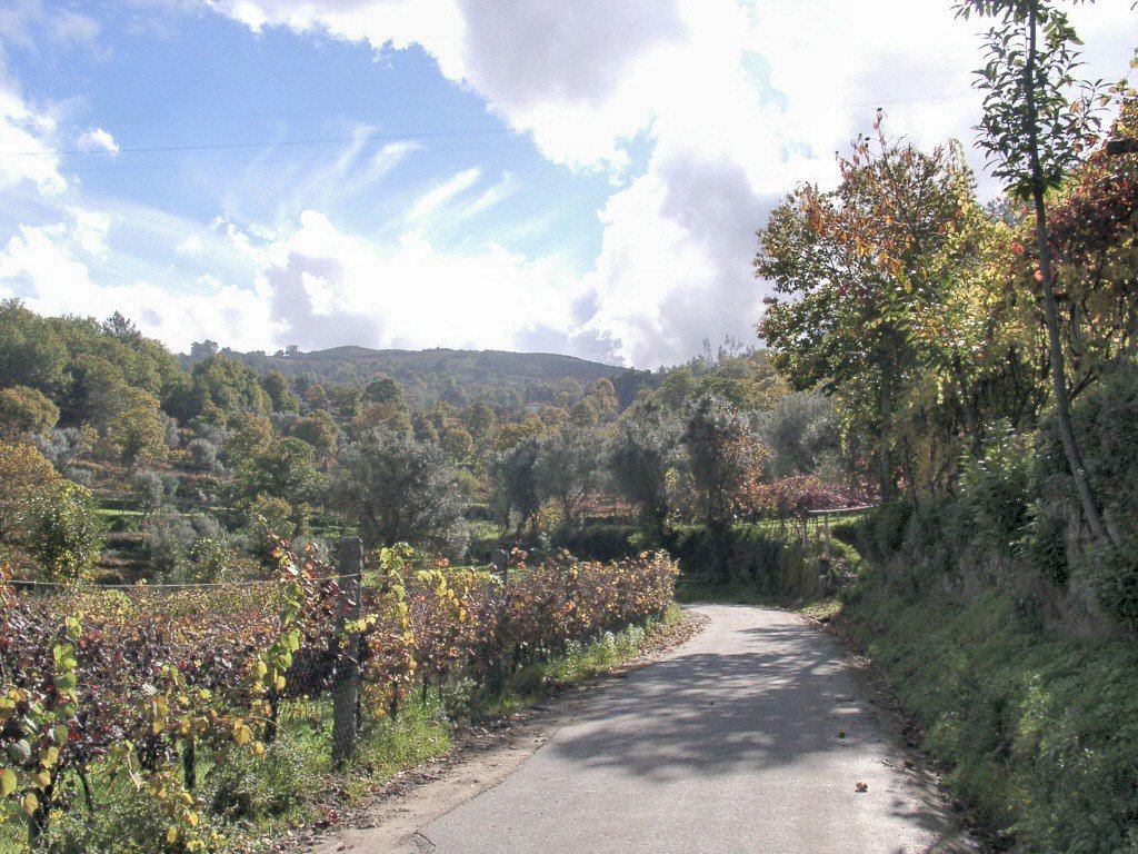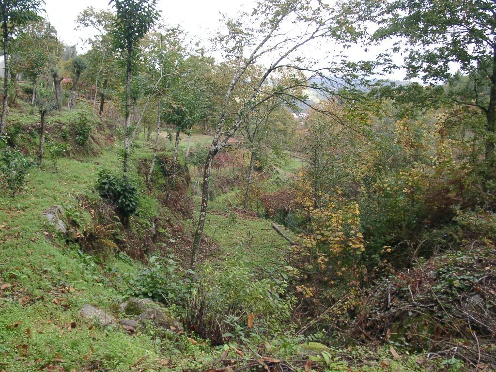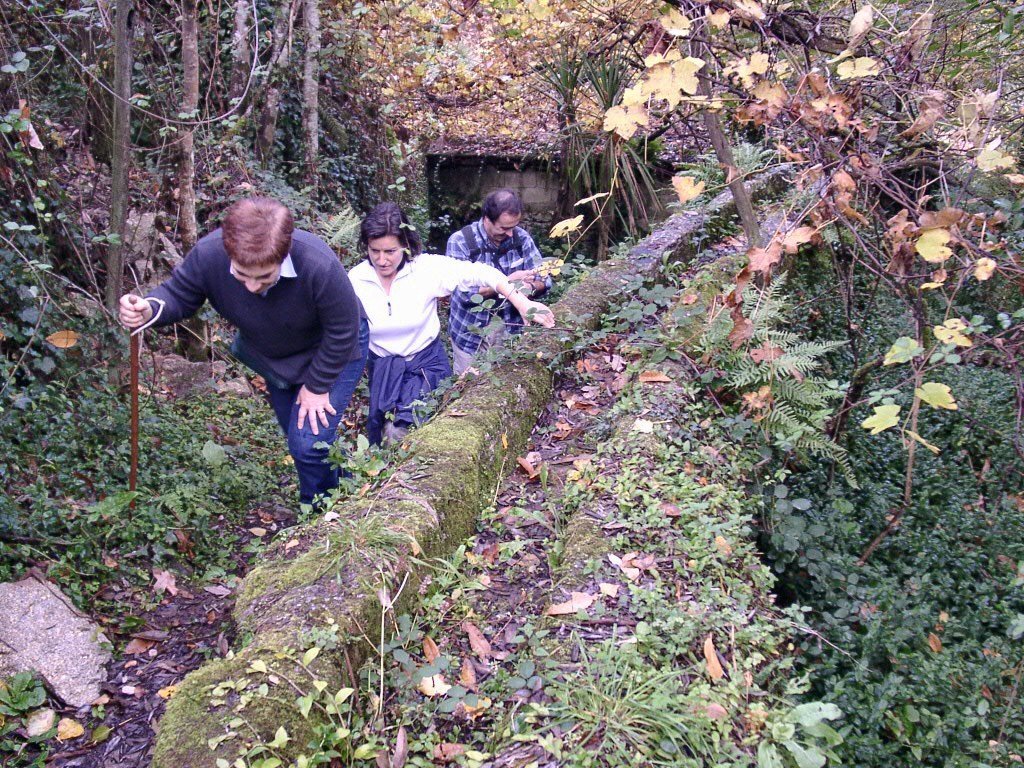 Cruzamos a estrada nacional 203 e fomos subindo, através de campos de cultivo, até atingir um ribeiro, que seguimos passando junto a vários moinhos.