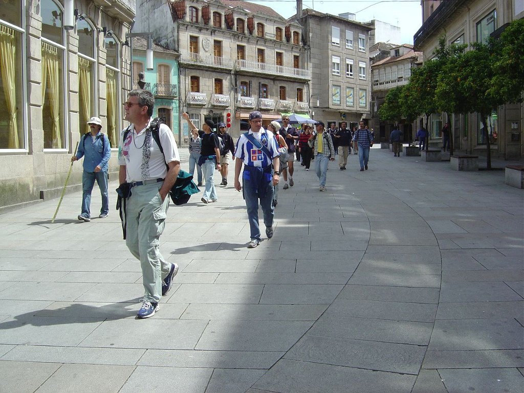Gorados os esforços de carimbar os passaportes, recomeçamos a marcha do Caminho Português pela rua Soportales, deixando para trás a brasonada Praça de Teucro e seguimos pela rua Real atravessando a Ponte de O Burgo.