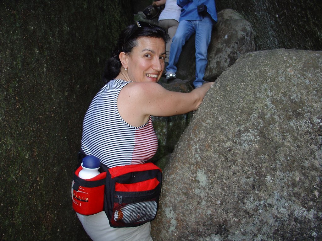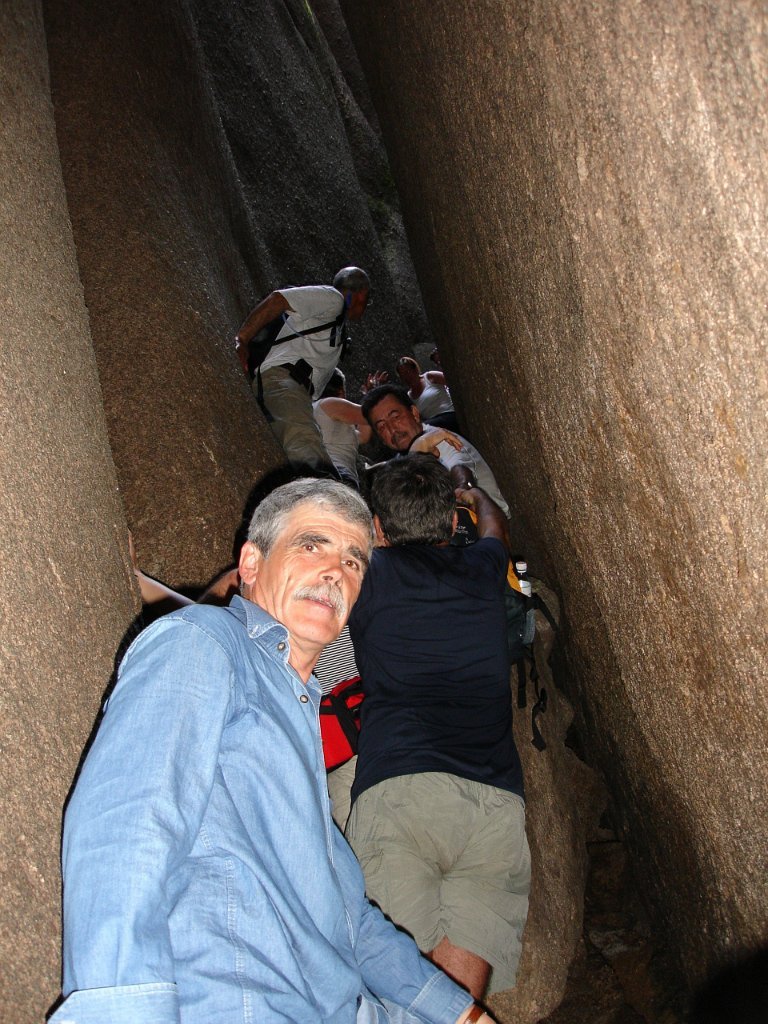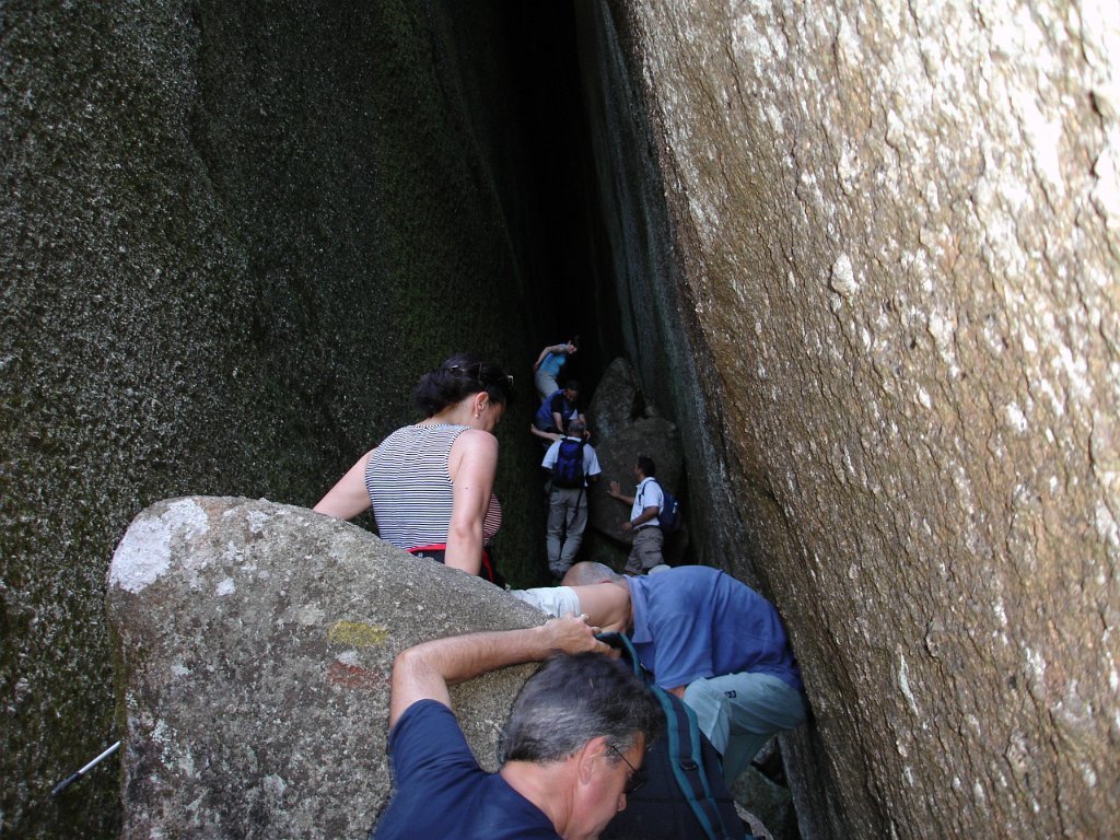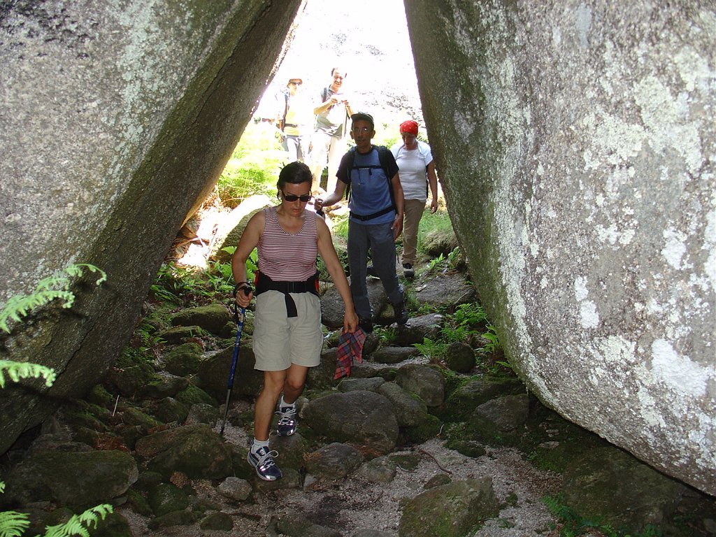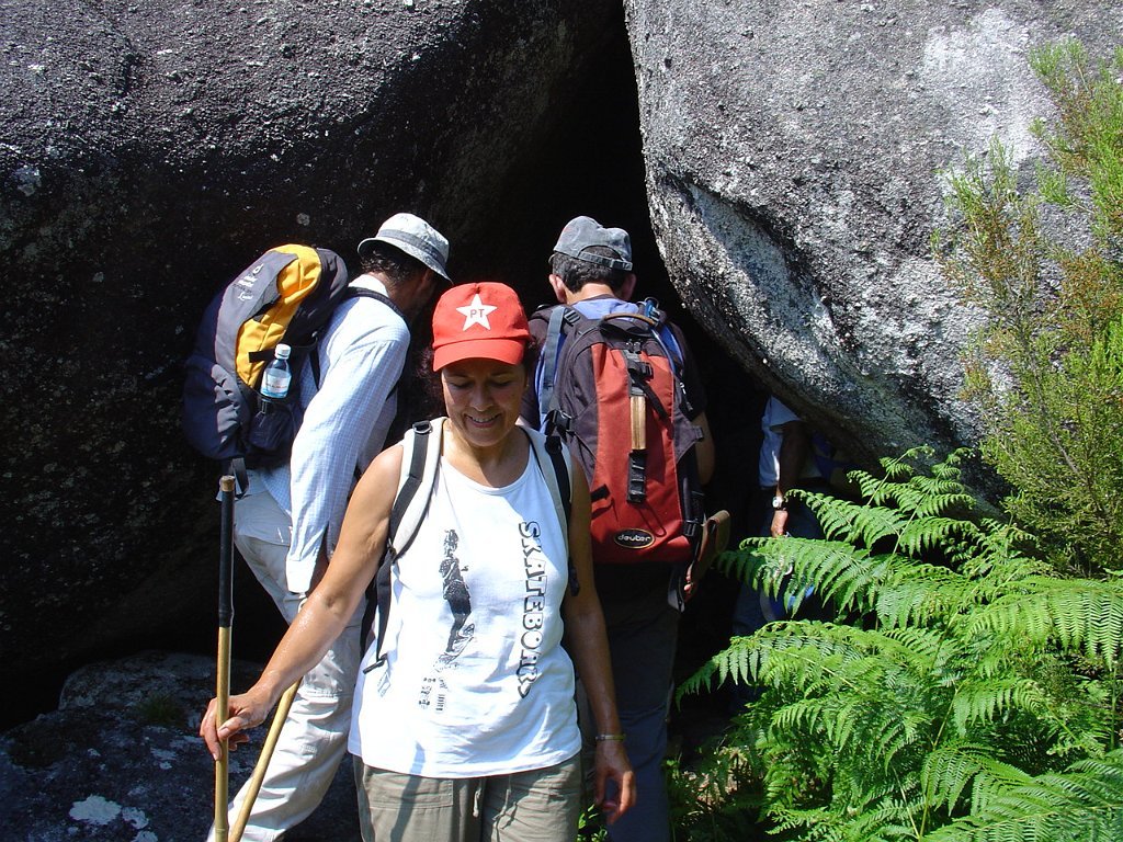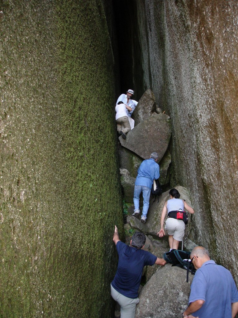 Depois de alguma polémica e muitas dúvidas sobre a capacidade dos presentes em vencer tal dificuldade, animados pelas palavras da Isabel, que já tinha passado a fenda várias vezes, lá nos fomos animando mutuamente e arrastando pela estreita passagem, ora contornando, ora galgando os enormes blocos graníticos, que quase obstruem completamente a dita.