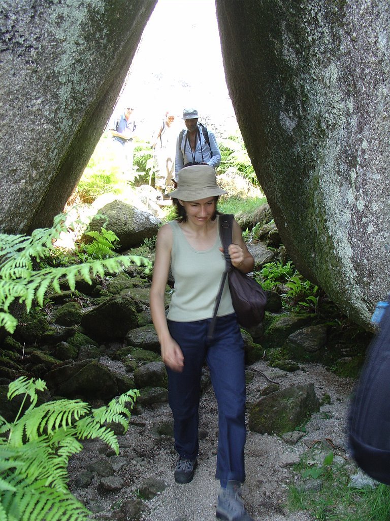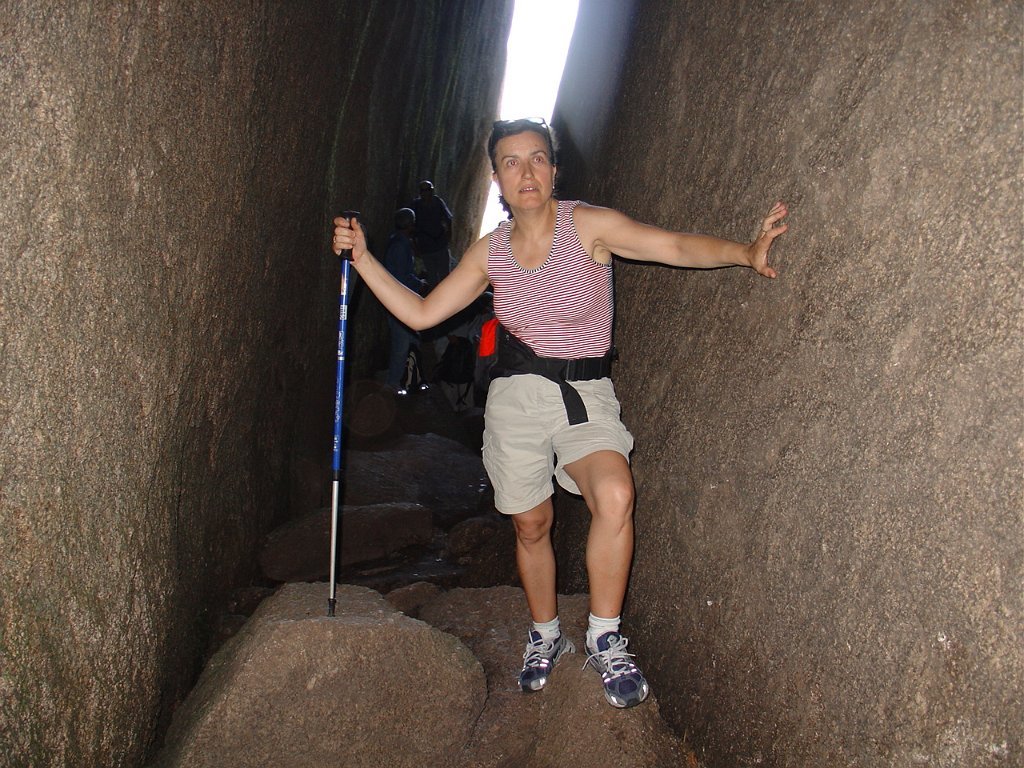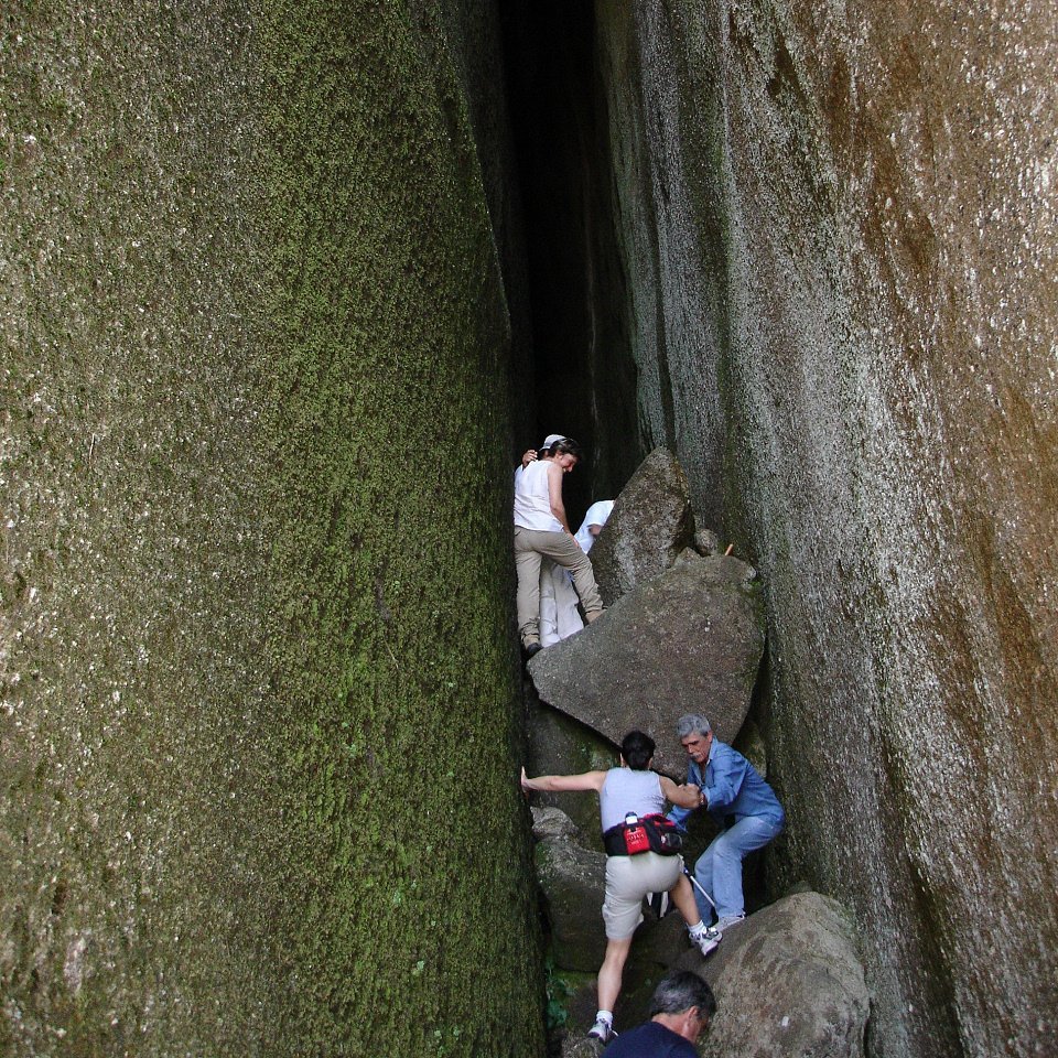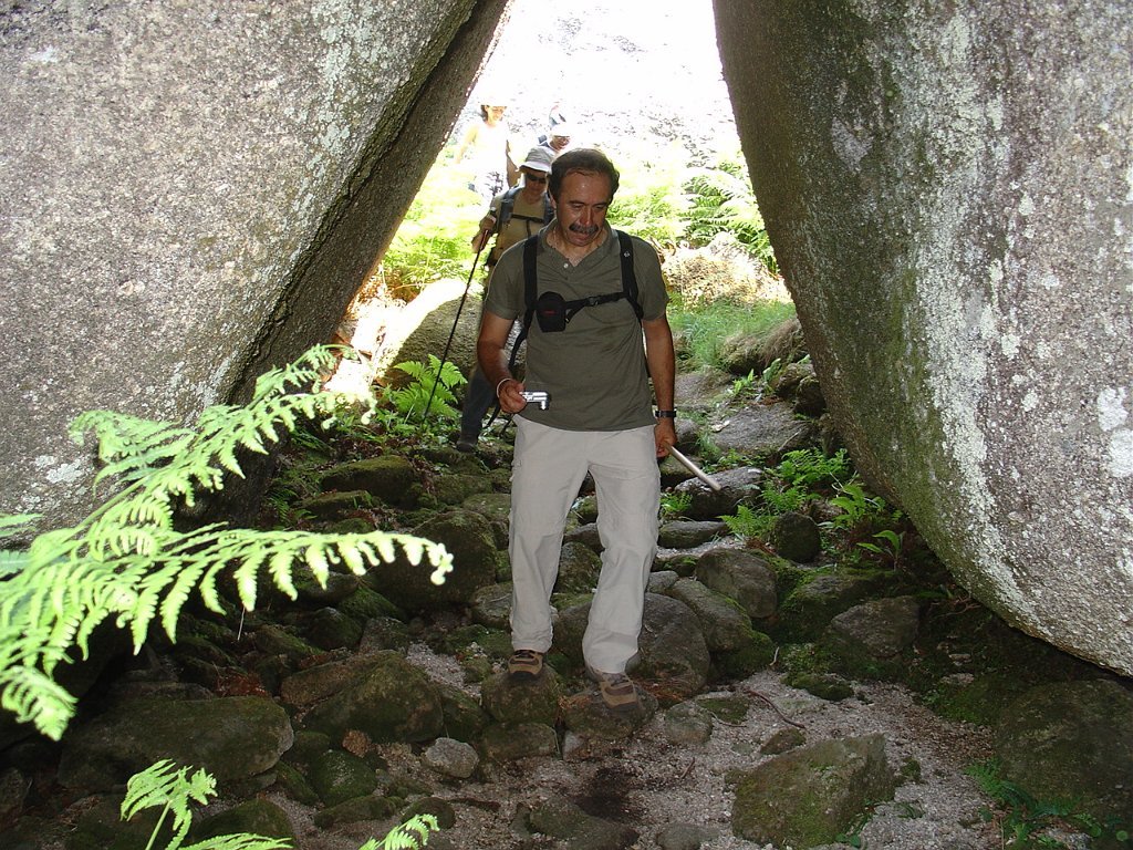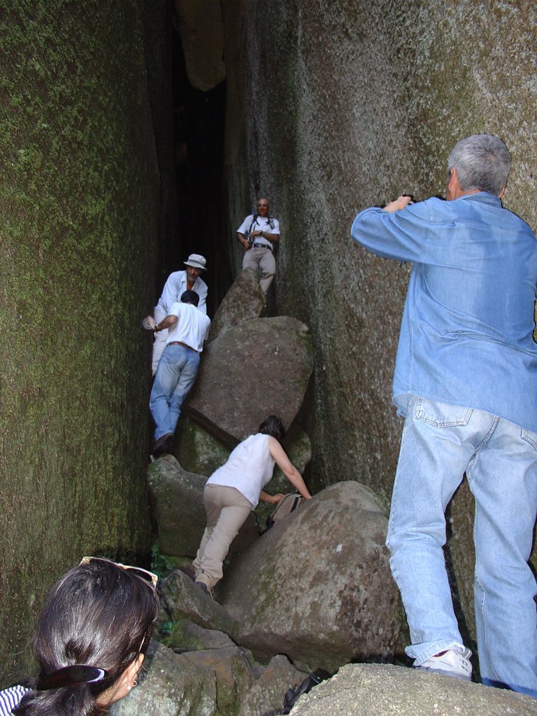 Depois de alguma polémica e muitas dúvidas sobre a capacidade dos presentes em vencer tal dificuldade, animados pelas palavras da Isabel, que já tinha passado a fenda várias vezes, lá nos fomos animando mutuamente e arrastando pela estreita passagem, ora contornando, ora galgando os enormes blocos graníticos, que quase obstruem completamente a dita.