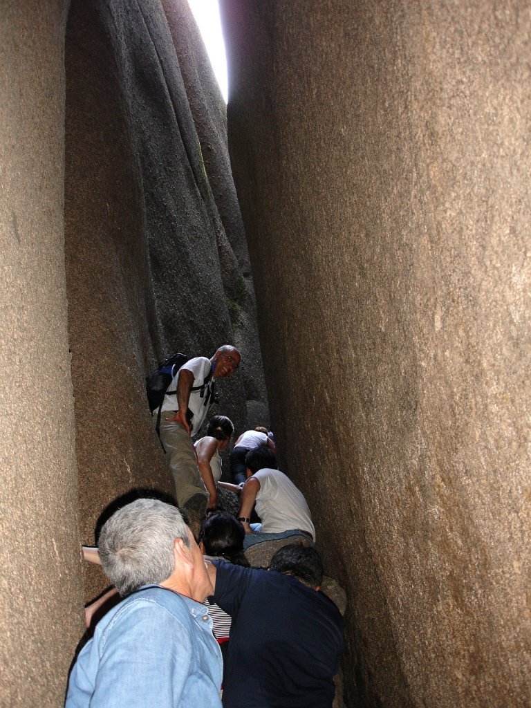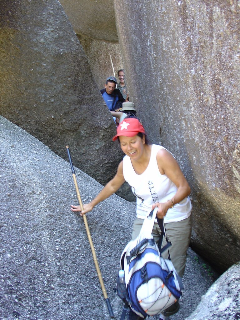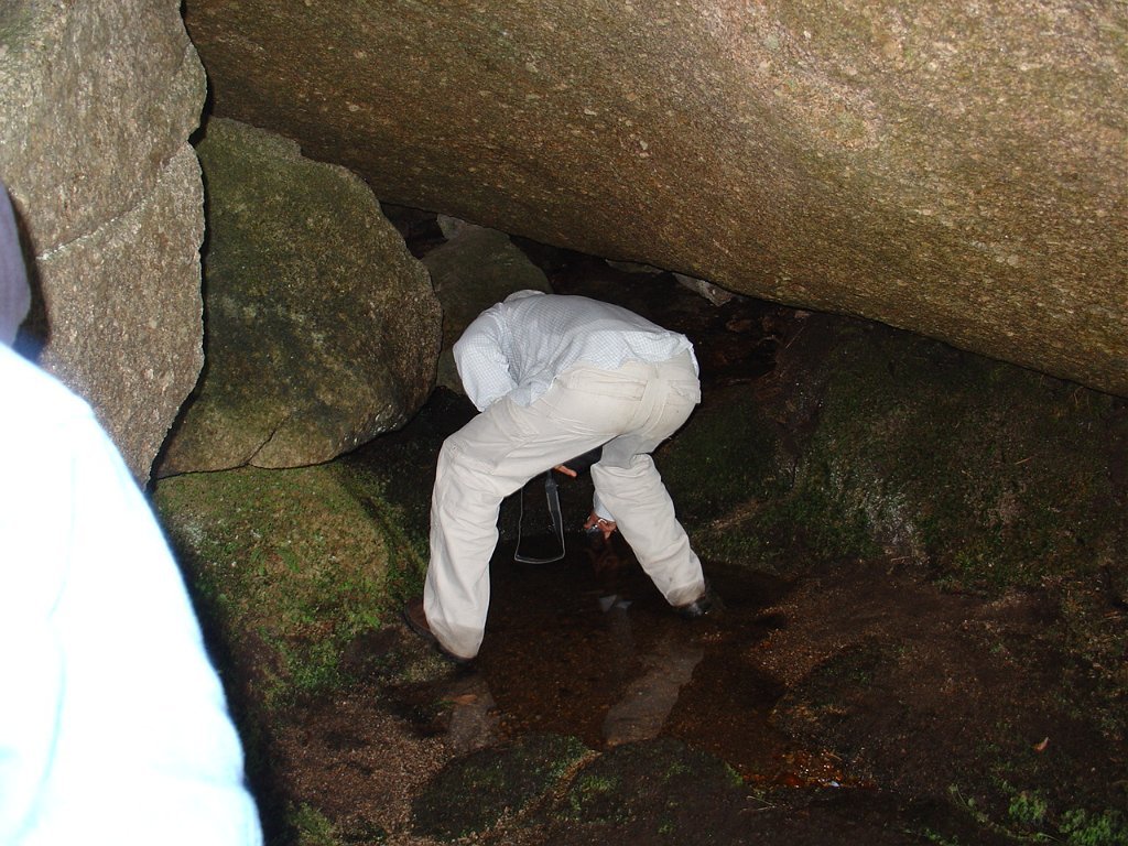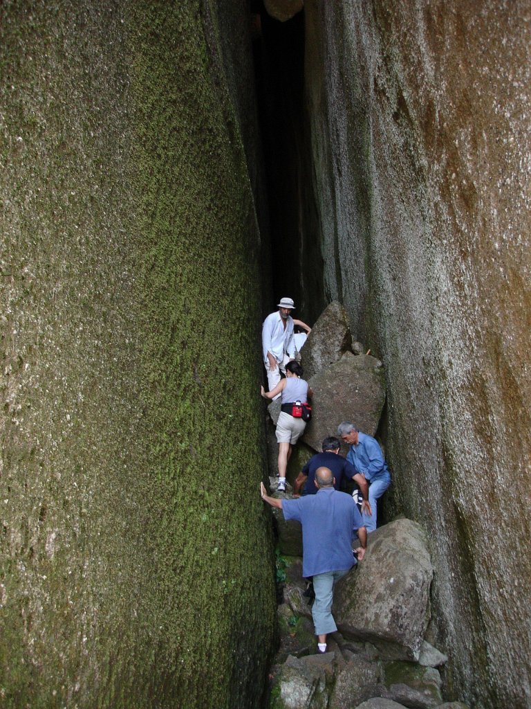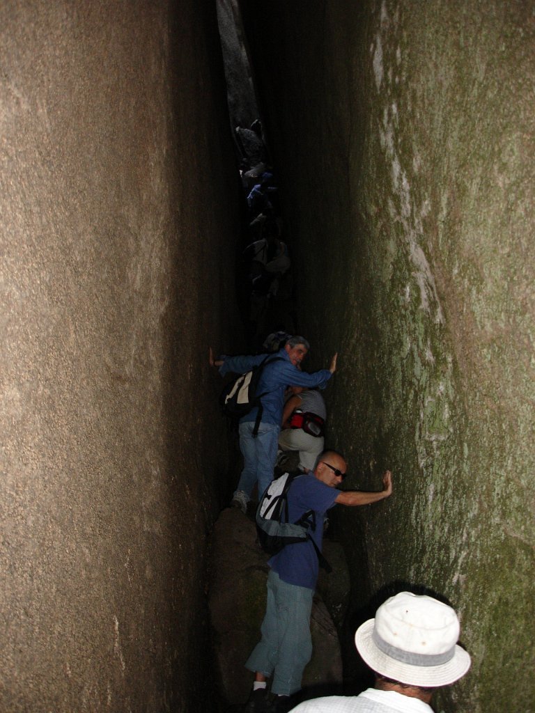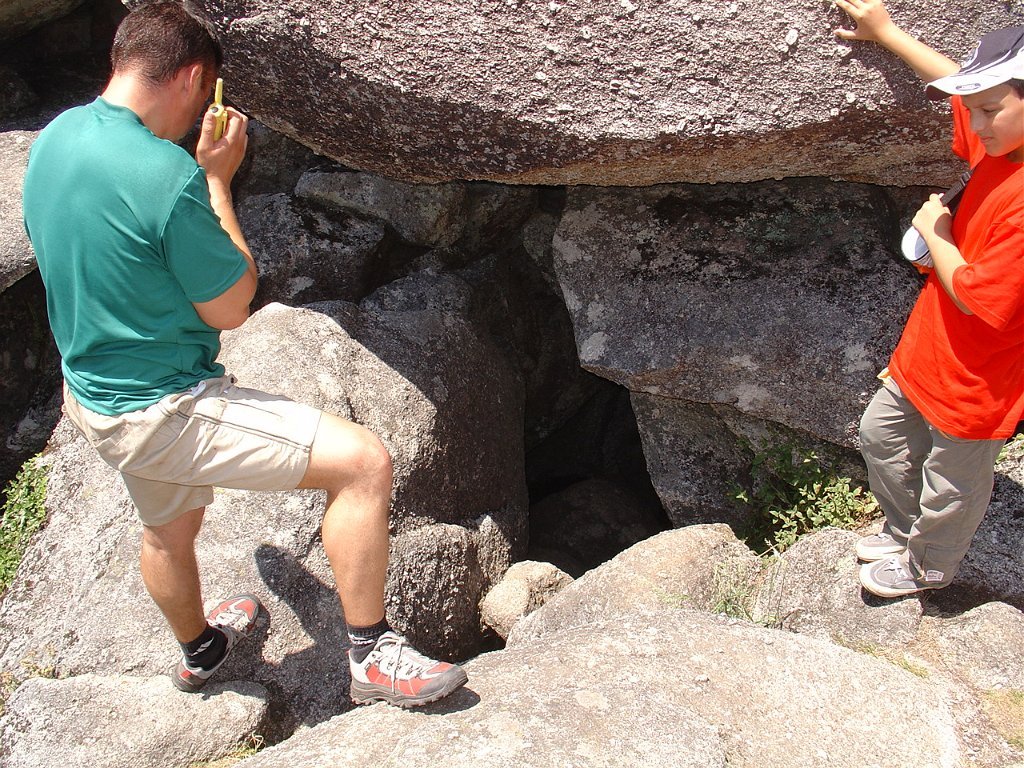 Depois de alguma polémica e muitas dúvidas sobre a capacidade dos presentes em vencer tal dificuldade, animados pelas palavras da Isabel, que já tinha passado a fenda várias vezes, lá nos fomos animando mutuamente e arrastando pela estreita passagem, ora contornando, ora galgando os enormes blocos graníticos, que quase obstruem completamente a dita.