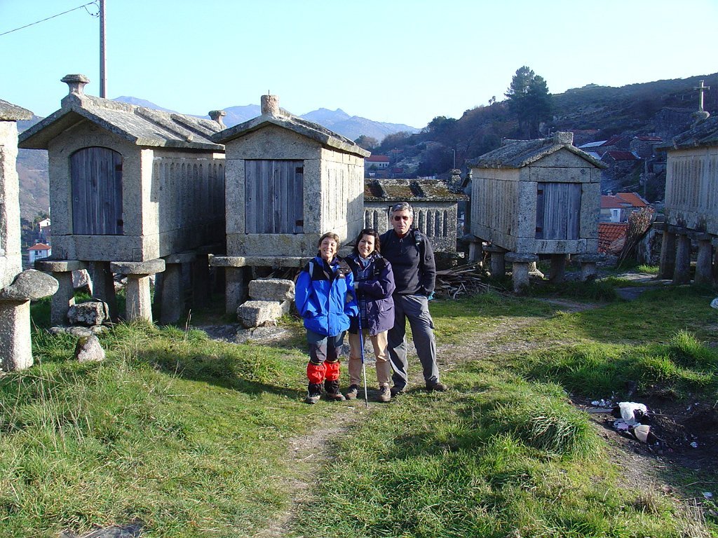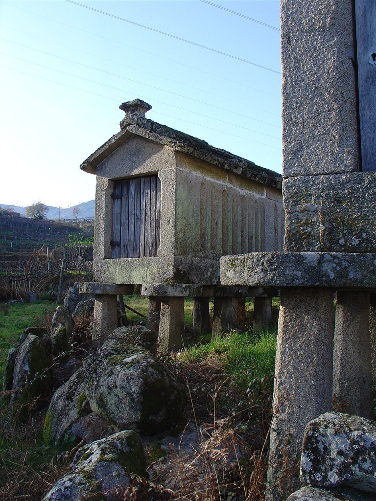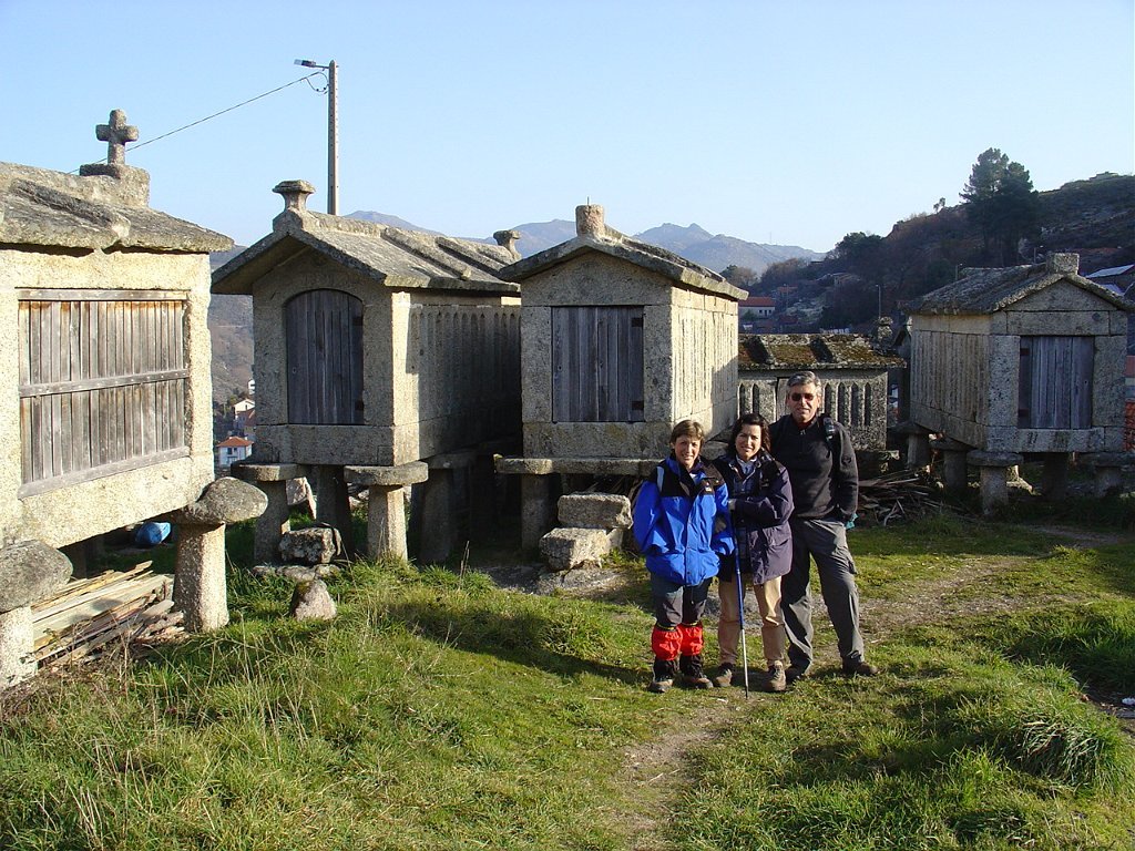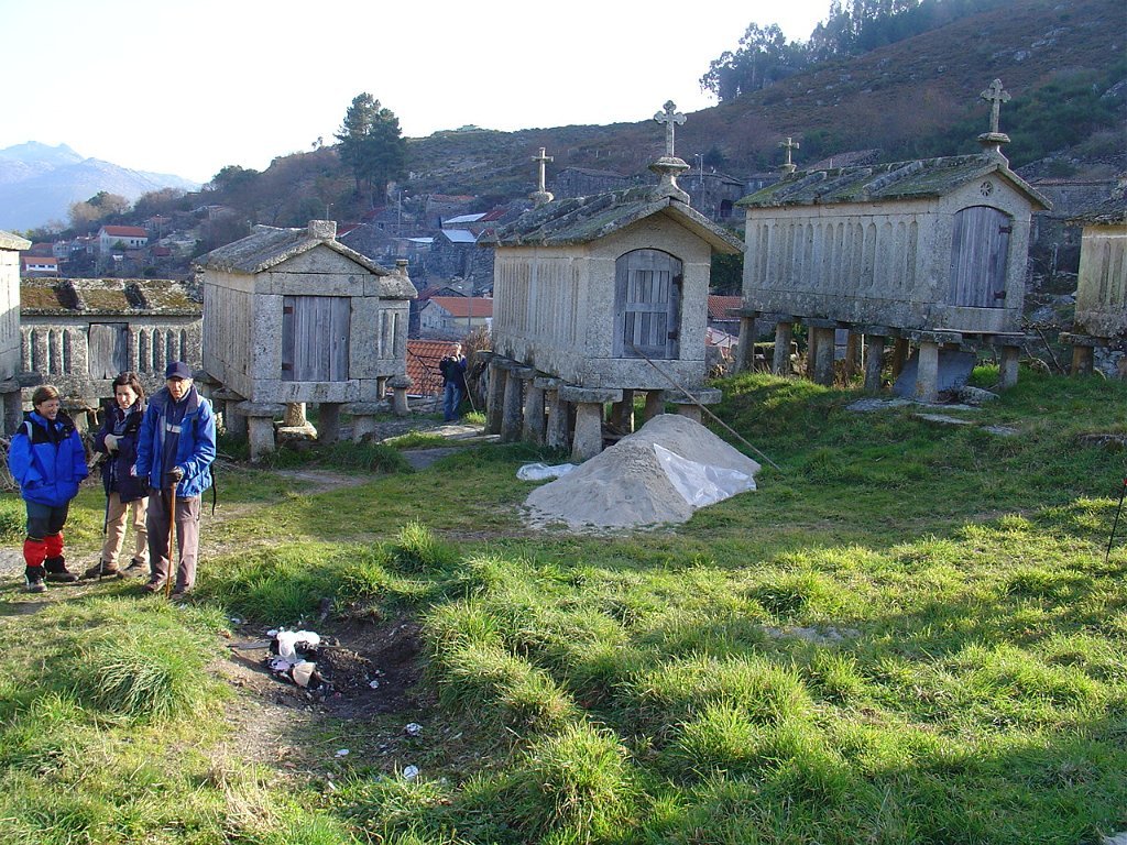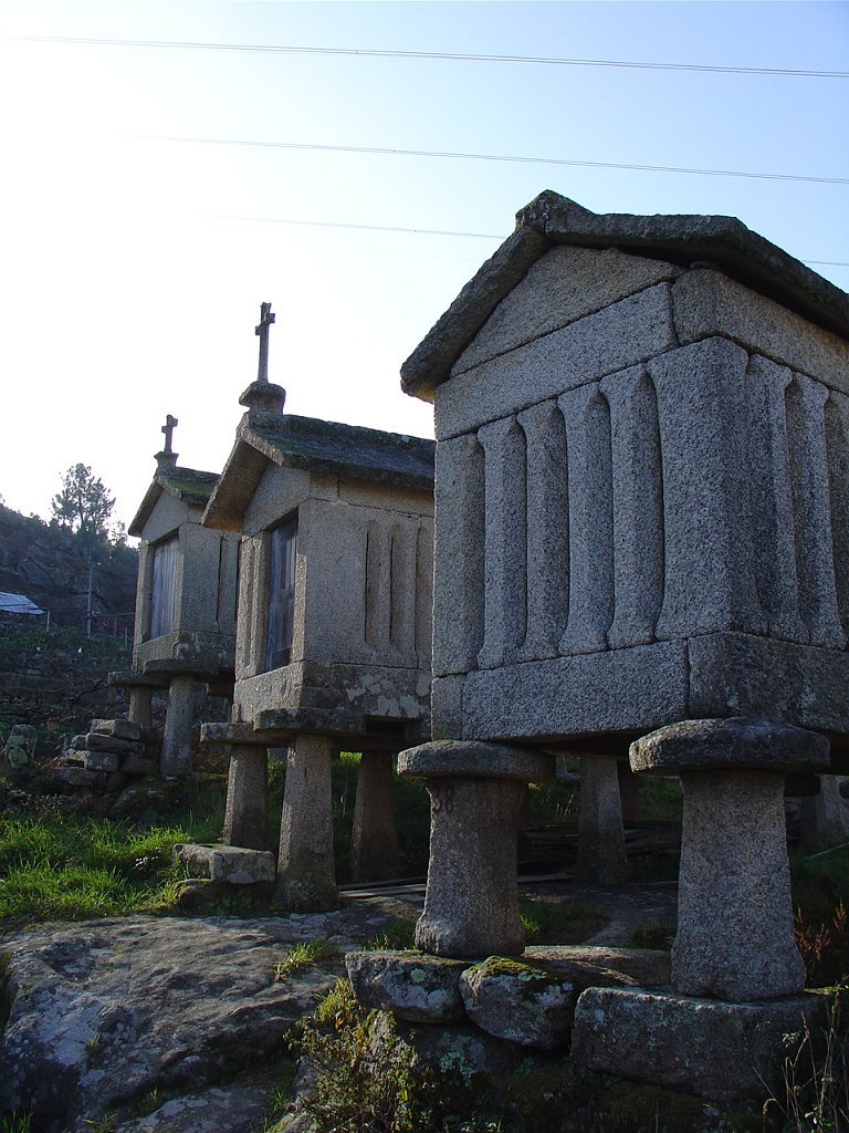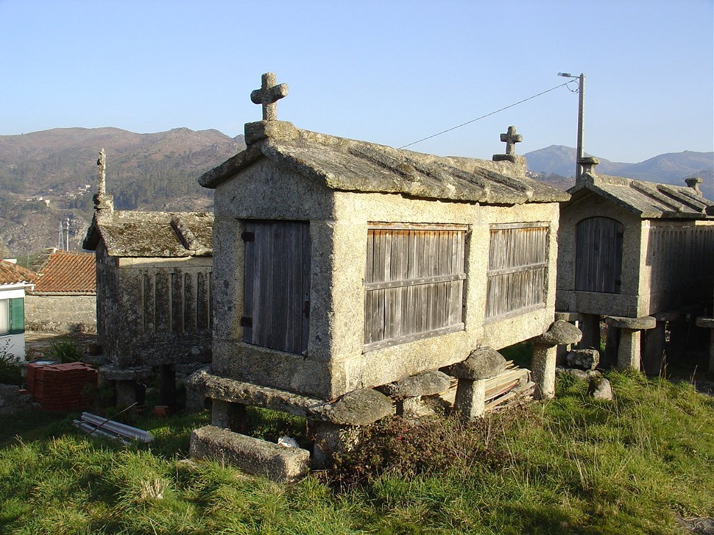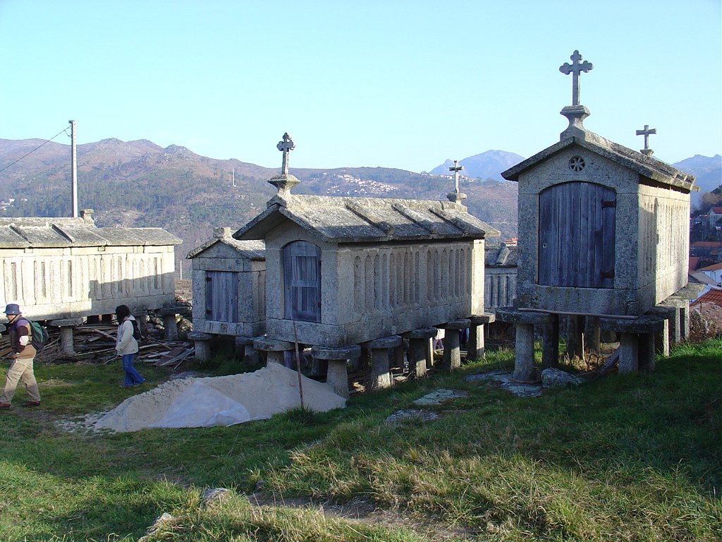 Cruzamos o lugar por entre velhas casas sete e oitocentistas, das mais interessantes que a arquitectura popular do Minho tem. Paramos um pouco acima, apreciando o elevado número de espigueiros. Inteiramente de pedra, cada exemplar apoia-se em vários pilares curtos, assentes na rocha e encimados por mós ou mesas. Sobre elas repousa o canastro, formado de balaustros entre si separados por fendas de ventilação. Como cobertura duas lajes de granito unidas em ângulo obtuso - ornamentados nos vértices de cruzes protectoras e símbolos de Salomão.
