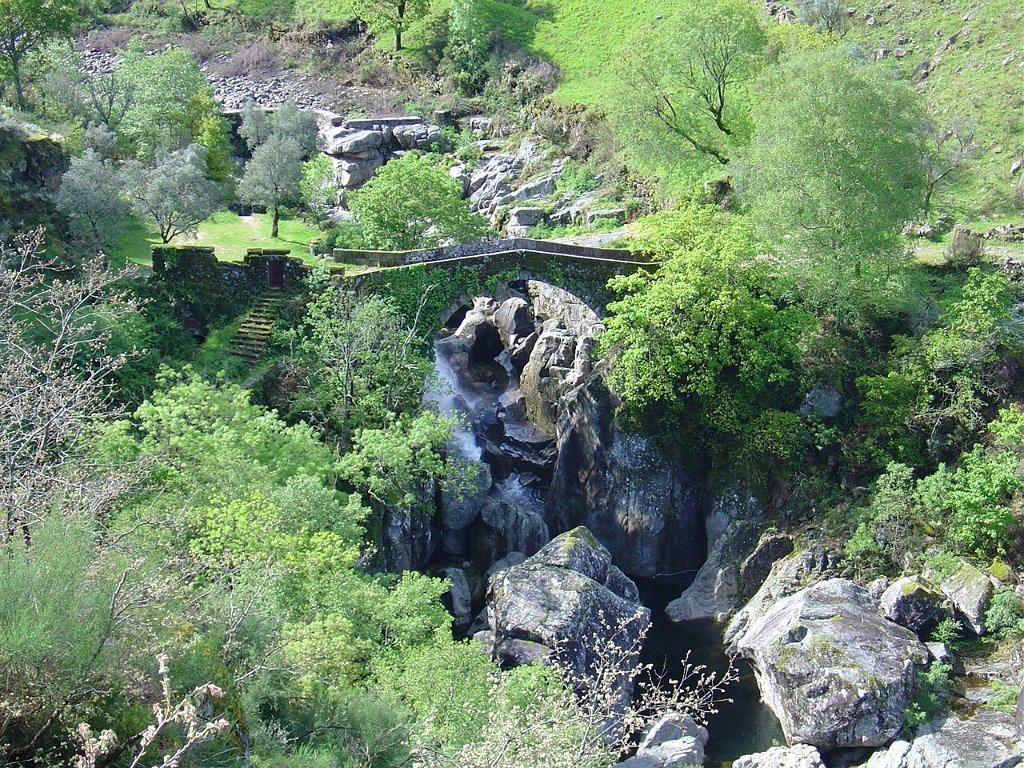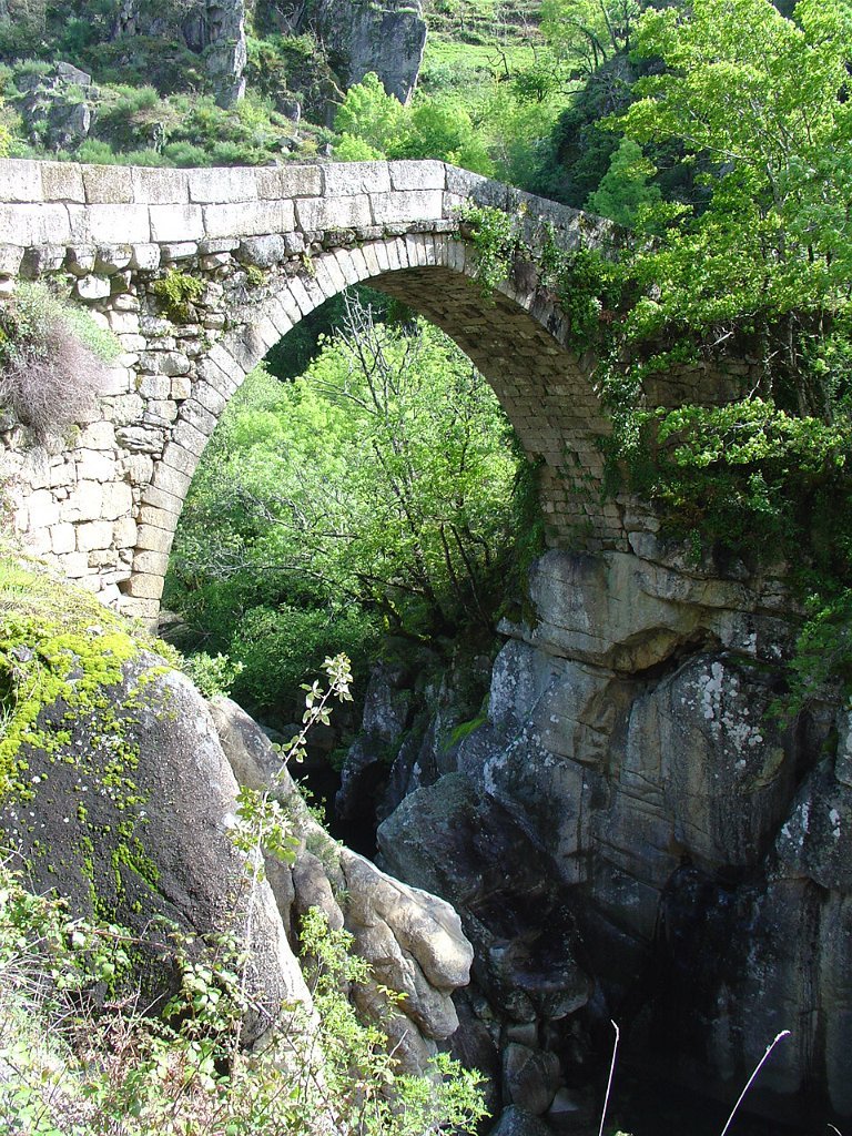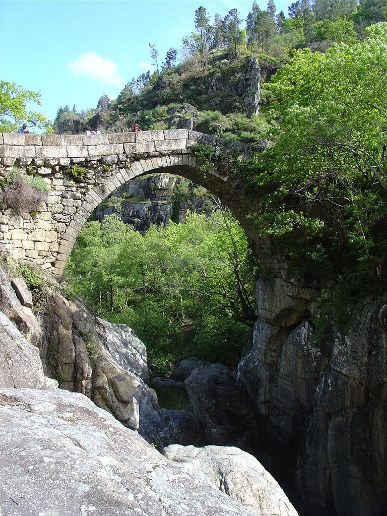 É uma ponte de arquitectura medieval, extravagante, louca, de um só arco, com mais de 13 m de vão, lançada com arrojo sobre dois rochedos, onde as águas do Rabagão se estreitam, vencendo a profunda ravina cortada na rocha do vale alcantilado, se despedaçam com fragor e saltam a grande altura, transformando-se em vaporosa chuva em dias de tenebrosas enchurradas que impressionam pelo rumor das águas, refervendo em sucessivas cachoeiras entre enormes penedos suspensos. Fica no fundo de um desfiladeiro alcantilado, a um quilómetro da confluência do Rabagão com o Cávado. Tão medonho e agreste é o sítio e tão severo o aspecto da ponte, que a vivíssima imaginação do povo não tardou a tecer-lhe lendas.