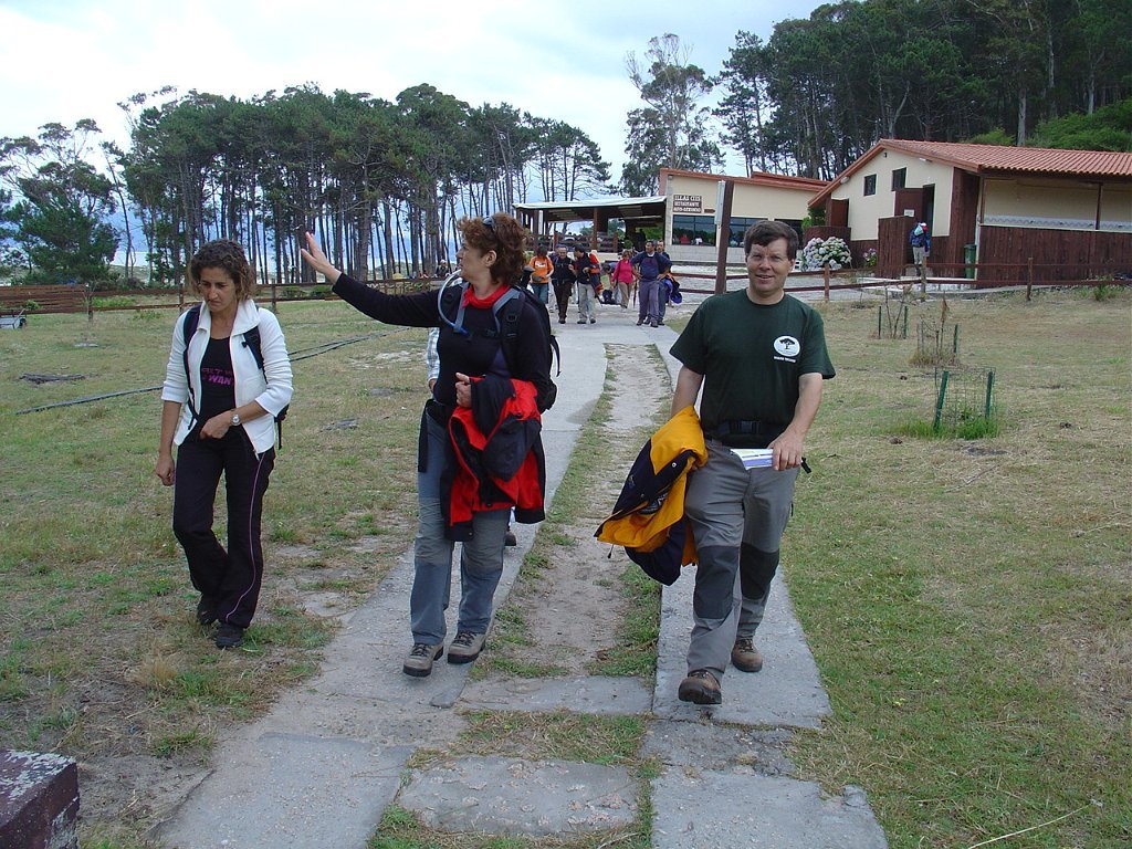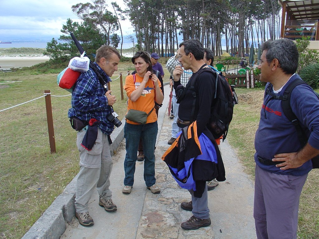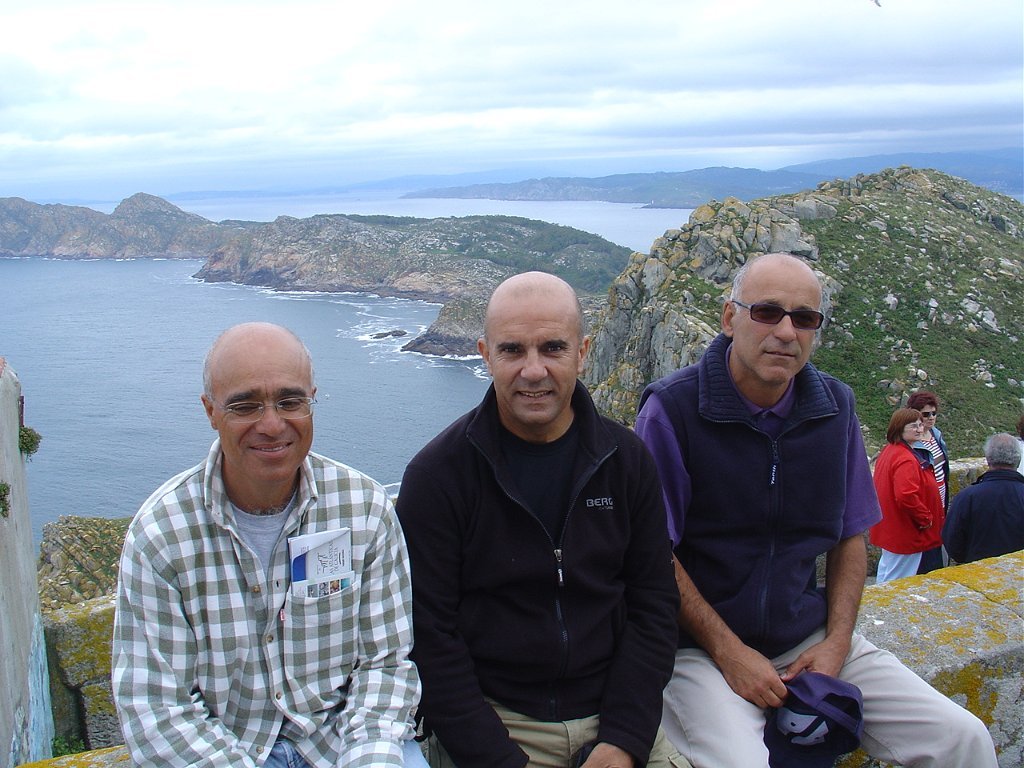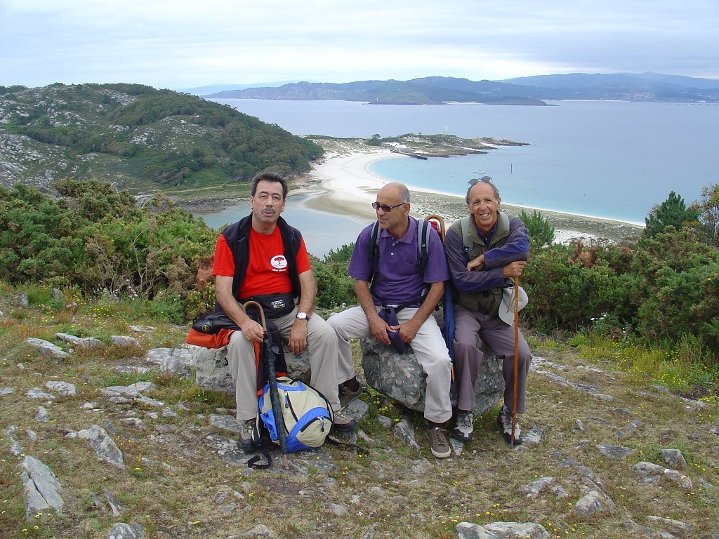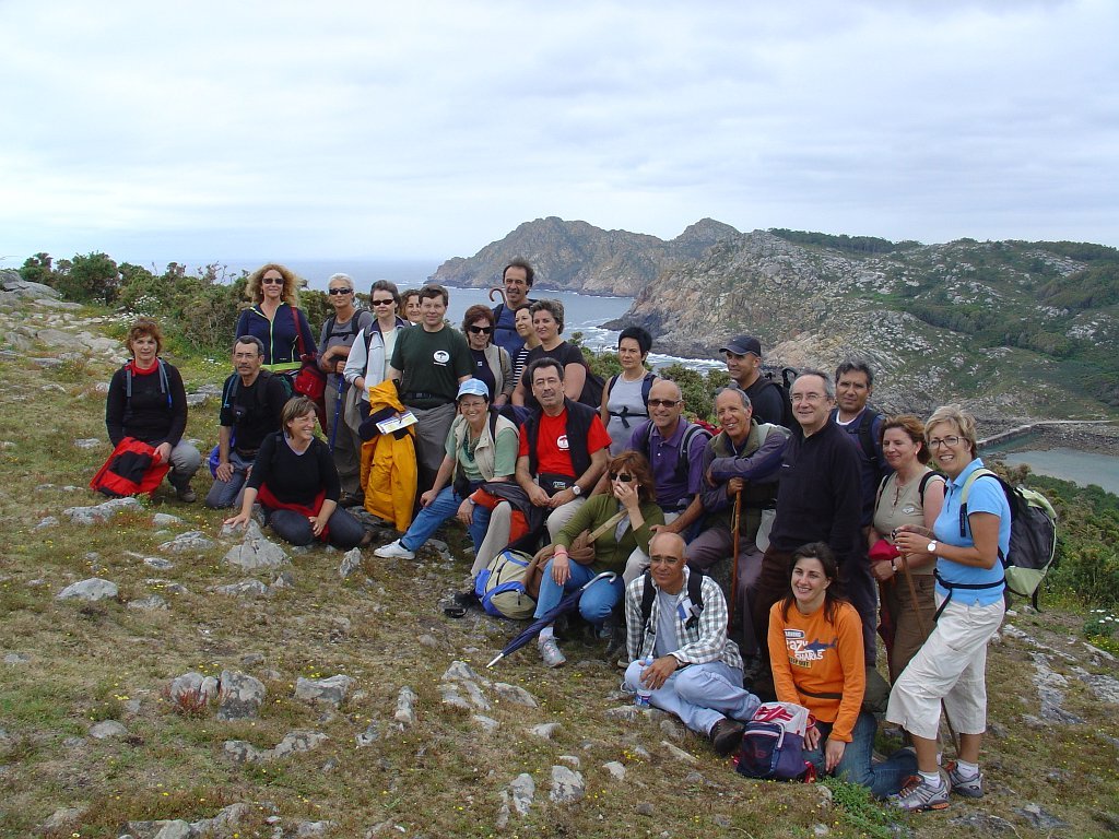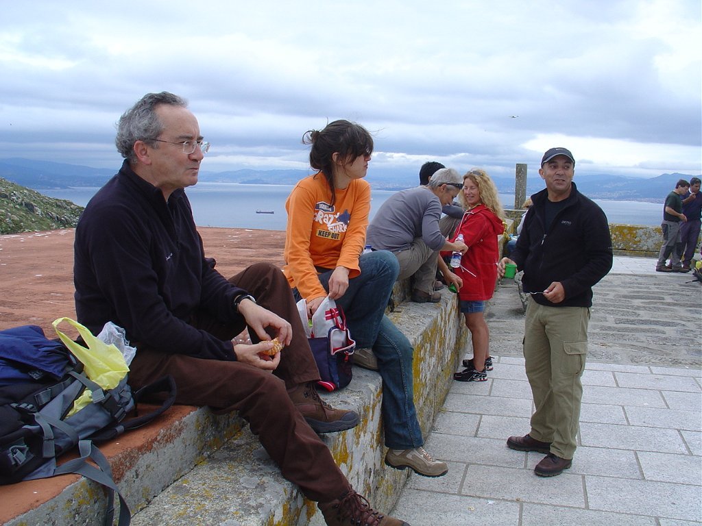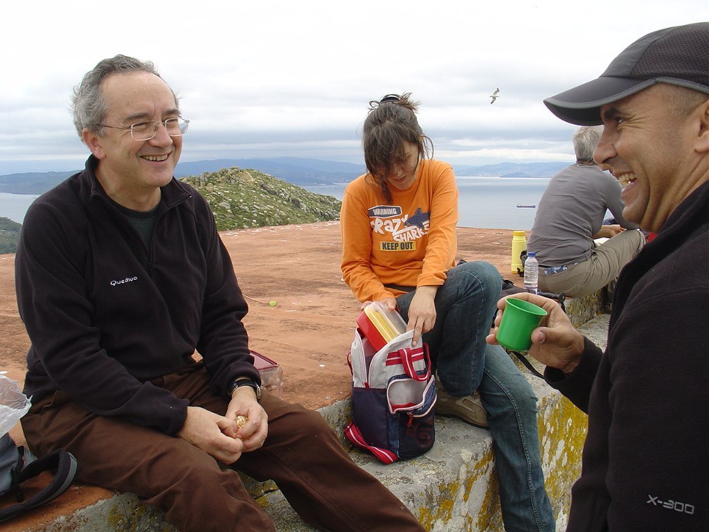 Feita a refeição abrigados do vento forte, iniciamos depois a descida para o parque de campismo, onde fizemos uma pausa de confraternização com alguns companheiros do Fluvial, que também escolheram estas paragens para deslocação. Passamos de seguidas para a ilha do Norte, que atravessamos, até ao Faro do Peito, passando entretanto pelo Areal de Figueiras, que é uma das mais antigas praias de nudistas da Galícia, com o seu extenso areal branco e água límpida, mas agora completamente deserto, pois o tempo estava fresco e desencorajador de práticas balneares.