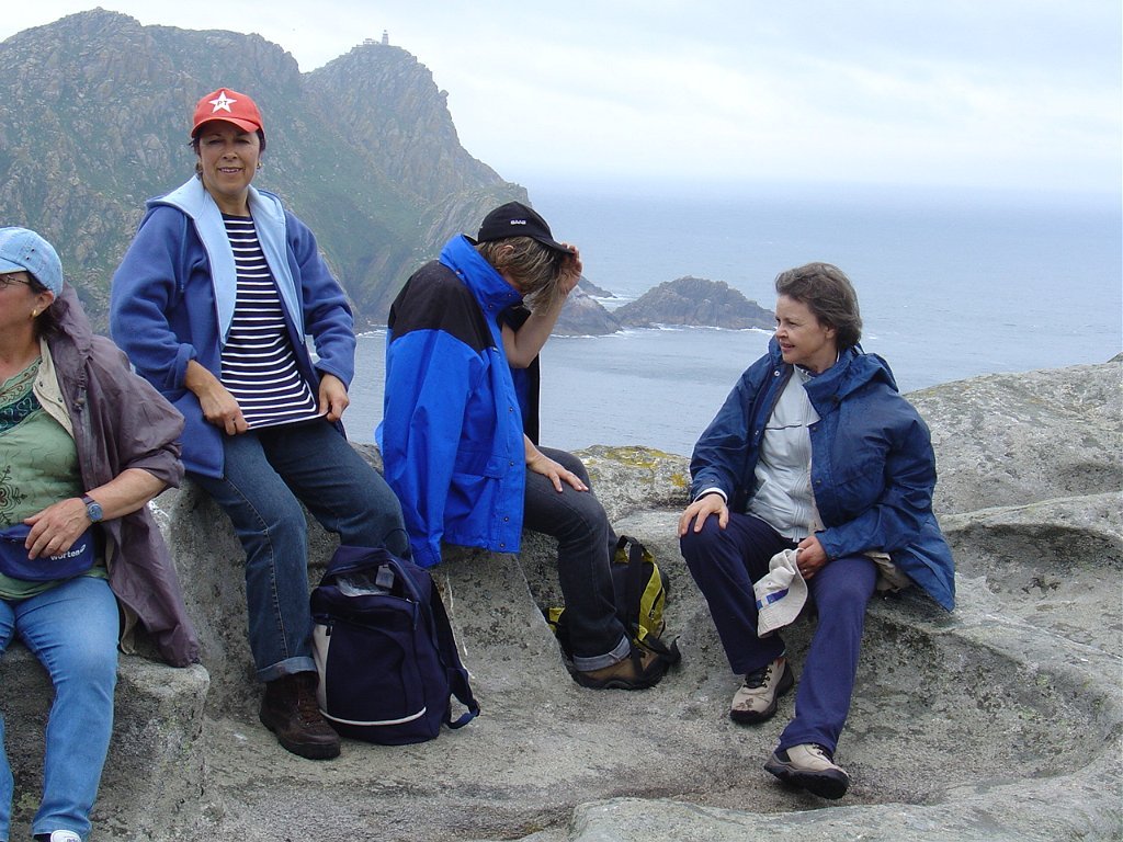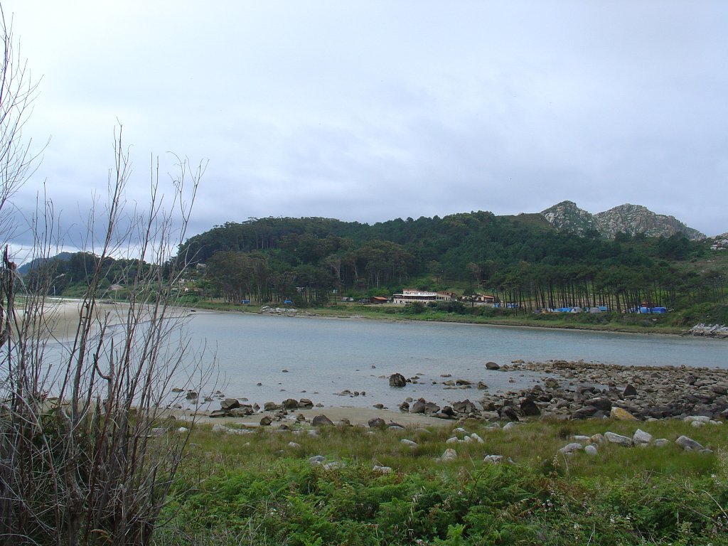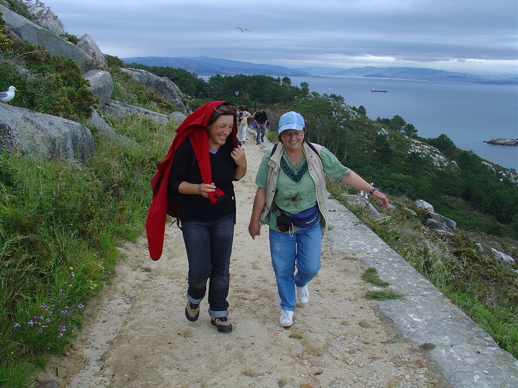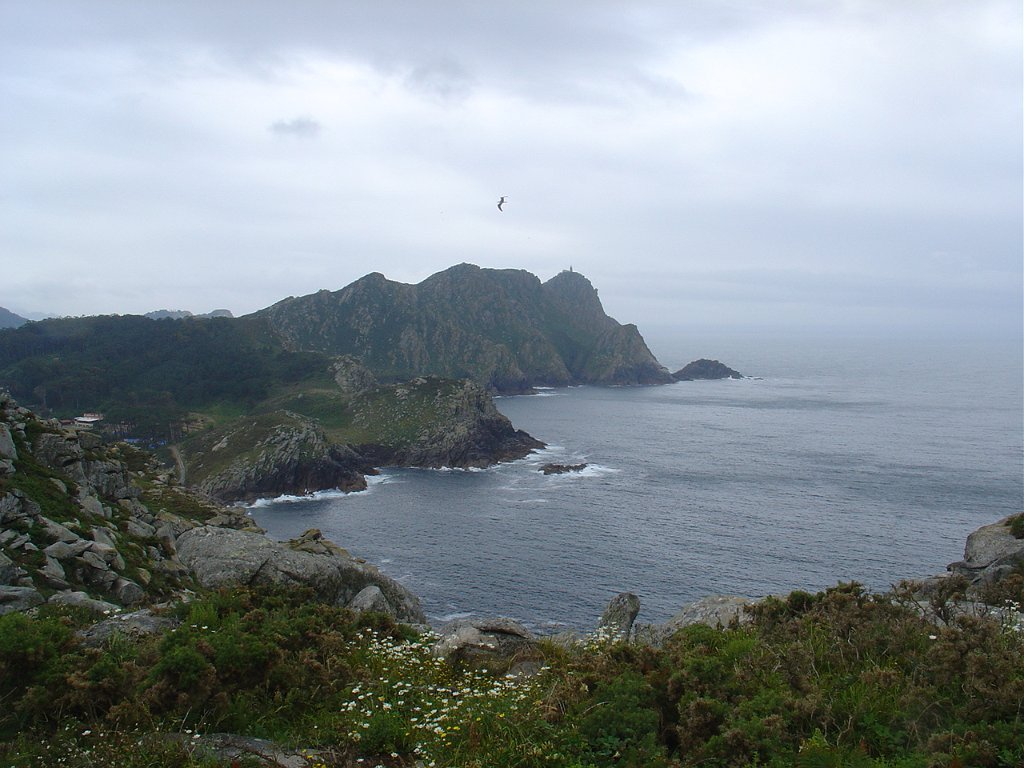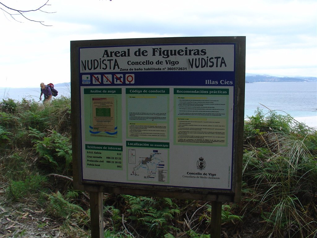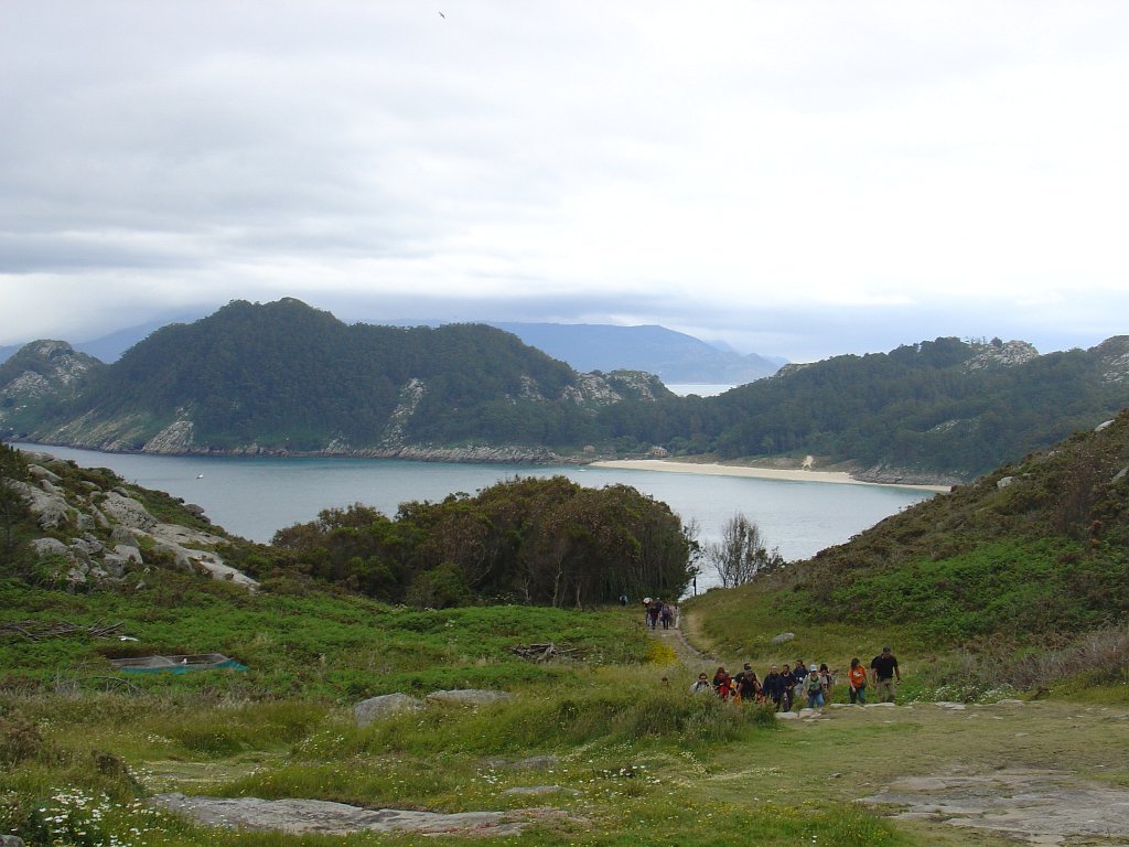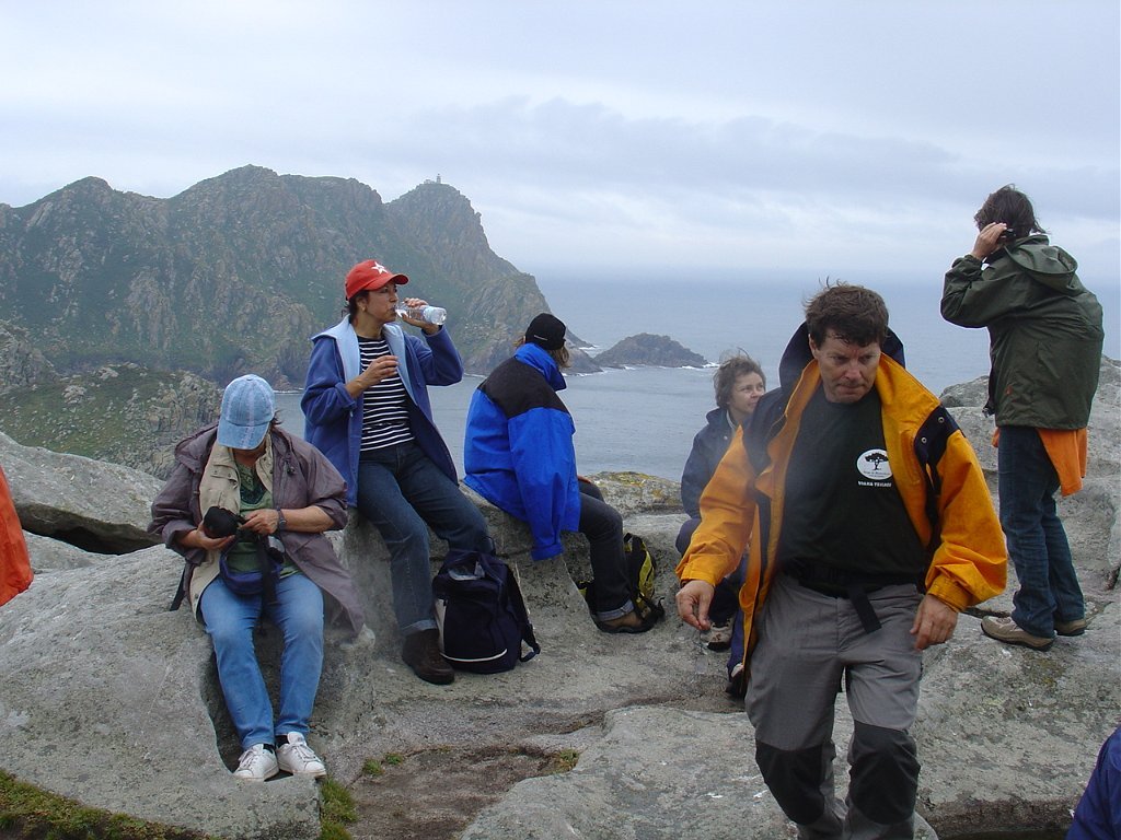 Feita a refeição abrigados do vento forte, iniciamos depois a descida para o parque de campismo, onde fizemos uma pausa de confraternização com alguns companheiros do Fluvial, que também escolheram estas paragens para deslocação. Passamos de seguidas para a ilha do Norte, que atravessamos, até ao Faro do Peito, passando entretanto pelo Areal de Figueiras, que é uma das mais antigas praias de nudistas da Galícia, com o seu extenso areal branco e água límpida, mas agora completamente deserto, pois o tempo estava fresco e desencorajador de práticas balneares.