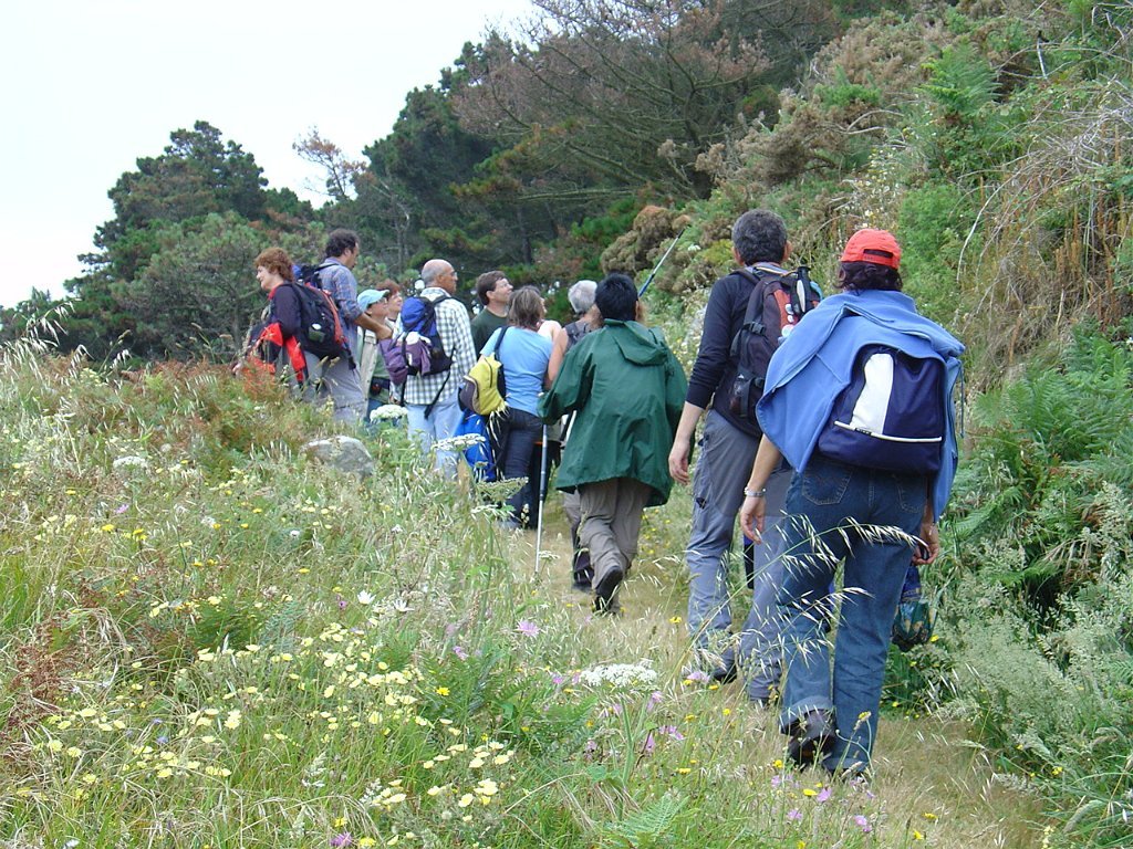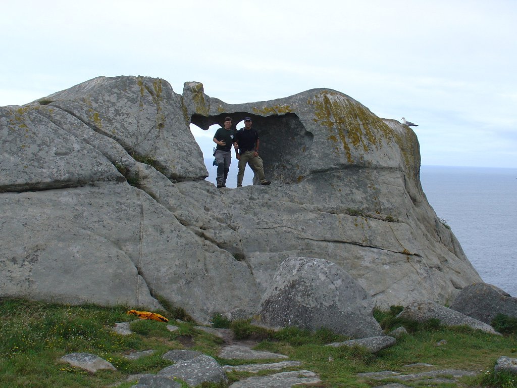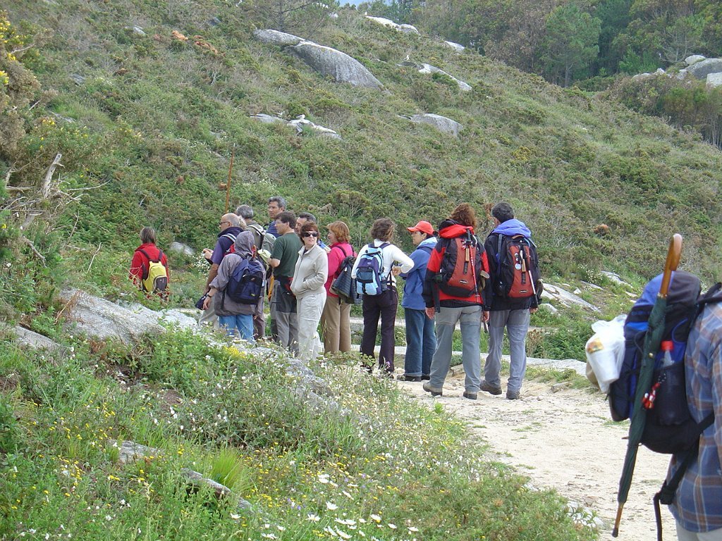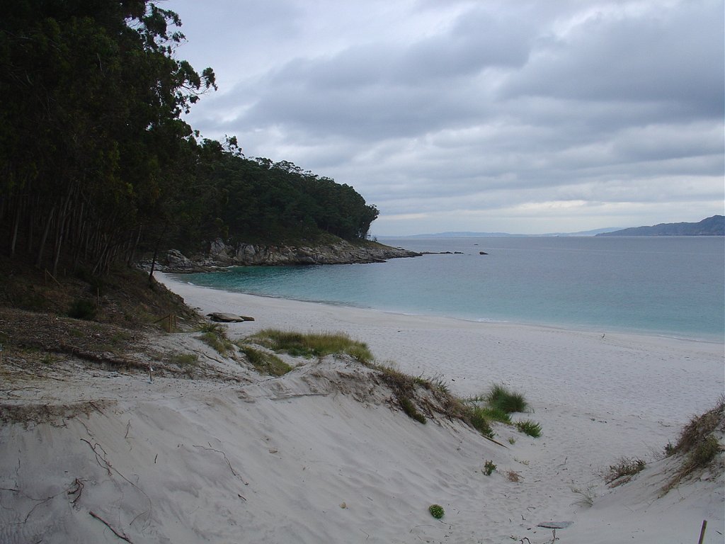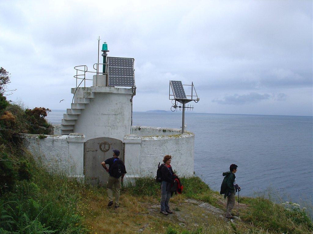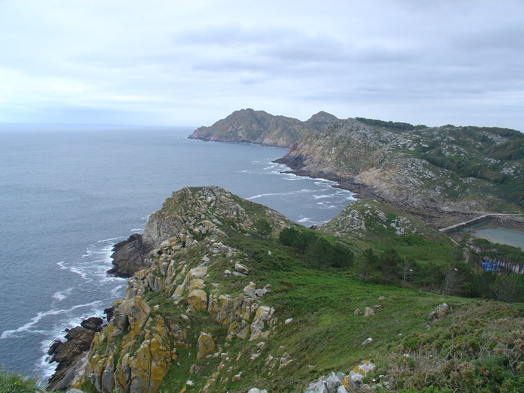 Feita a refeição abrigados do vento forte, iniciamos depois a descida para o parque de campismo, onde fizemos uma pausa de confraternização com alguns companheiros do Fluvial, que também escolheram estas paragens para deslocação. Passamos de seguidas para a ilha do Norte, que atravessamos, até ao Faro do Peito, passando entretanto pelo Areal de Figueiras, que é uma das mais antigas praias de nudistas da Galícia, com o seu extenso areal branco e água límpida, mas agora completamente deserto, pois o tempo estava fresco e desencorajador de práticas balneares.