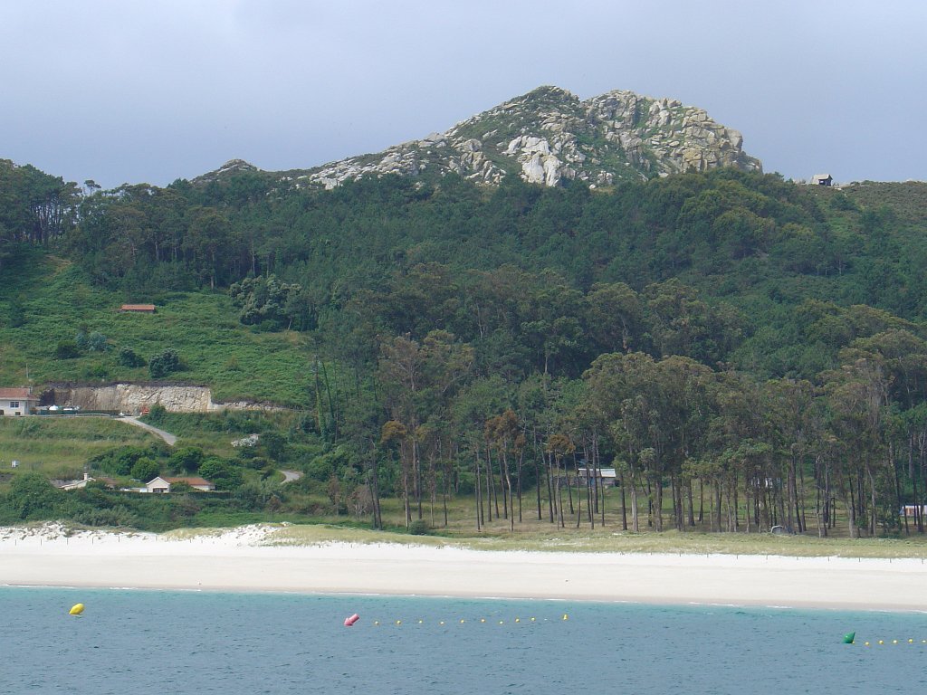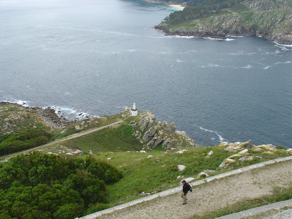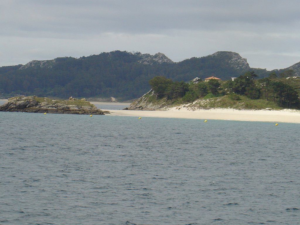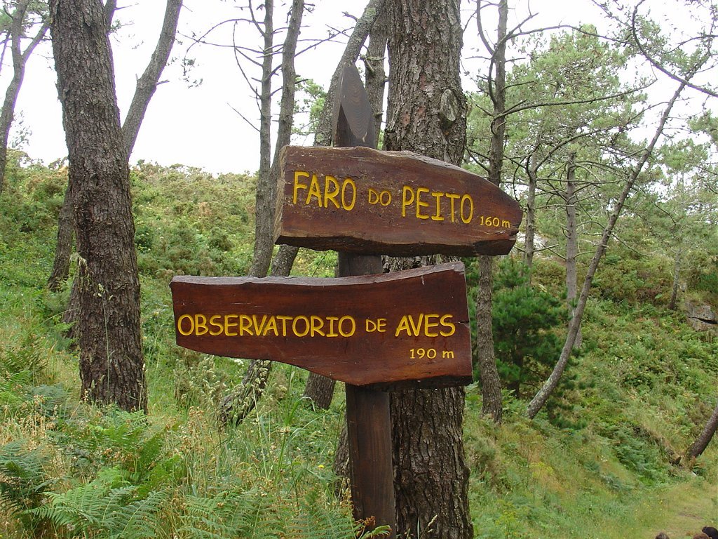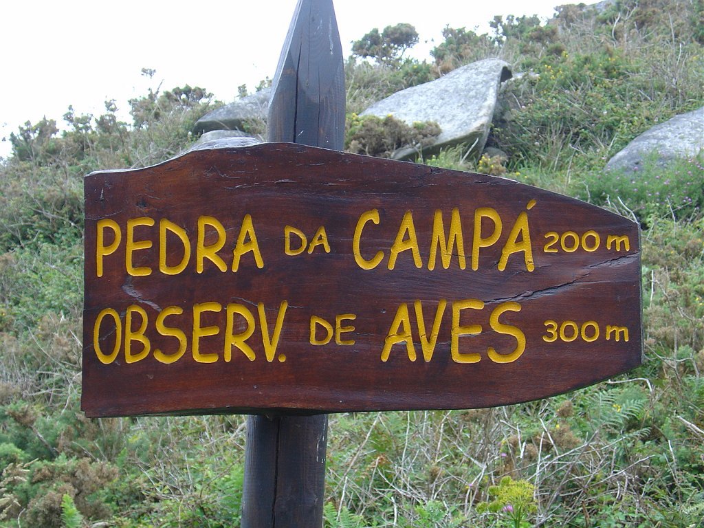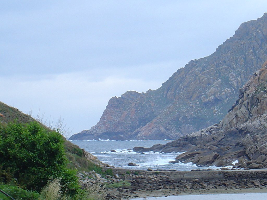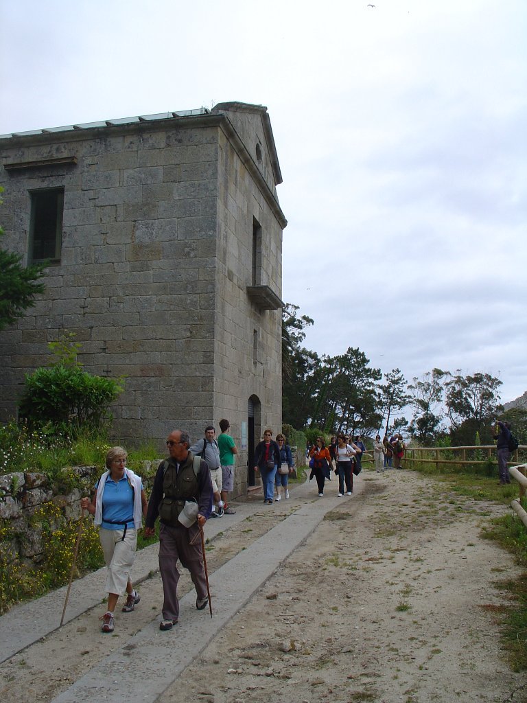 Feita a refeição abrigados do vento forte, iniciamos depois a descida para o parque de campismo, onde fizemos uma pausa de confraternização com alguns companheiros do Fluvial, que também escolheram estas paragens para deslocação. Passamos de seguidas para a ilha do Norte, que atravessamos, até ao Faro do Peito, passando entretanto pelo Areal de Figueiras, que é uma das mais antigas praias de nudistas da Galícia, com o seu extenso areal branco e água límpida, mas agora completamente deserto, pois o tempo estava fresco e desencorajador de práticas balneares.