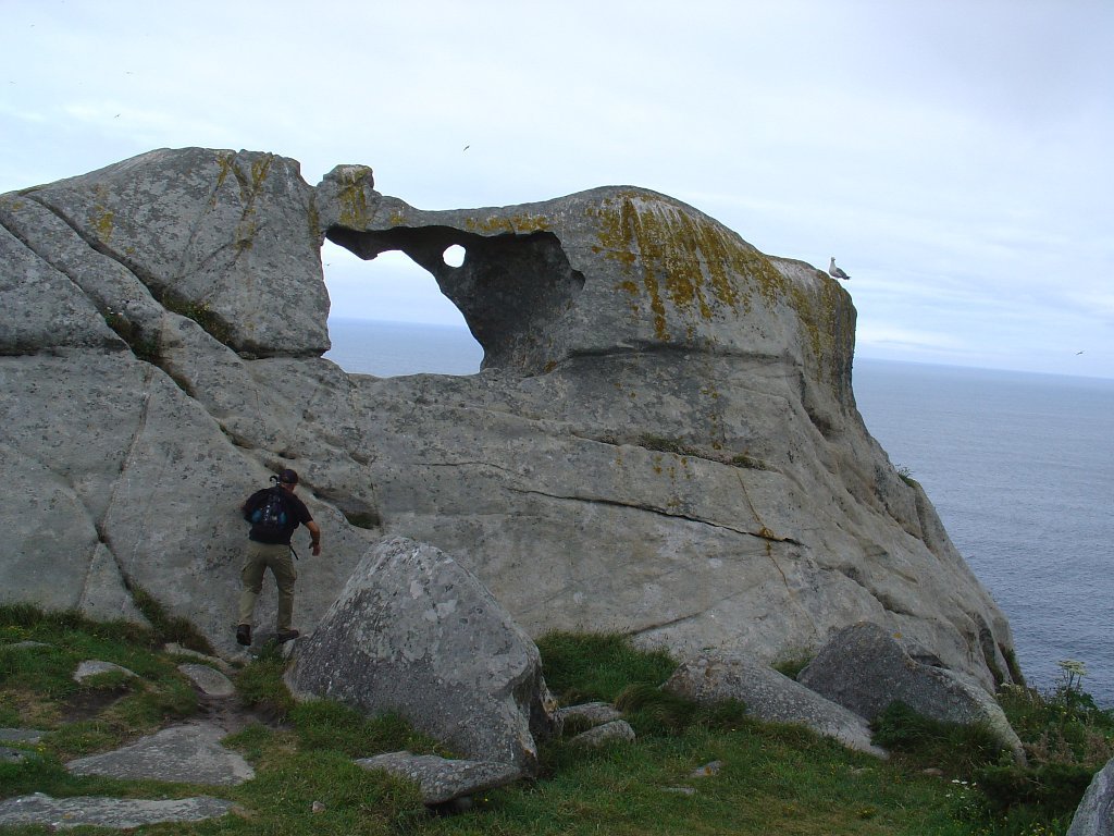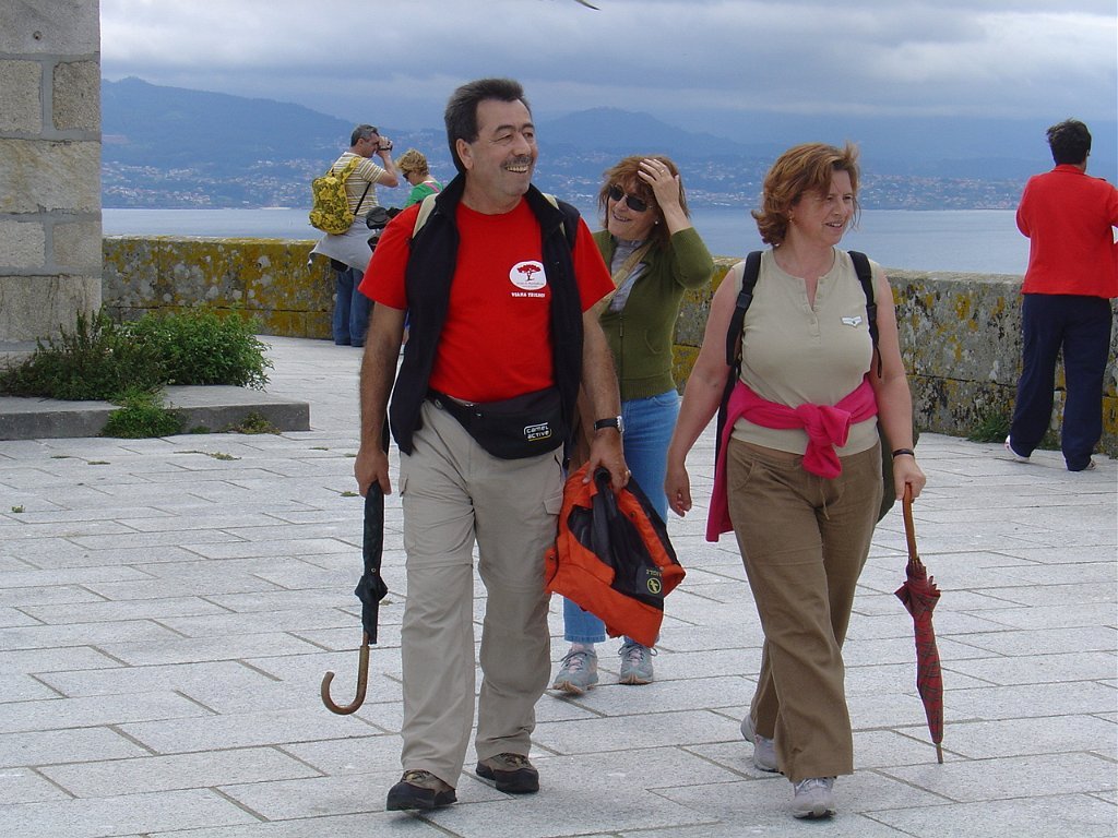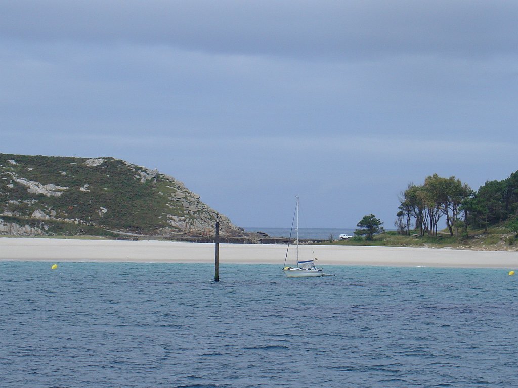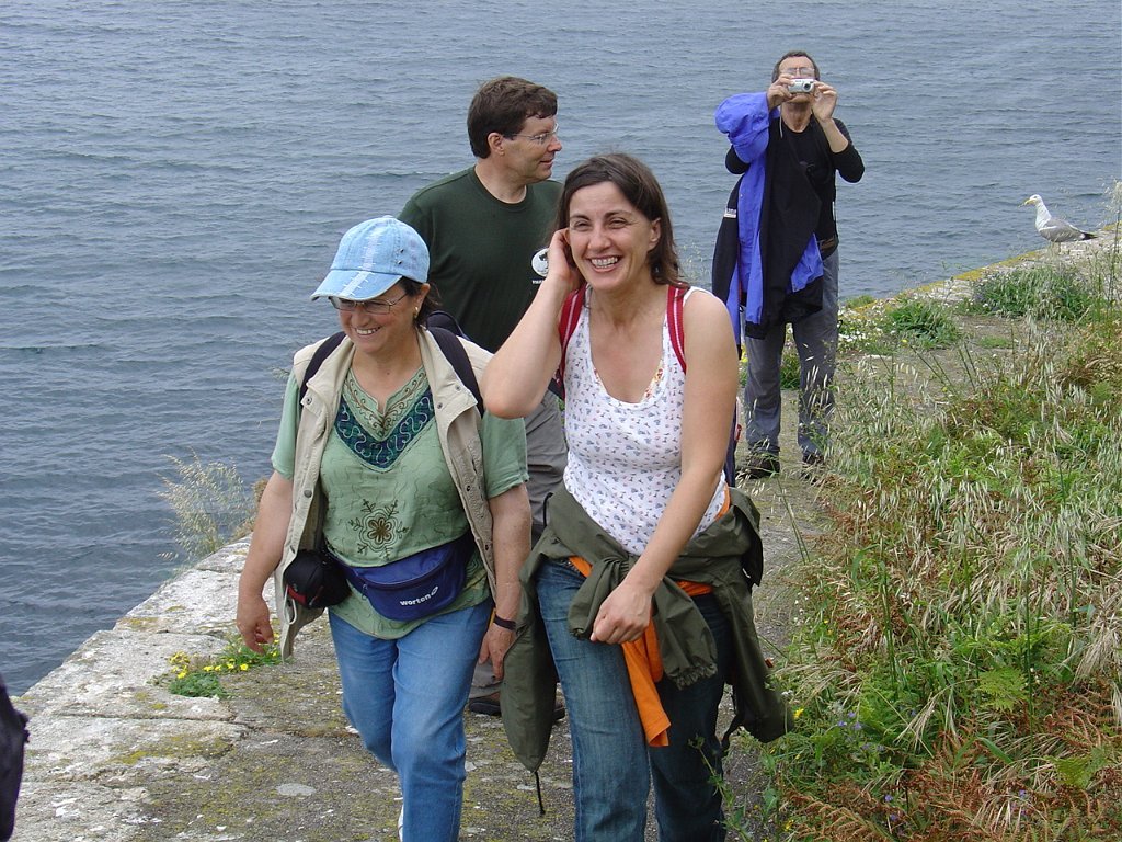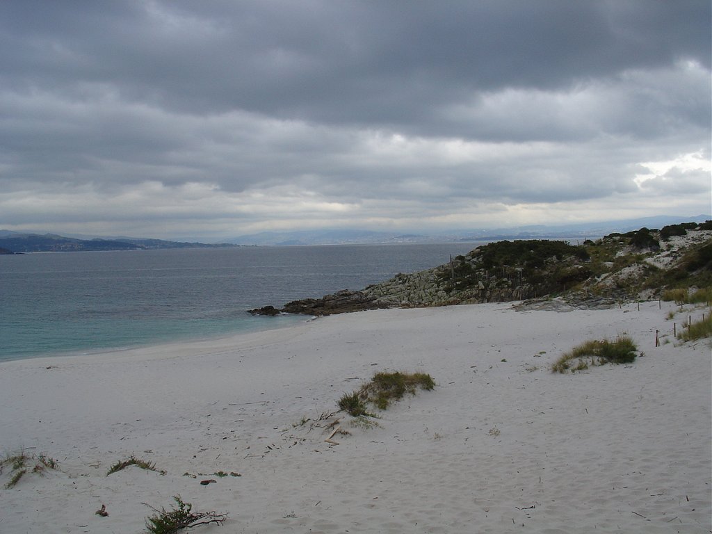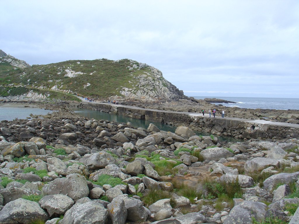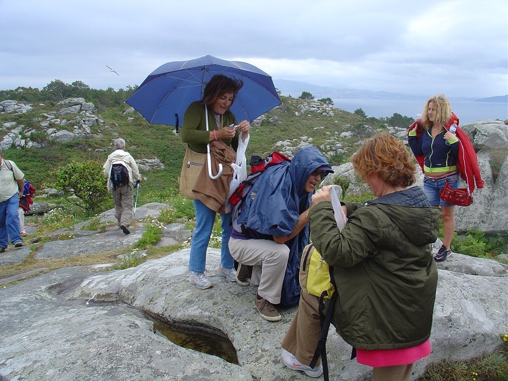 Feita a refeição abrigados do vento forte, iniciamos depois a descida para o parque de campismo, onde fizemos uma pausa de confraternização com alguns companheiros do Fluvial, que também escolheram estas paragens para deslocação. Passamos de seguidas para a ilha do Norte, que atravessamos, até ao Faro do Peito, passando entretanto pelo Areal de Figueiras, que é uma das mais antigas praias de nudistas da Galícia, com o seu extenso areal branco e água límpida, mas agora completamente deserto, pois o tempo estava fresco e desencorajador de práticas balneares.
