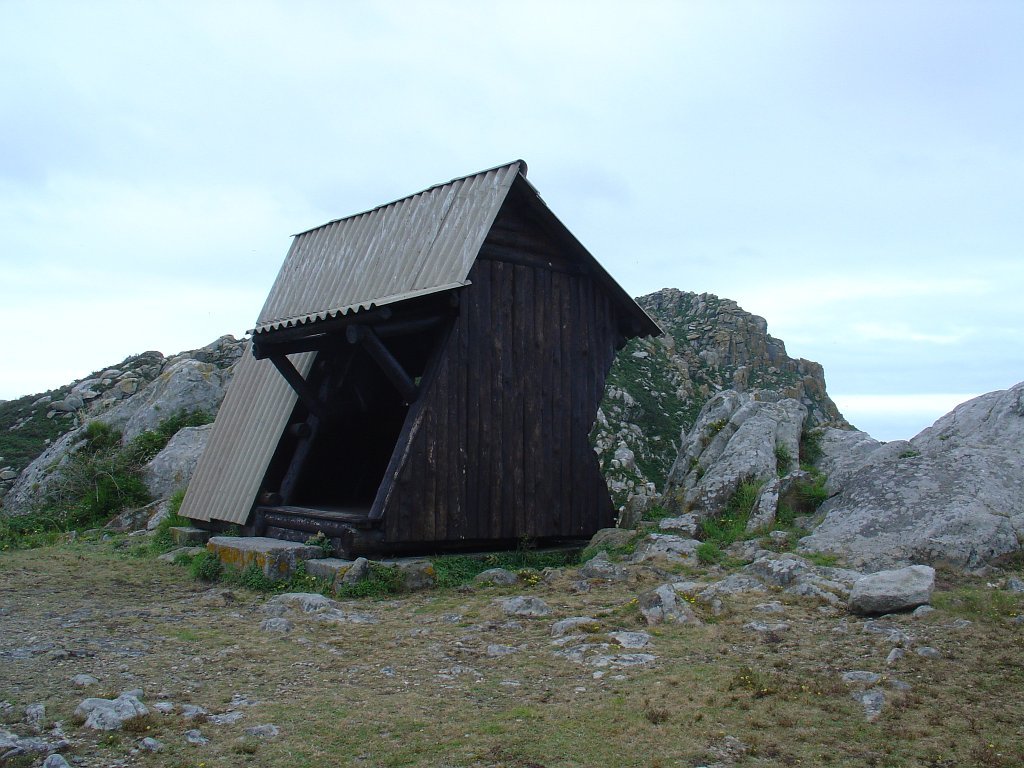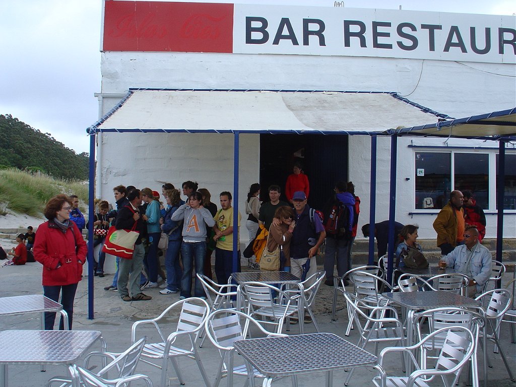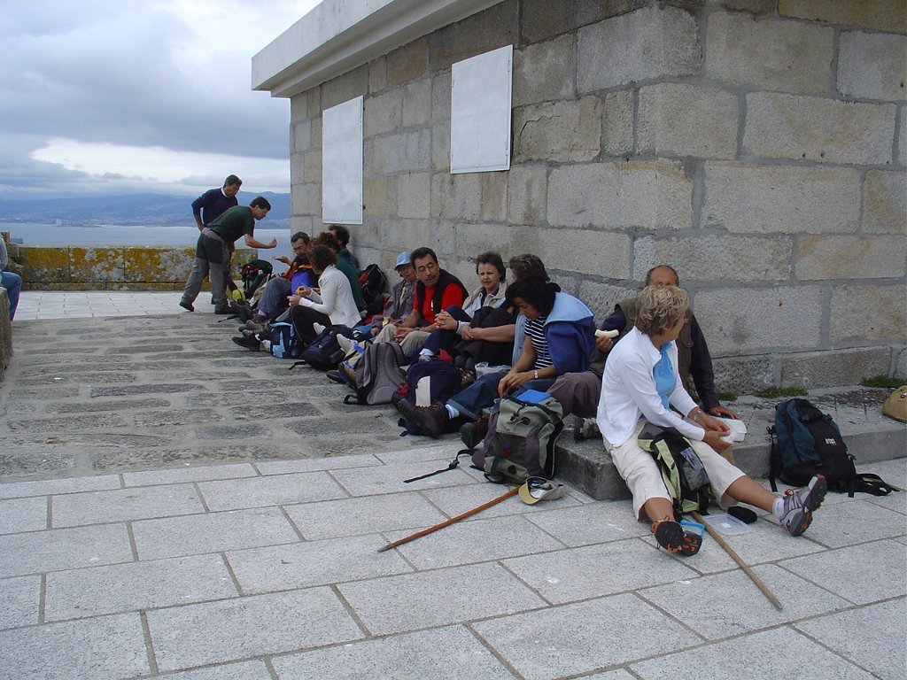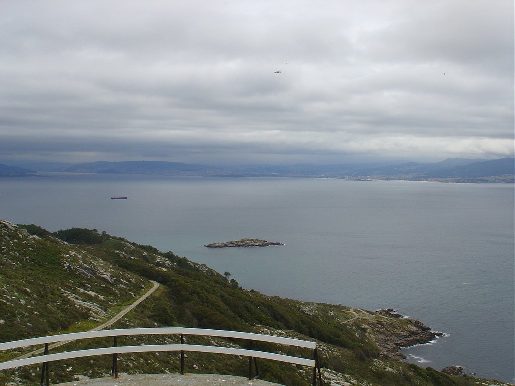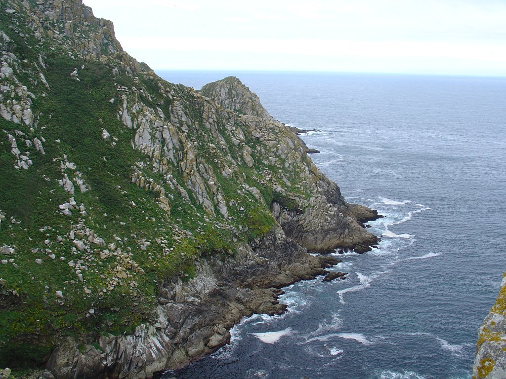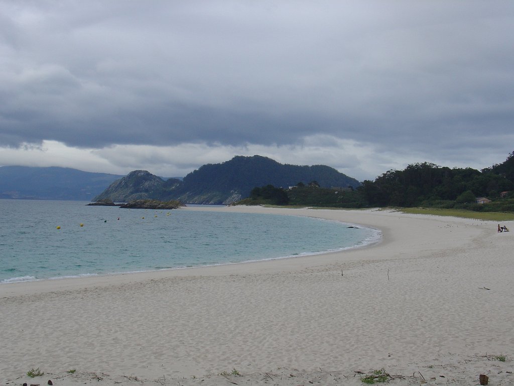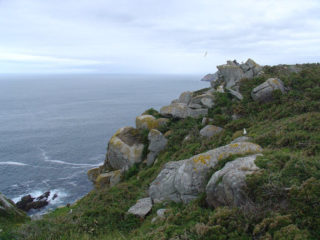 Feita a refeição abrigados do vento forte, iniciamos depois a descida para o parque de campismo, onde fizemos uma pausa de confraternização com alguns companheiros do Fluvial, que também escolheram estas paragens para deslocação. Passamos de seguidas para a ilha do Norte, que atravessamos, até ao Faro do Peito, passando entretanto pelo Areal de Figueiras, que é uma das mais antigas praias de nudistas da Galícia, com o seu extenso areal branco e água límpida, mas agora completamente deserto, pois o tempo estava fresco e desencorajador de práticas balneares.