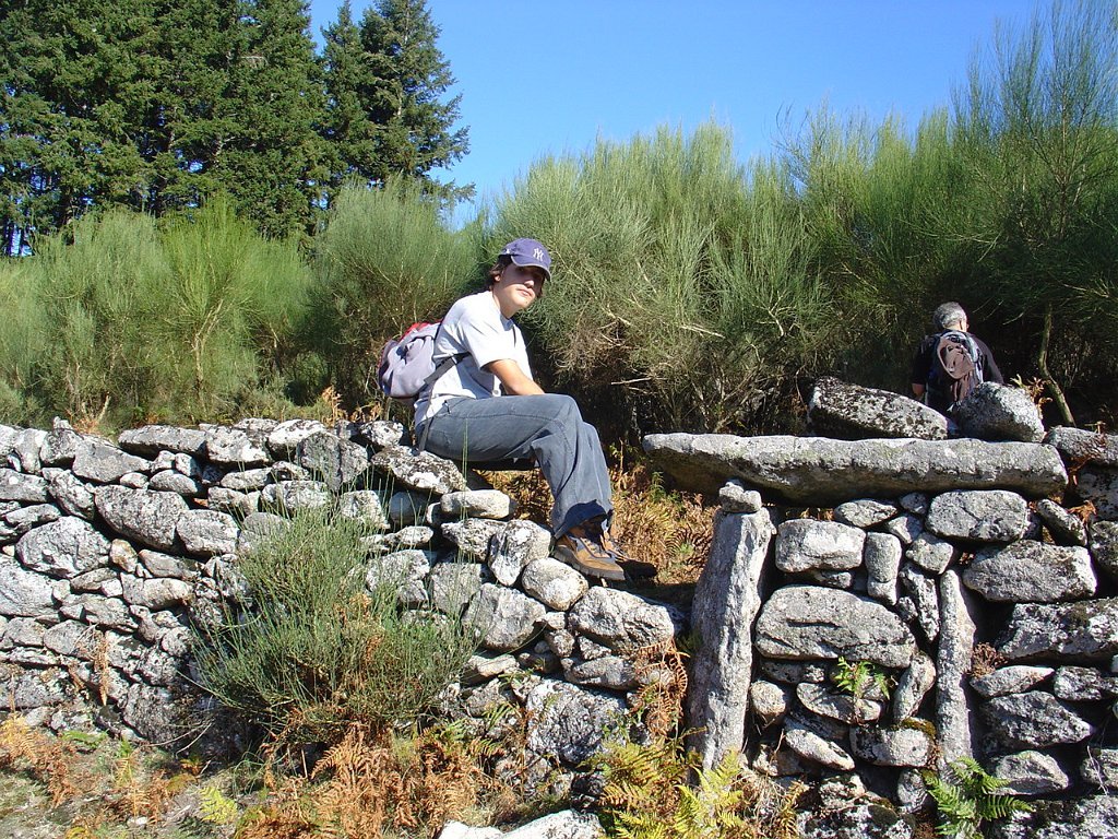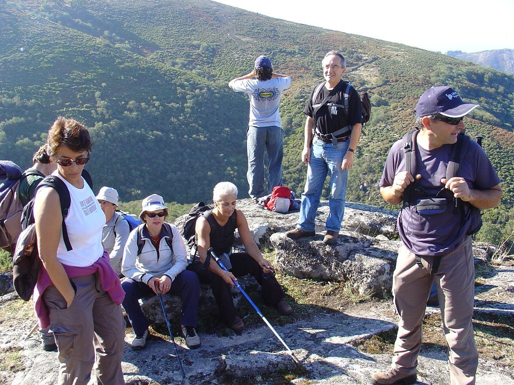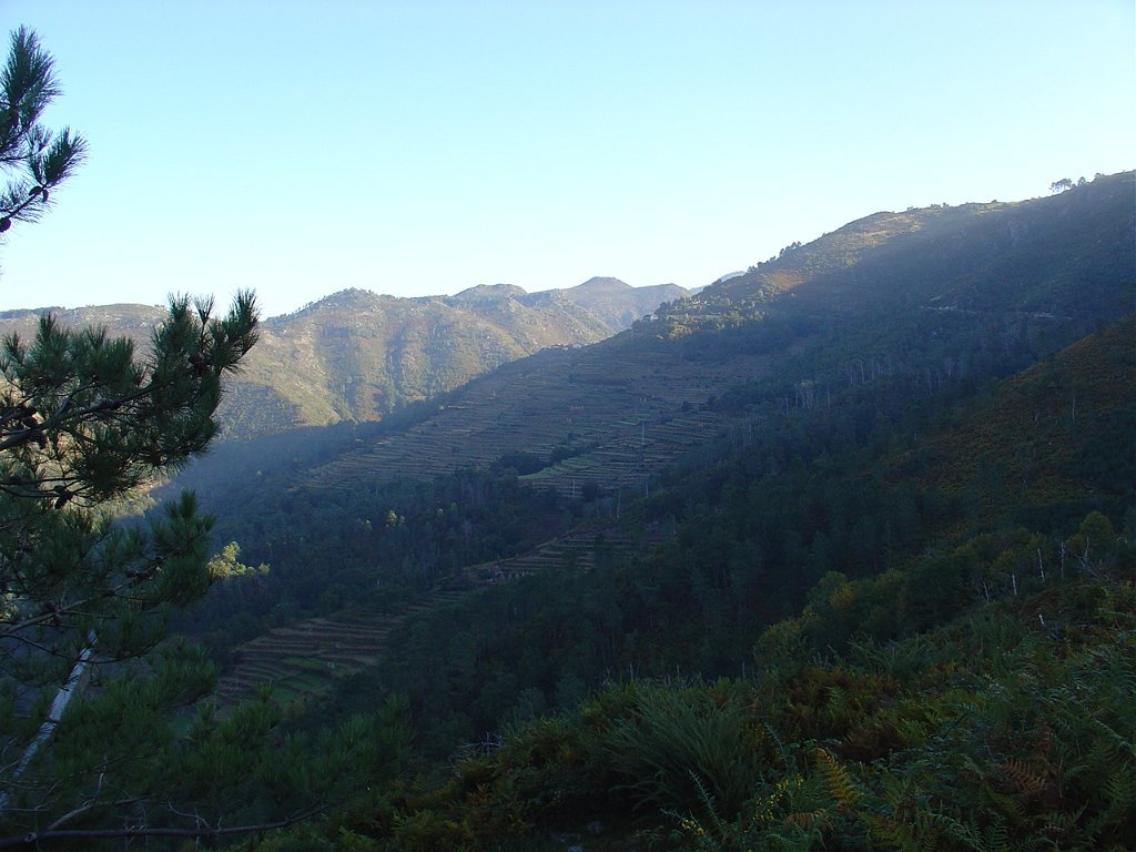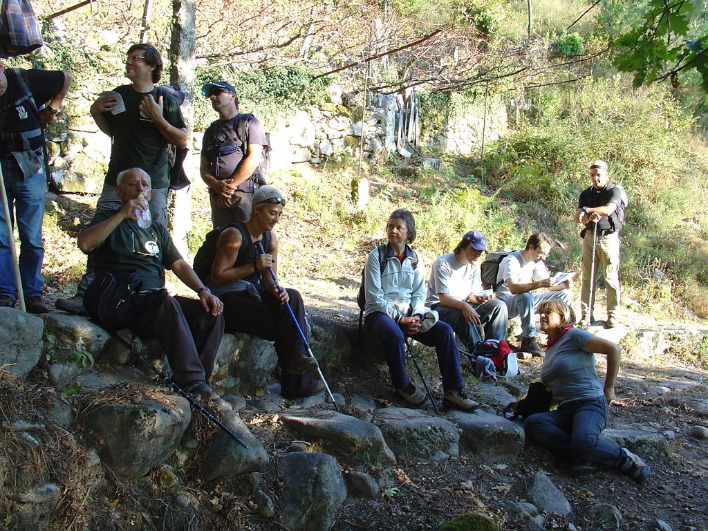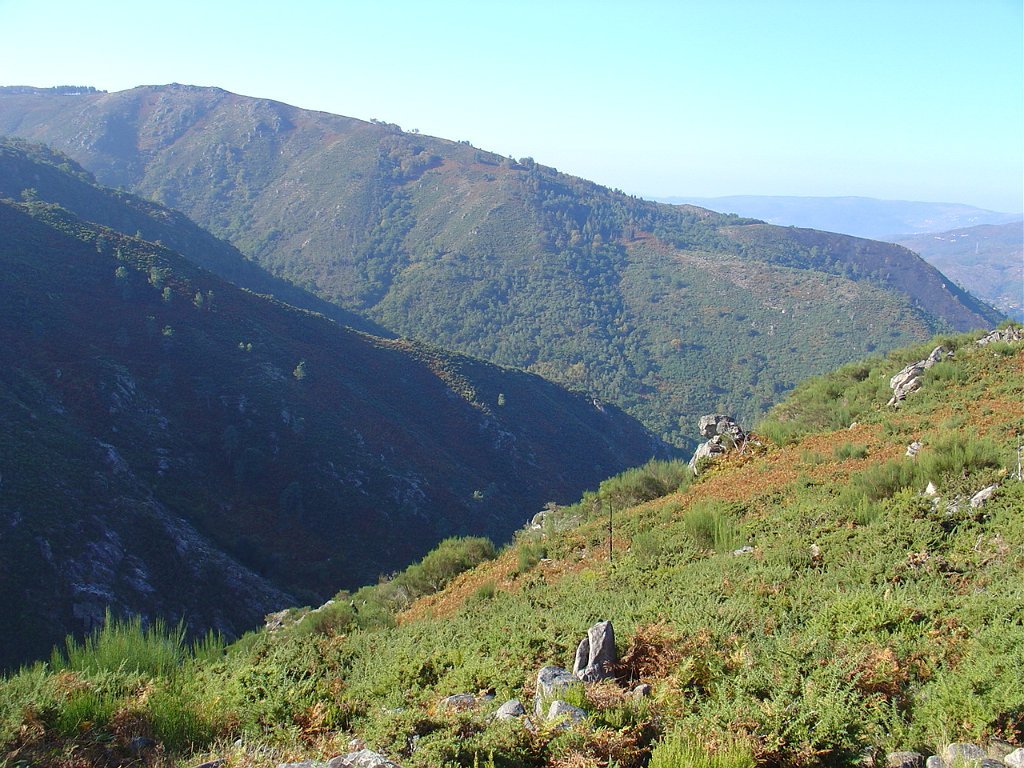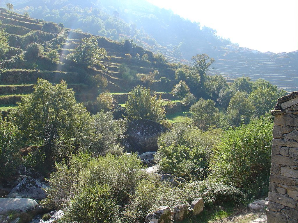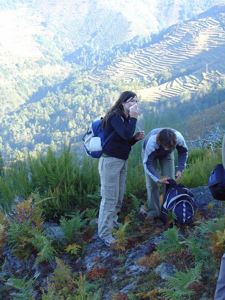 Aí fizemos a já tardia pausa para almoço num socalaco junto às alminhas, observando o interessante a vertente pedregosa do Rio Vez, rodeado de inclinados socalcos.