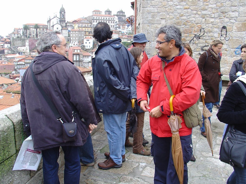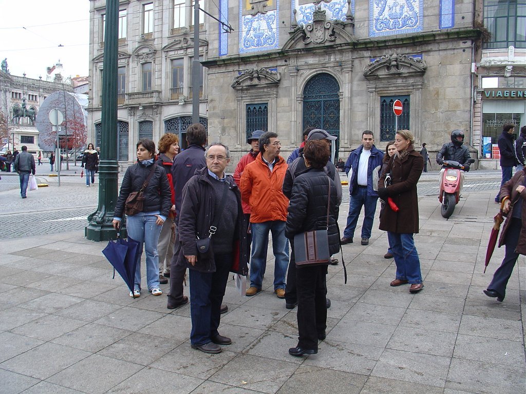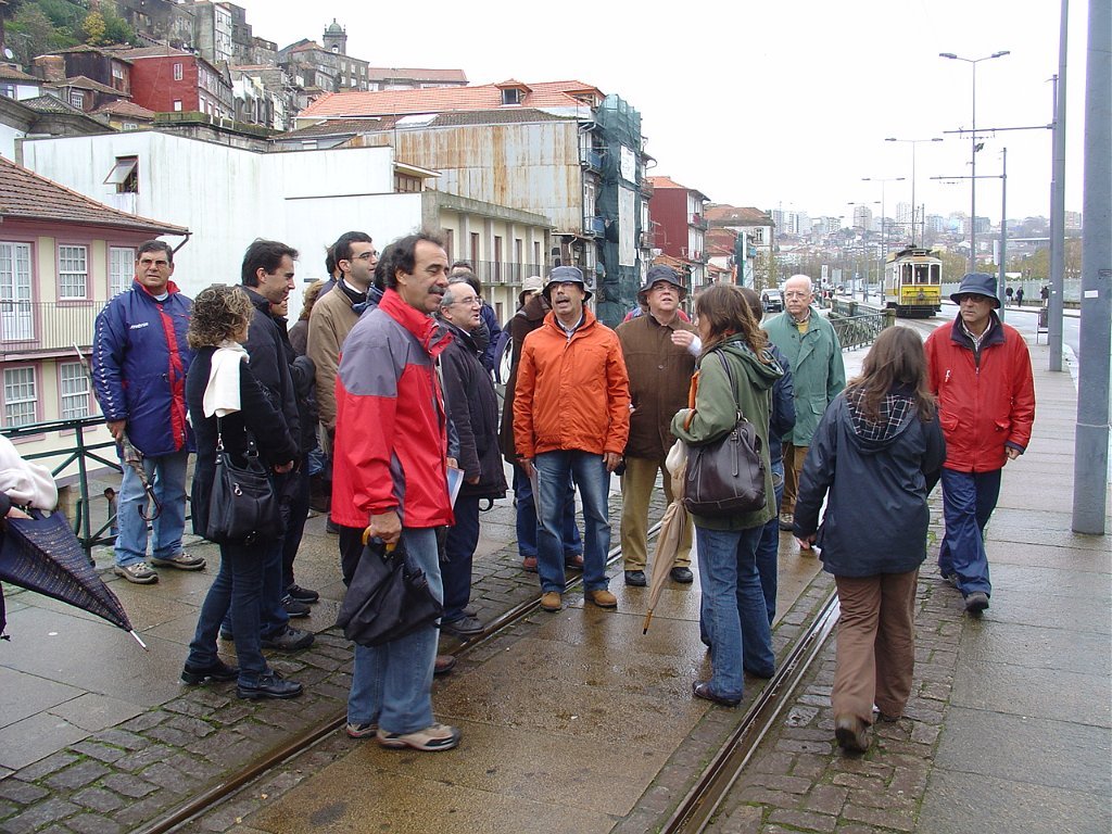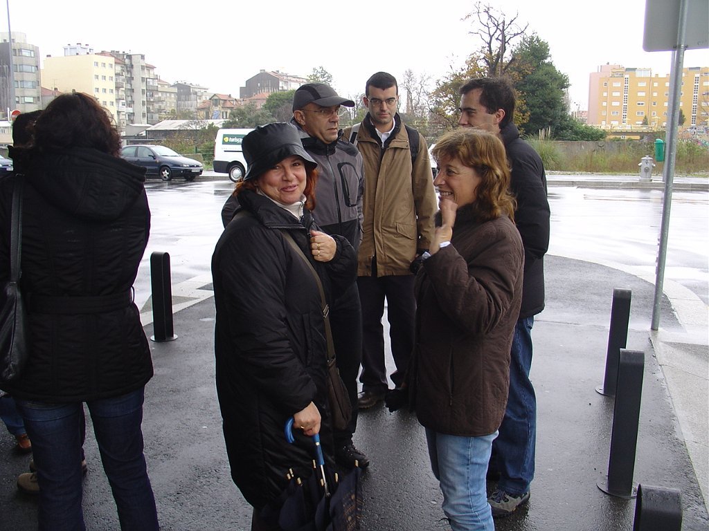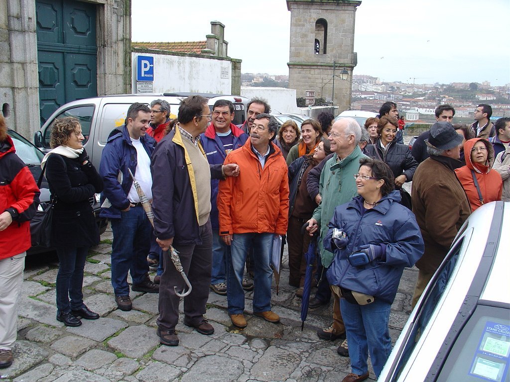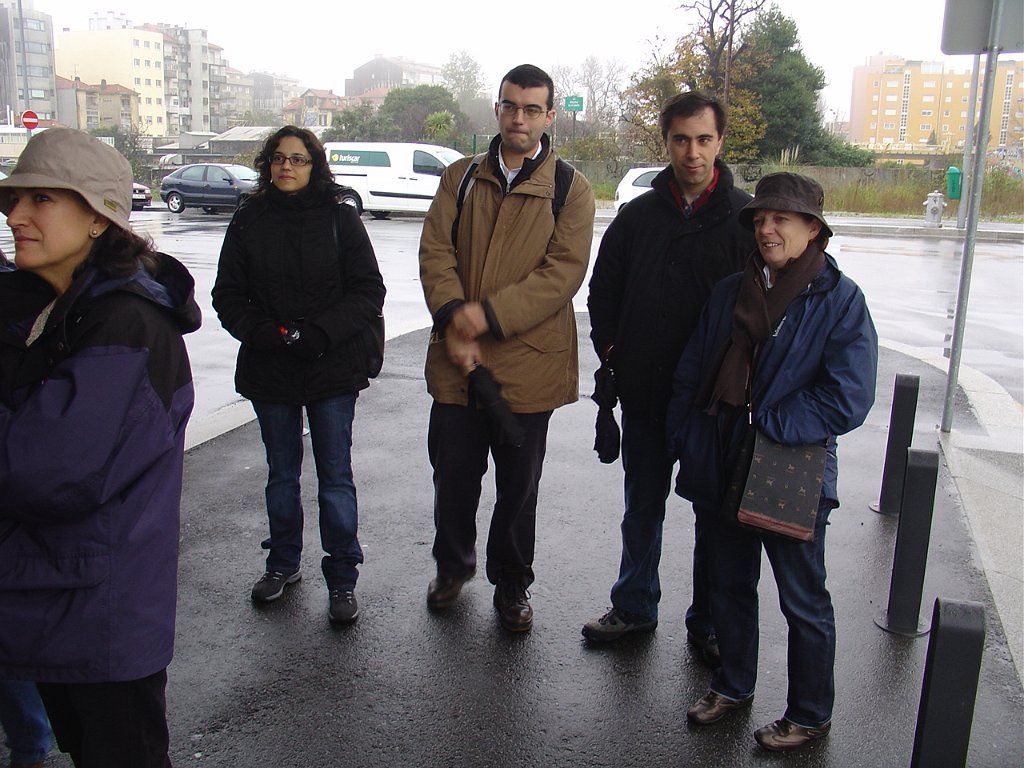 Abrigados na-e-à-pala do Souto Moura, os participantes ouviram algumas razões, explicações e conselhos sobre o programa previsto: desde logo a falta da habitual “folhinha”, não só por preguiça mas por receio que o tempo não permitisse cumprir o GUIÃO gizado e fosse preciso improvisar, falha que seria suprida por 3-guias-3 no terreno, cicerones autóctones habilitados a VER marcas inexistentes até, e outras tretas sobre trânsito-em-cidade e afins. Ligado o GPS do Castro Almeida, que além dos registos topográficos é o autor das notáveis fotografias (e etc.) que ilustram os nossos passeios – provedor-mor de um precioso arquivo de 10 anos - abertos os guarda-chuvas, seja oqDquiser ! e partimos.