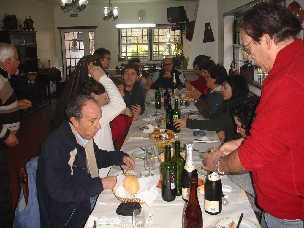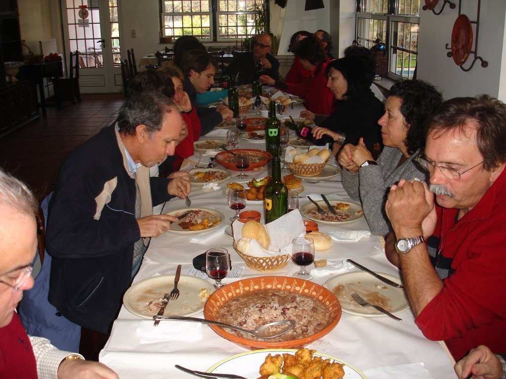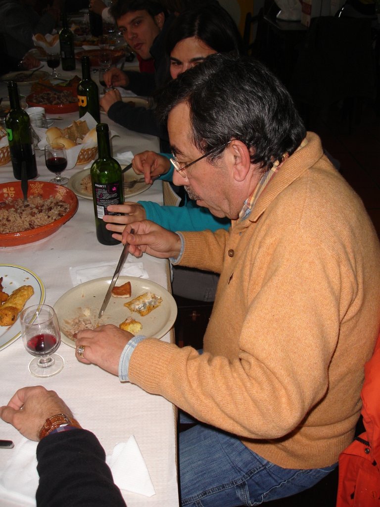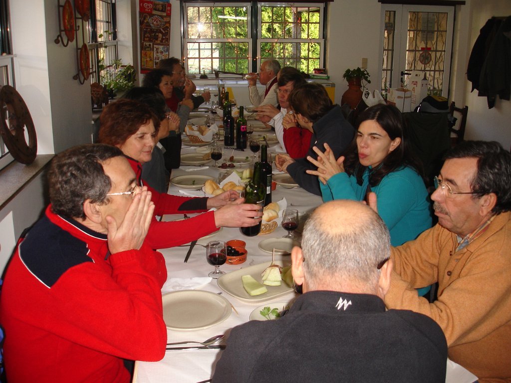 As entradas já estavam em cima da mesa, seguindo-se uma sopa á lavrador, arroz de feijão com pataniscas á moda de Montalegre, leite-creme na sobremesa não faltando o bolo-rei e o espumoso. Para acompanhar tudo isto o caminheiro Pimenta brindou o grupo oferecendo vinho BRONTE em garrafas individuais e de castas diversas (Cabernet, Merlot e Syrah).