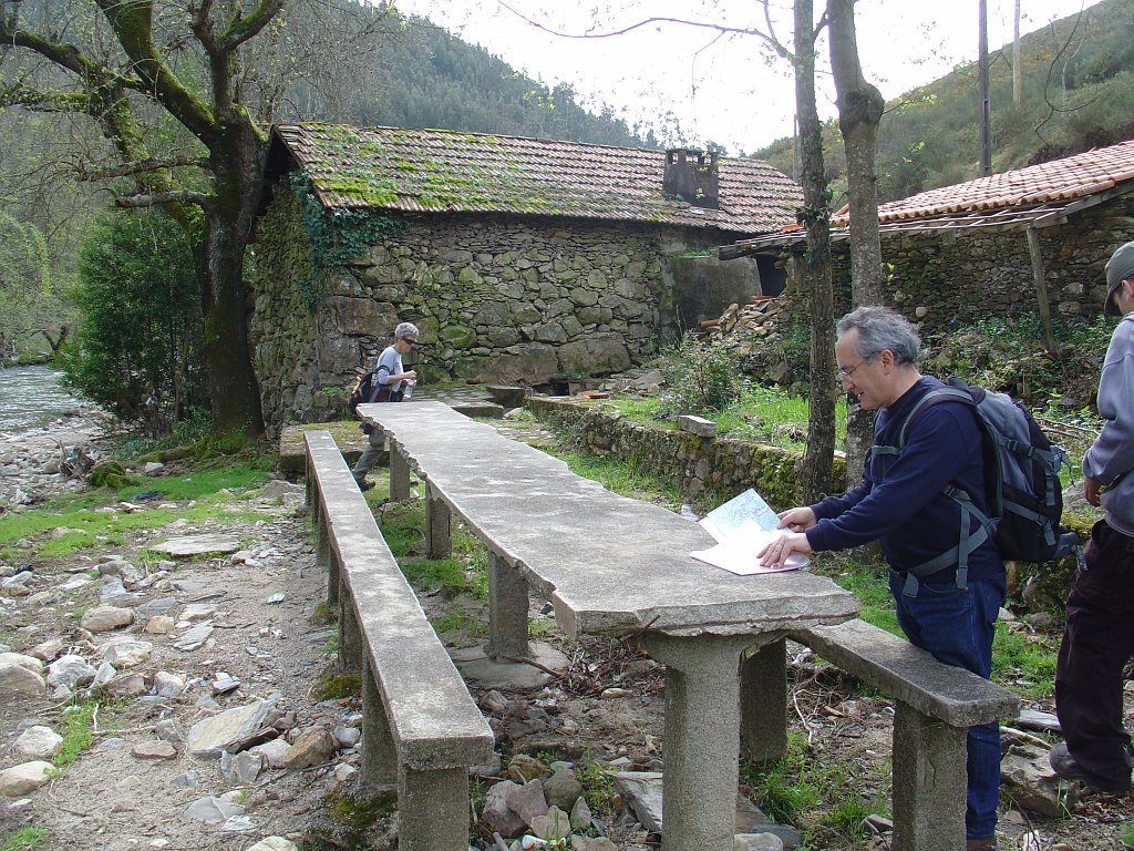 Junto ao rio, uma providencial e grande mesa de “pedra” (bem, afinal era de cimento) com dois compridos bancos, na Azenha do Vicente, foi excelente solução para o repasto. Um breve descanso, num local bastante aprazível.