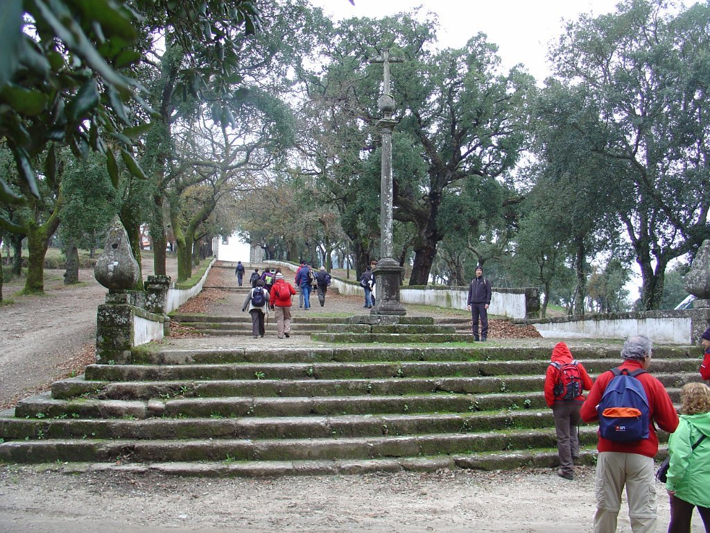 A tarde, depois de um almoço daqueles é sempre difícil, pelo que o cansaço ia provocando danos, começando a alongar o grupo, mas os gritos de alento do Parente deram-nos um ânimo redobrado, pelo que obedecendo ao seu impetuoso comando e fazendo das tripas coração, lá fomos progredindo em conjunto, vencendo mais esta provação.cadarias laterais do templo, seguindo-se a descida para o local de início.