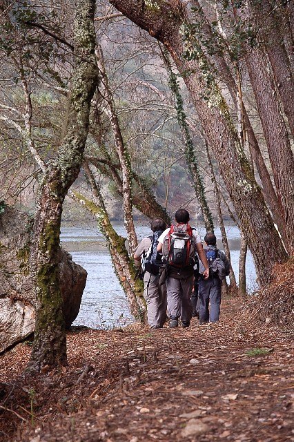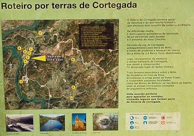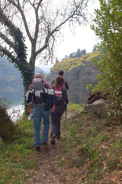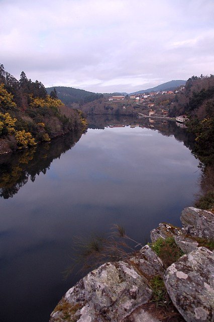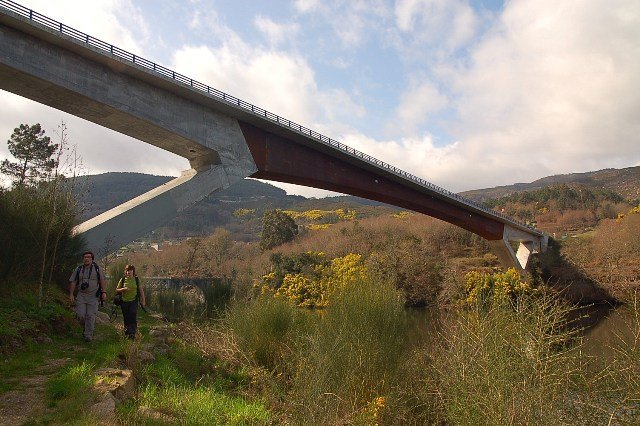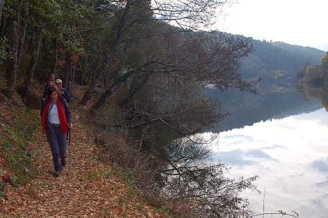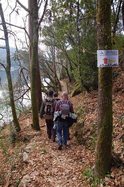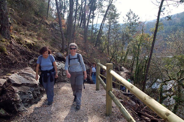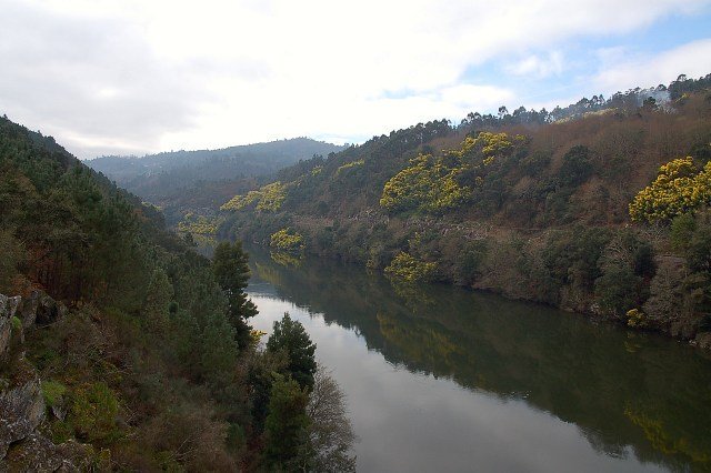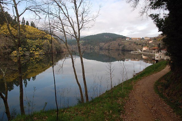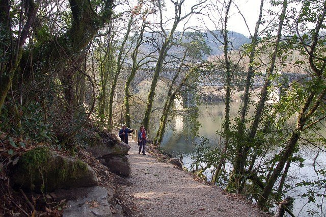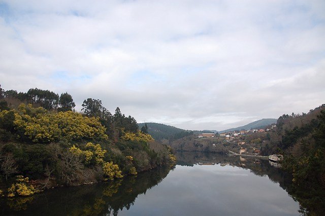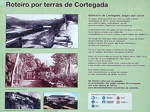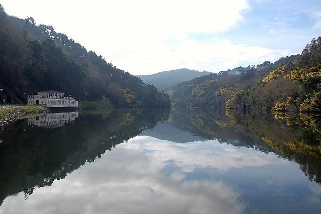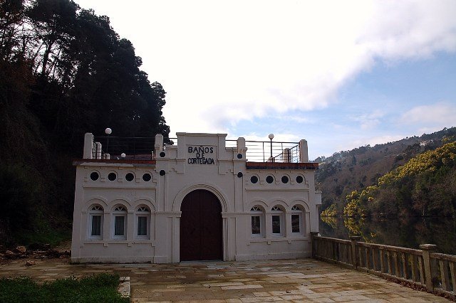 As margens do Deva e do Minho foram a nossa companhia durante cerca de 13 km, neste dia de Fevereiro morno, solarengo. Percurso limpo, conservado (apreciamos a natureza bem cuidada...),.. trilhos do contrabando? Natureza exuberante, medronheiros, carvalhos, loureiros, pinhos, naturalmente; vegetação a brotar, sinal de Primavera próxima; mimosas floridas, matiz amarelo vivo de encontro às águas da albufeira da Frieira, rio acima até Ribadavia... Balneário de Cortegada de Baños, um palacete modernista recentemente restaurado, cujas águas sulfurosas e ferruginosas a 38ºC de reconhecidas propriedades no tratamento de doenças hepáticas, respiratórias, gastrointestinais, urinárias e da pele, assemelha se a um túnel do tempo, capaz de nos transportar a um passado não muito longínquo, onde se desconhecia o significado de pressão/tensão (stress) ou economia global, contempla imperturbável a serena e cadenciada corrente do rio Minho. Escarpas altas, postal sublime em tons de verde azul de uma natureza bela, muito bela ...; linha férrea Vigo-Orense, ao que consta a custo baixo e velocidade q.b., ligação de uma Galiza moderna, desenvolvida, à Europa, ao Mundo...