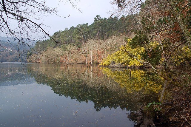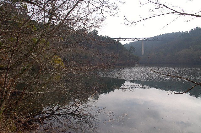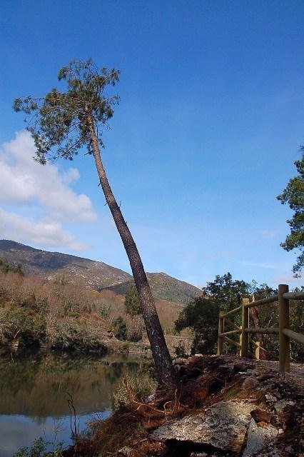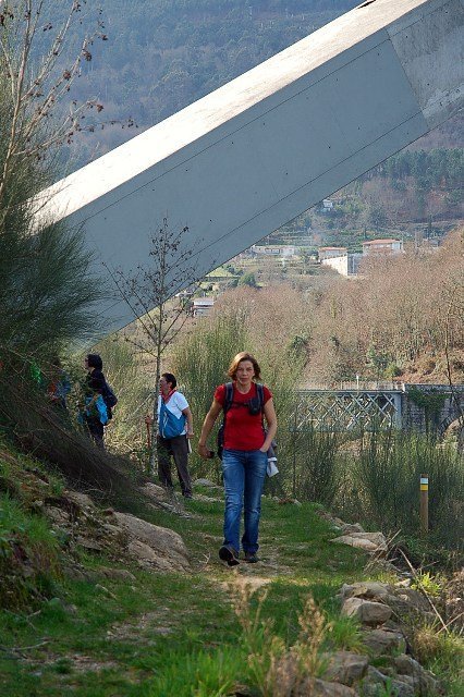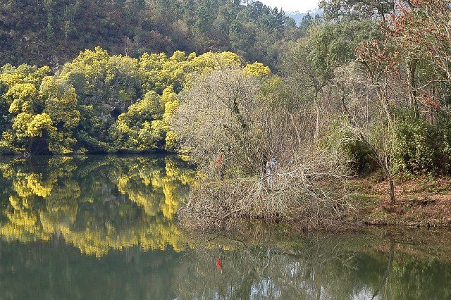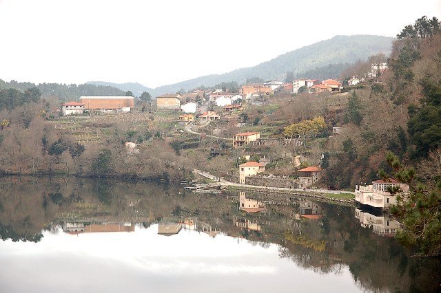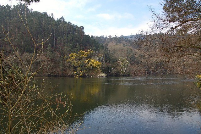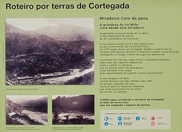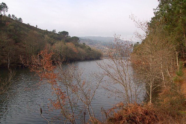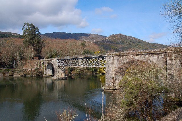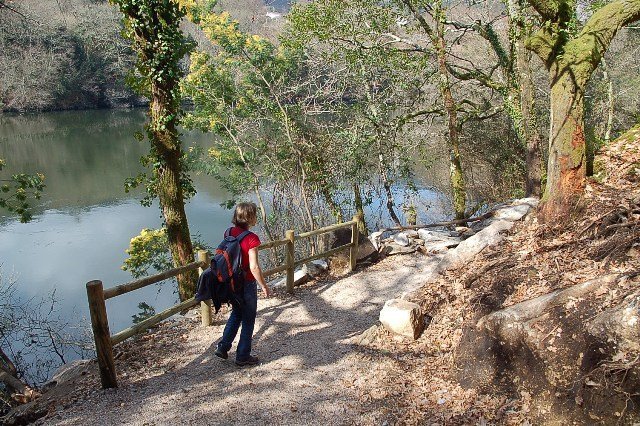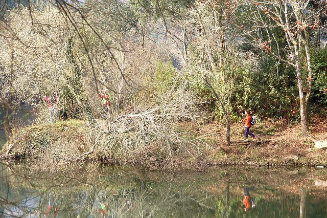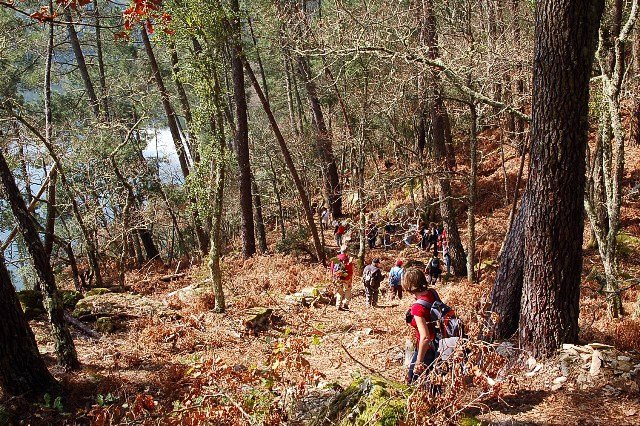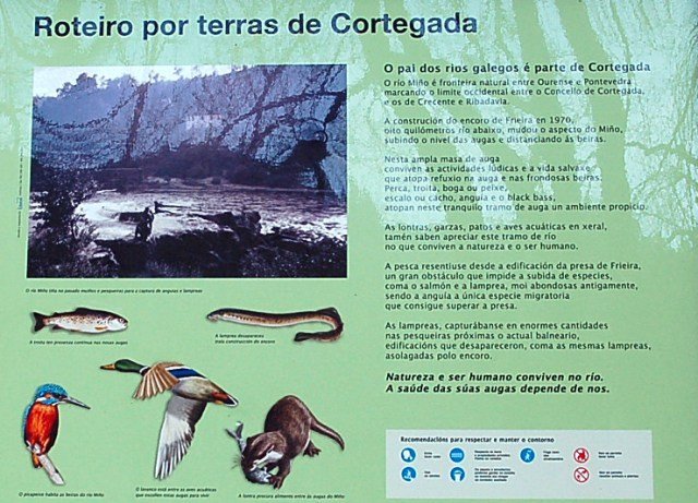 As margens do Deva e do Minho foram a nossa companhia durante cerca de 13 km, neste dia de Fevereiro morno, solarengo. Percurso limpo, conservado (apreciamos a natureza bem cuidada...),.. trilhos do contrabando? Natureza exuberante, medronheiros, carvalhos, loureiros, pinhos, naturalmente; vegetação a brotar, sinal de Primavera próxima; mimosas floridas, matiz amarelo vivo de encontro às águas da albufeira da Frieira, rio acima até Ribadavia... Balneário de Cortegada de Baños, um palacete modernista recentemente restaurado, cujas águas sulfurosas e ferruginosas a 38ºC de reconhecidas propriedades no tratamento de doenças hepáticas, respiratórias, gastrointestinais, urinárias e da pele, assemelha se a um túnel do tempo, capaz de nos transportar a um passado não muito longínquo, onde se desconhecia o significado de pressão/tensão (stress) ou economia global, contempla imperturbável a serena e cadenciada corrente do rio Minho. Escarpas altas, postal sublime em tons de verde azul de uma natureza bela, muito bela ...; linha férrea Vigo-Orense, ao que consta a custo baixo e velocidade q.b., ligação de uma Galiza moderna, desenvolvida, à Europa, ao Mundo...