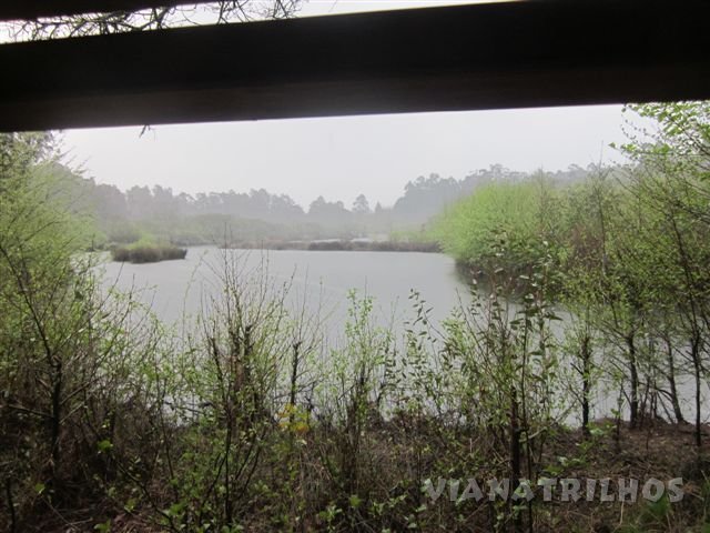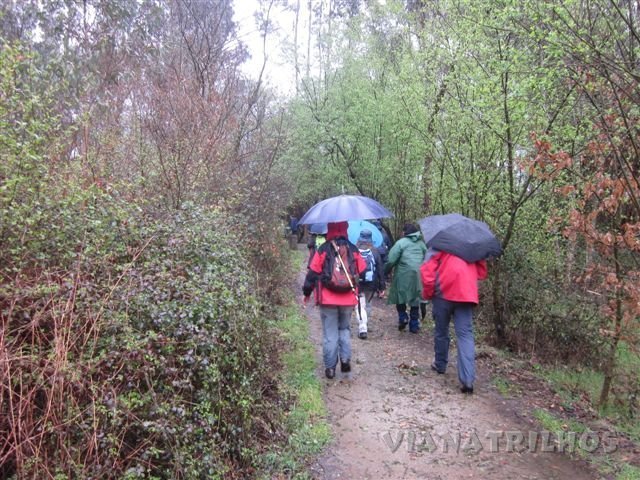 Guarda-chuvas abertos encetamos o percurso através da zona lagunar, tendo como guia a companheira limiana Maria das Dores conhecedora da zona.