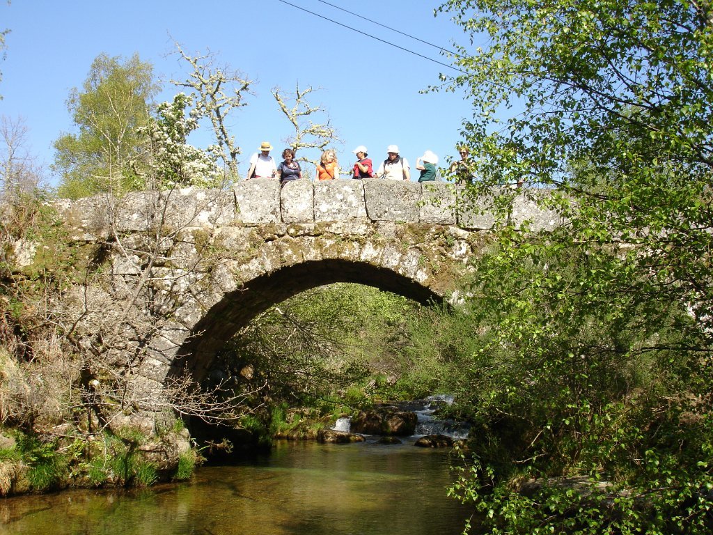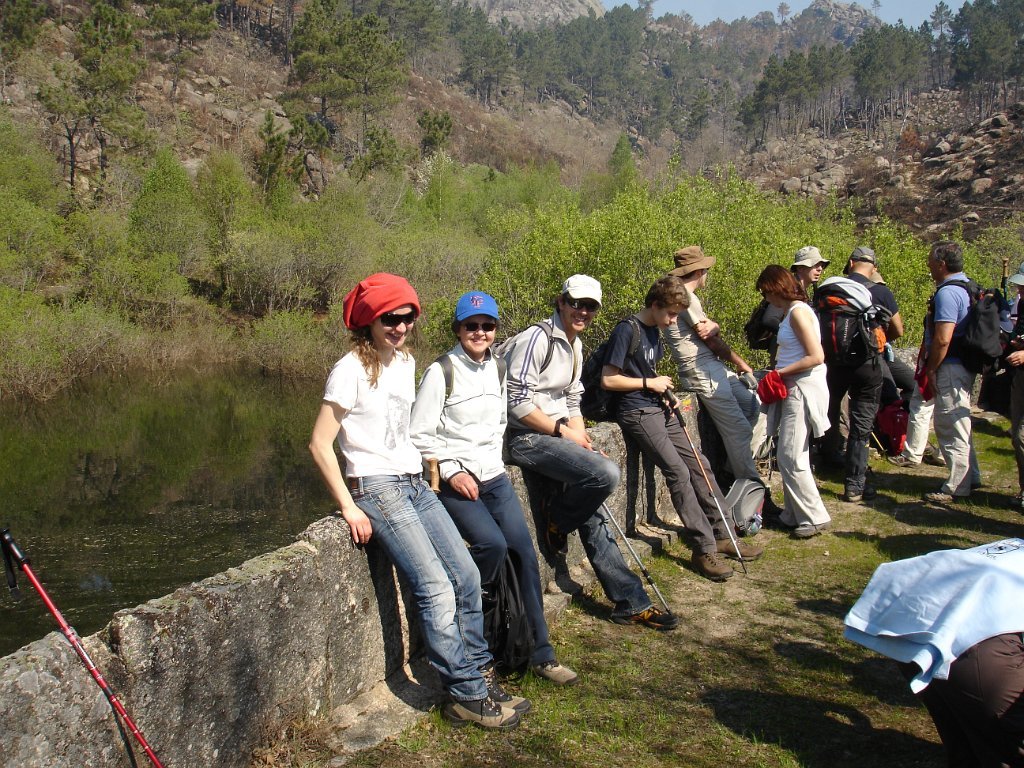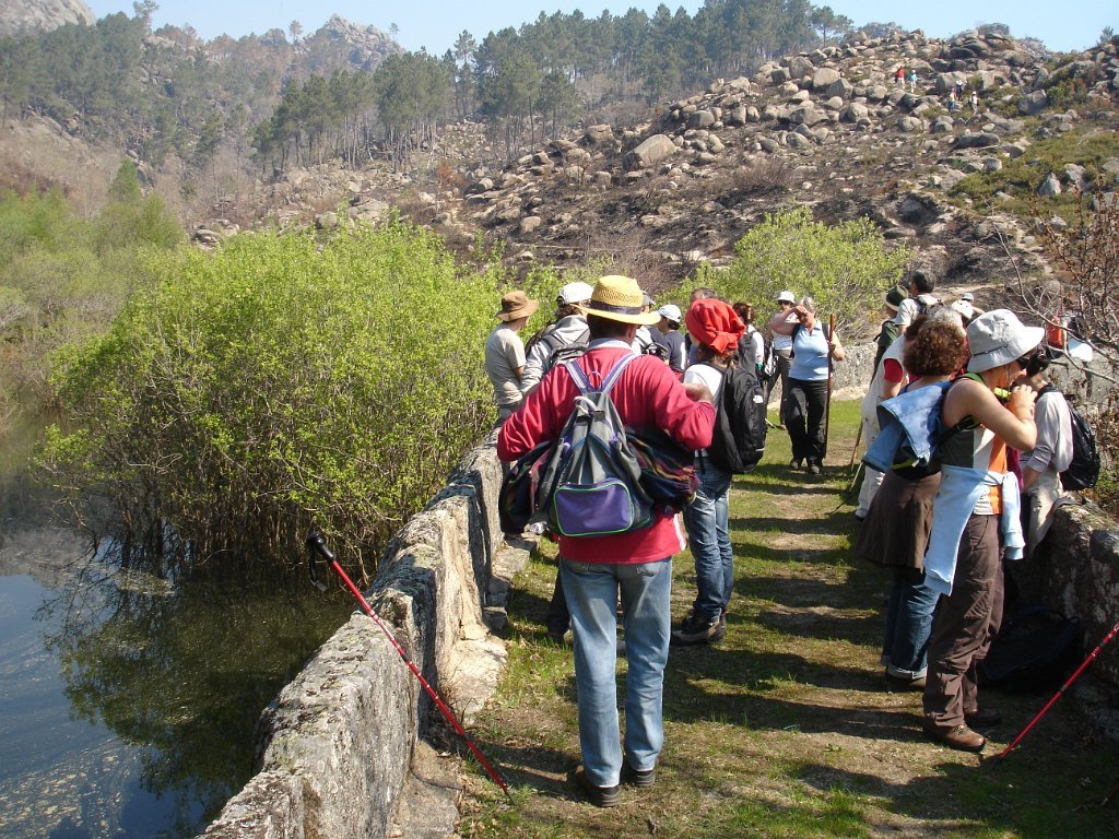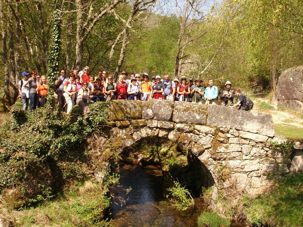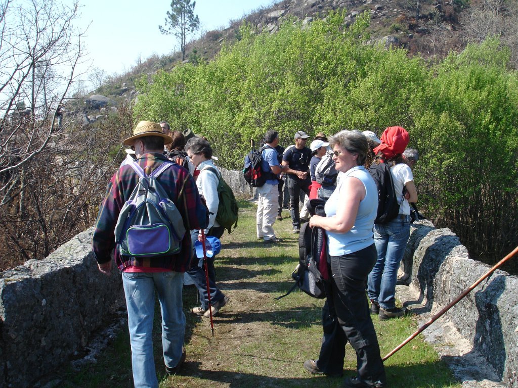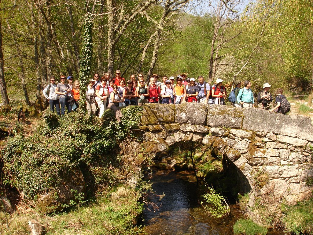 Atingido o primeiro ponto alto logo as vistas se estenderam para o fundo do vale no contraste entre os vários elementos da natureza. Após de uma descida acidentada uma presa de água da serra para regadio, foi pretexto para um registo fotográfico do grupo. Continuamos descendo entre bosque de carvalhos passando pela Inverneira de Barreiro até chegarmos á de Assureira, local onde visitamos a capela de S. Brás e a ponte de mesmo nome, e em que foi aproveitado para mais uma foto do grupo.