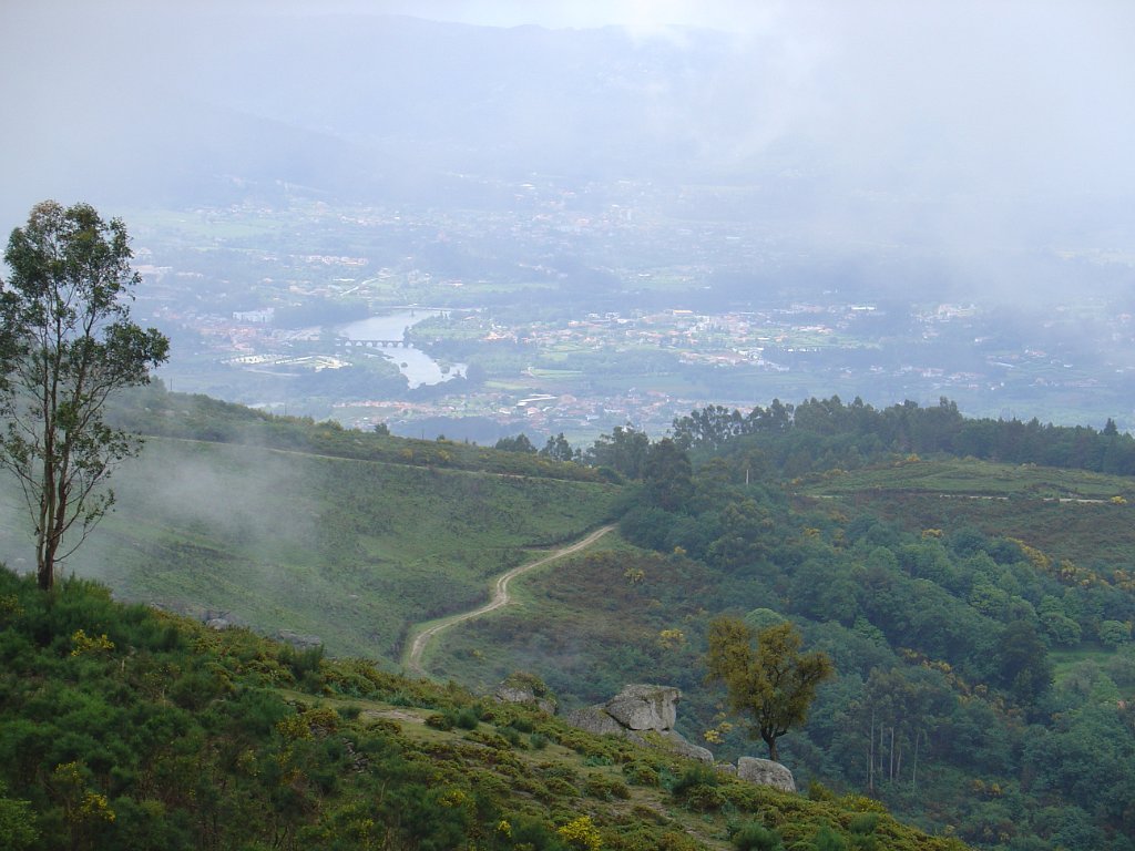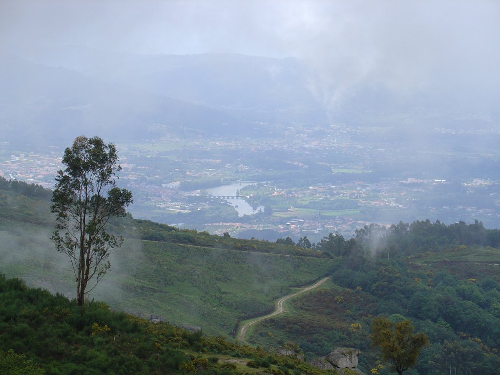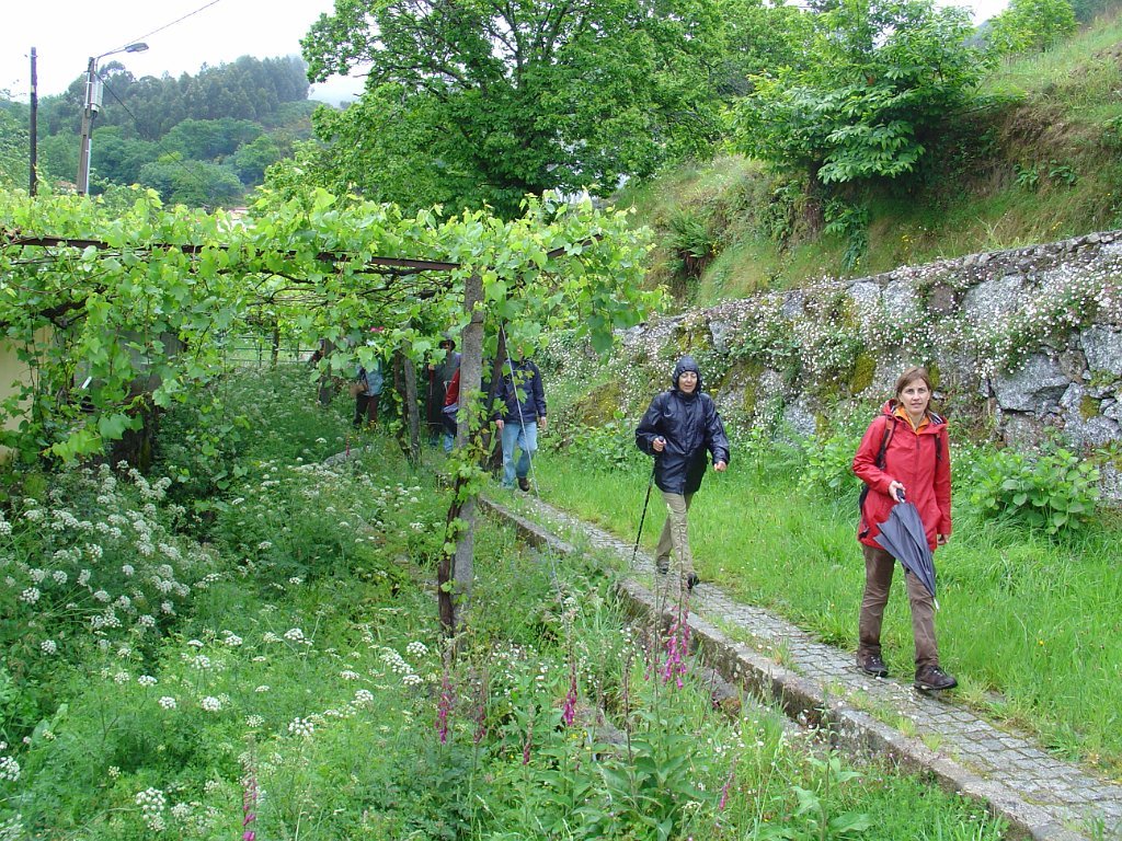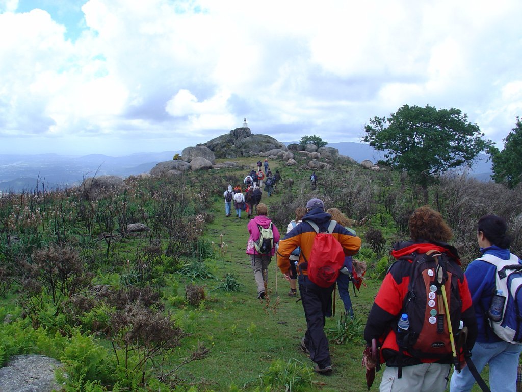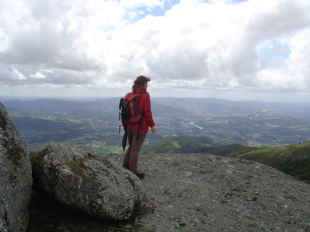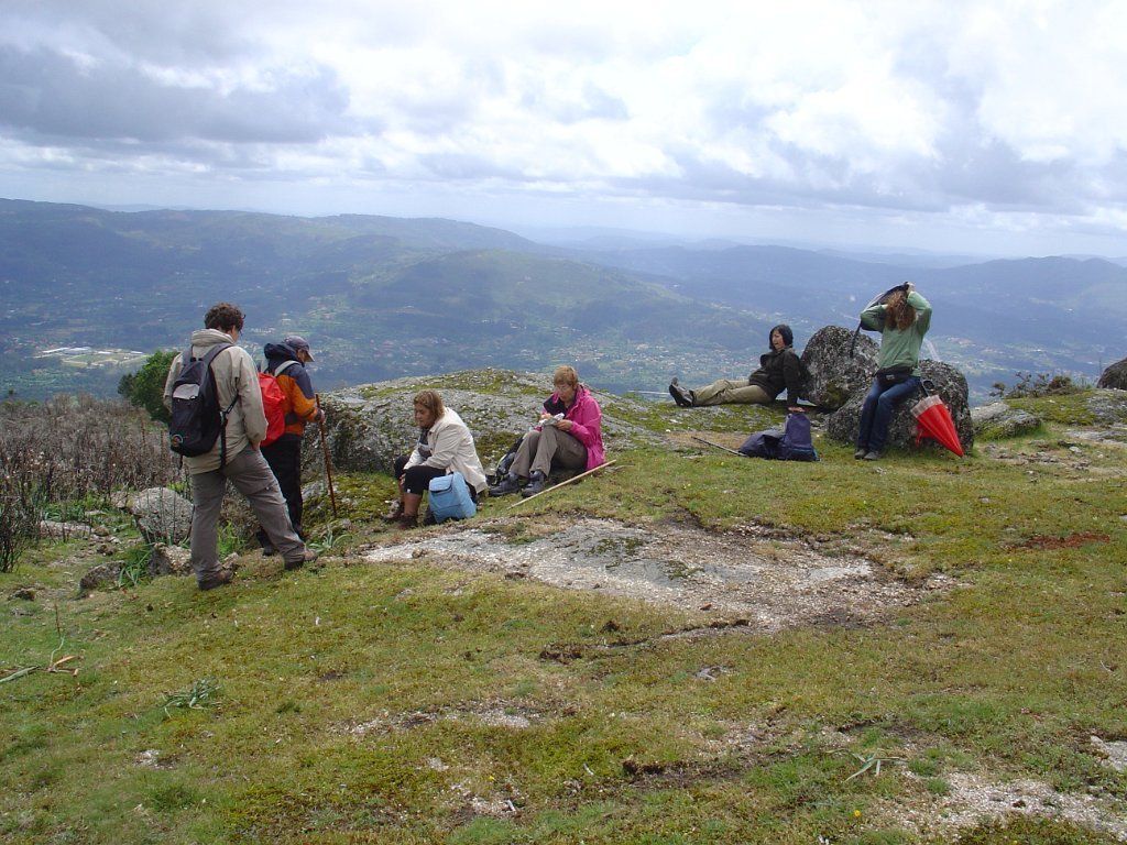 O Miguel aproveitou para destacar a importância do local e as suas tradições, pela citação de texto alusivo, tendo depois sido sujeita à apreciação dos presentes as alternativas de regresso, uma pelo percurso mais longo, com a descida do vale de Lastral apreciando os campos de cultivo, com os seus socalcos, e outra regressando a direito, pelo trilho marcado da Valimar, de modo a escapar à chuva, que continuava persistentemente a cair mansa. A votação foi por aclamação, pelo percurso mais curso, pelo que regressamos a Vilar do Monte, subindo de seguida para o Miradouro da Vacariça. Pelo caminho o tempo começou a abrir, começando aqui e ali a vislumbrar-se as maravilhosas vistas para o Vale do Lima, mas foi no Miradouro da Vacariça – Marco do Penedo Branco, com os seus imponentes 725 m de altitude, em que o sol finalmente rompeu, dando para apreciar demoradamente as vistas circundantes, que vão desde Viana do Castelo a Ponte da Barca e Arcos de Valdevez, com destaque para Ponte de Lima, a nossos pés.