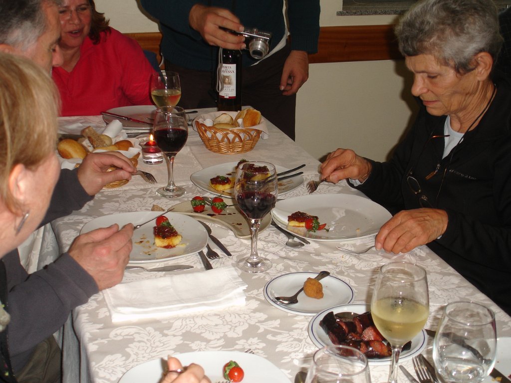 Surge o bacalhau acamado por cebola, uma fatia de fiambre e maionese, acompanhado de puré de batata, com a alternativa de batata frita. O vinho verde branco ou tinto primava pela boa pinga, não faltando o bolo-rei da crise, trazido pelo Ernesto, o leite-creme, o café e ponto final. Excelente serviço, como poucos, parabéns, restaurante Anabela!O convívio redundou num vira geral, com elementos do grupo de cavaquinhos da paróquia de Sª de Fátima. Ao ritmo do folclore minhoto, a caminheira inglesa Louise nem acertava o passo, nem o compasso.