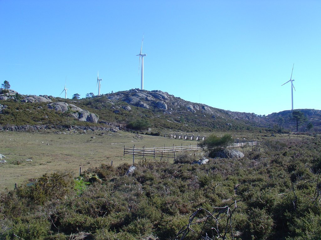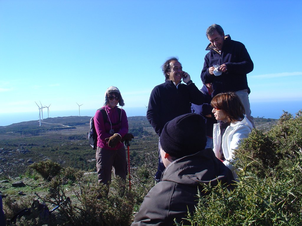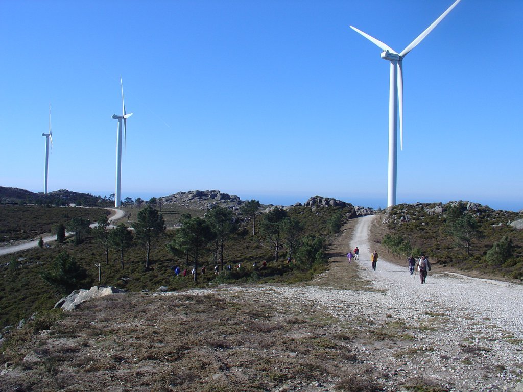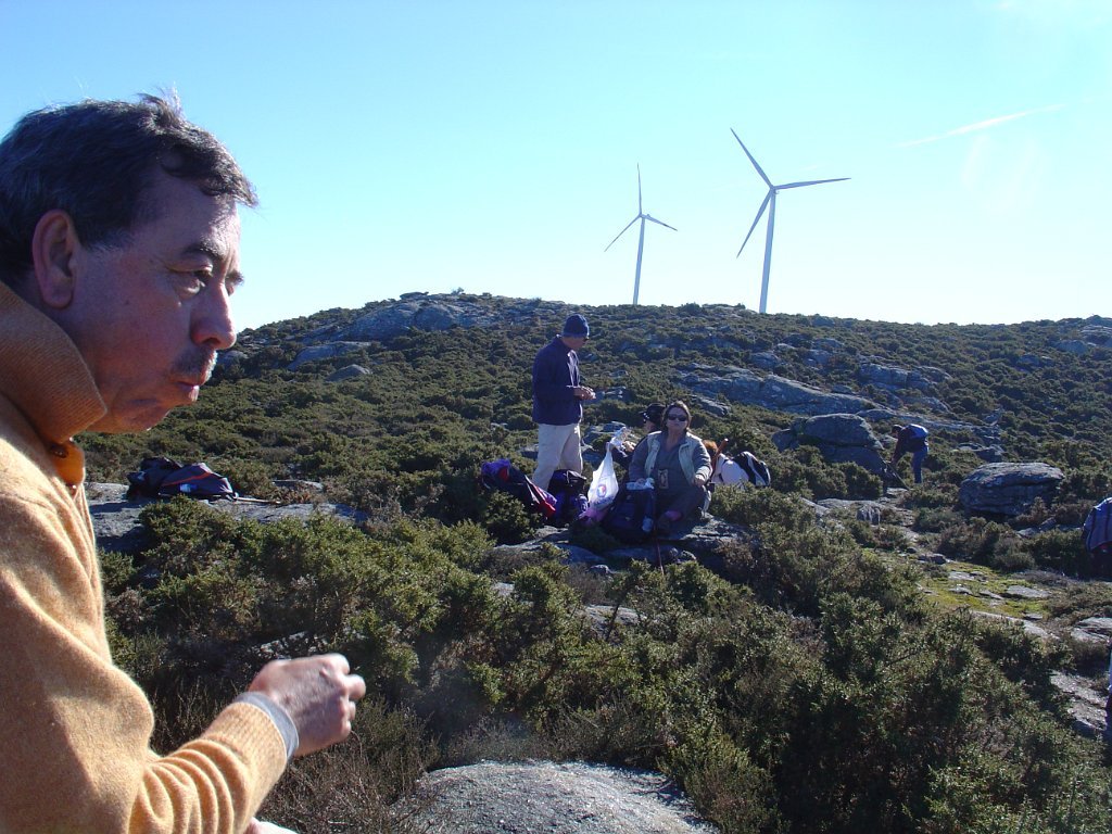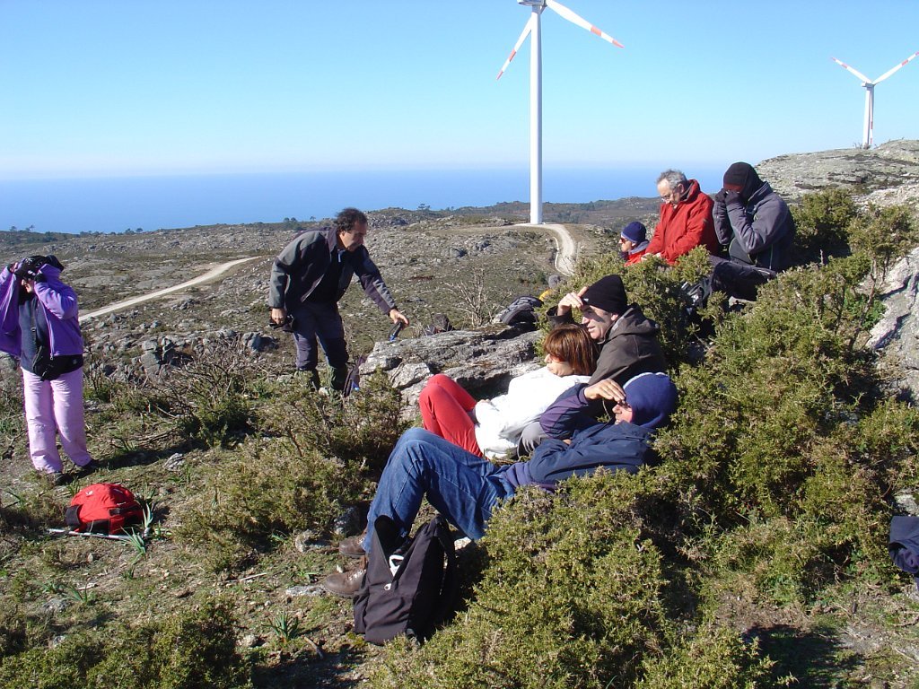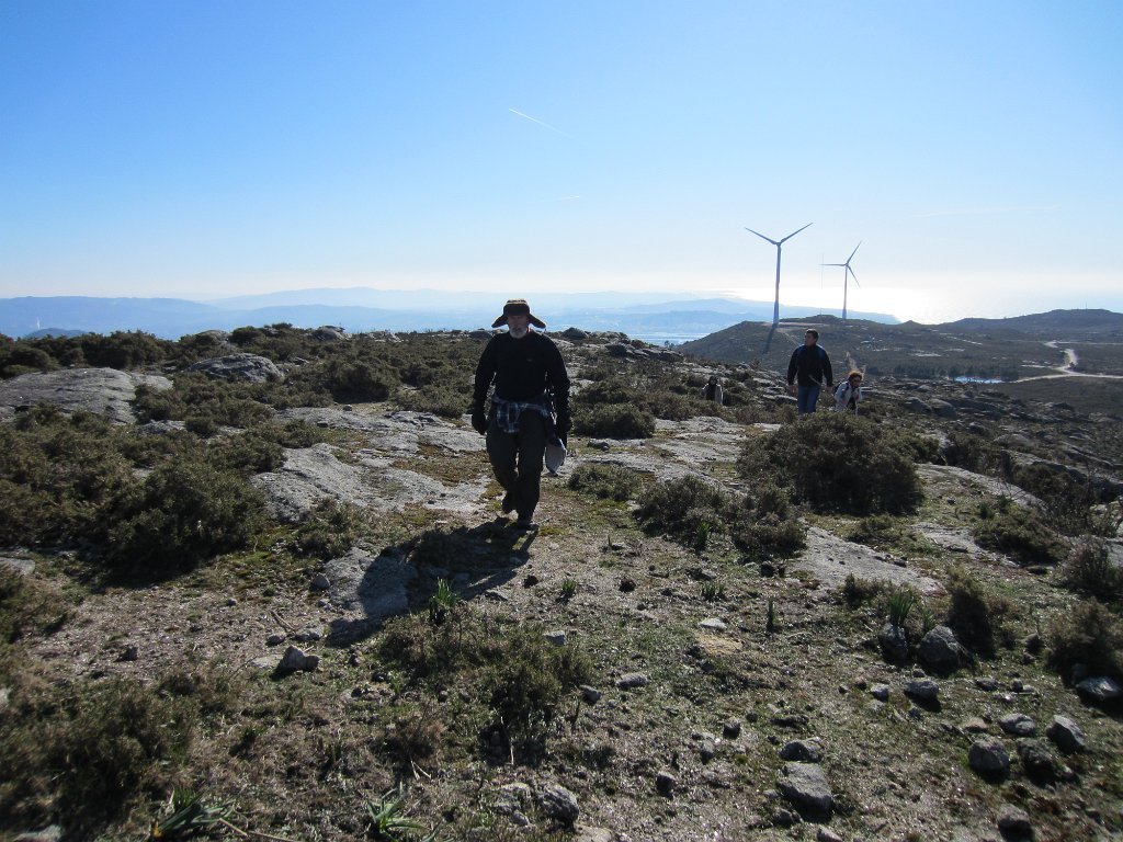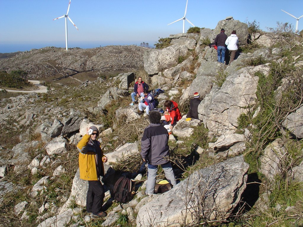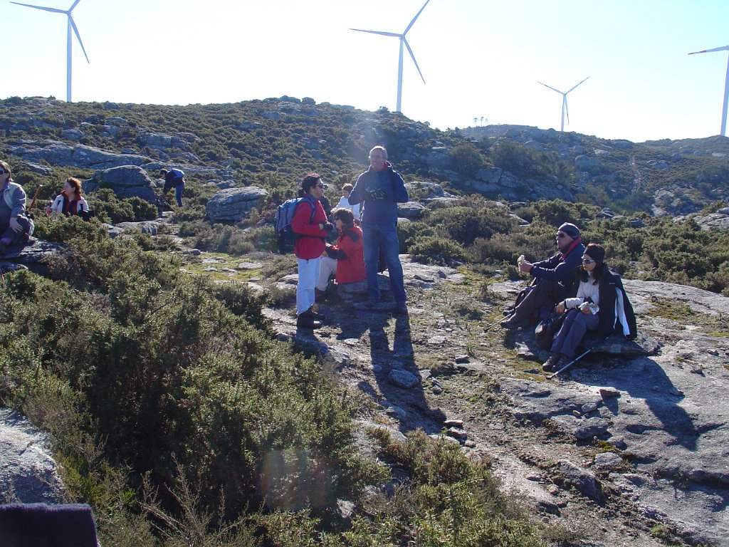 Já agrupados, seguimos por trilho estreito, observando a paisagem e subindo sempre a encosta, aproveitando o monumental lajedo granítico, até finalmente chegar ao planalto da chã de Afife, com as torres eólicas bem alinhadas à nossa frente, onde paramos para “meter qualquer coisa à boca”.