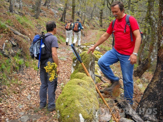 Atravessamos a estrada e logo adiante metemos á direita por uma outra calçada e fomos embrenhando por entre uma admirável mata de carvalhos com a vegetação desabrochando, em direcção ao meio da abrupta encosta contornando o relevo do terreno, lá mais abaixo no fundo do vale corre o rio do Germil, aqui e ali com recantos muito bonitos semeados de moinhos agora abandonados, assim como muitos socalcos de antiga lavoura do vale, outrora sustento da povoação.