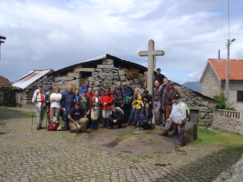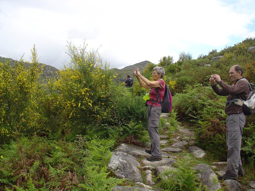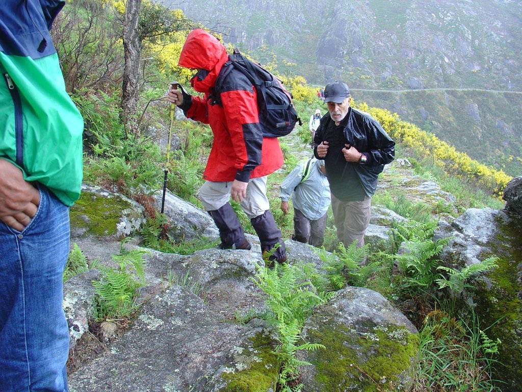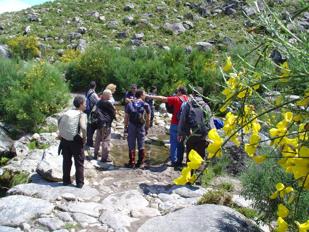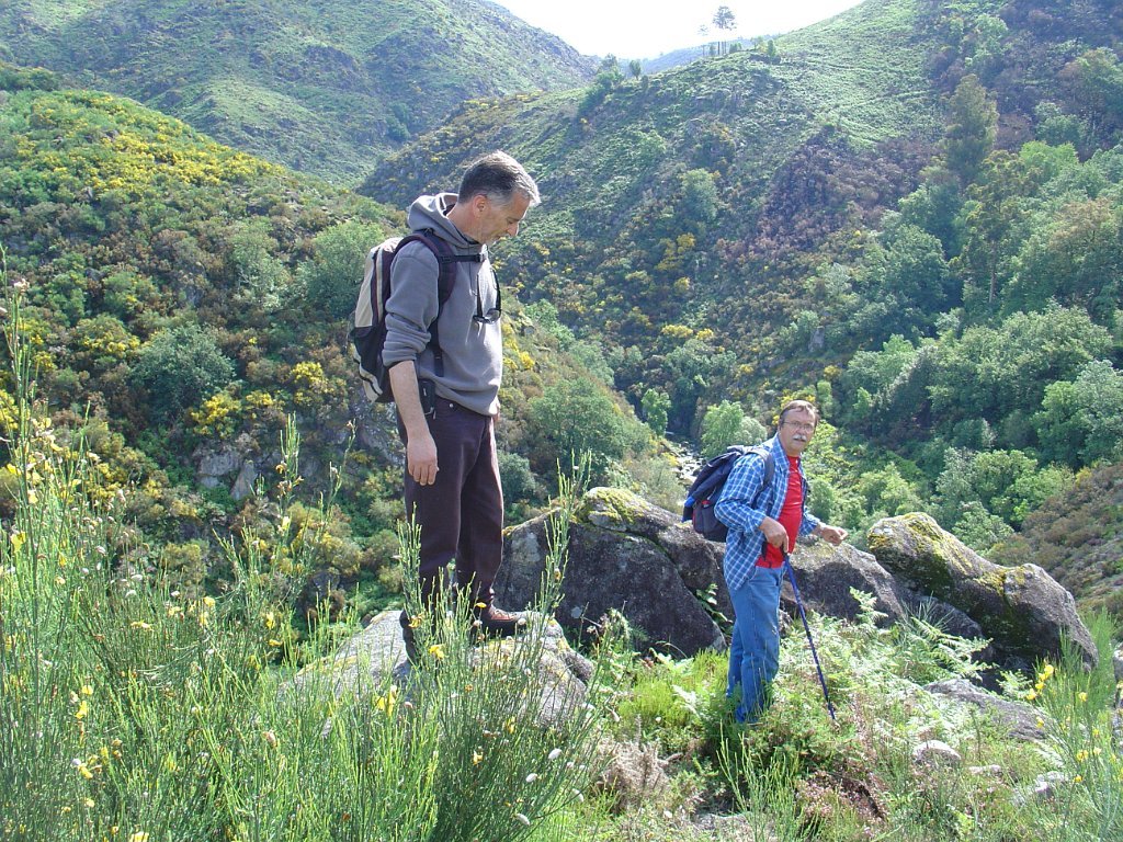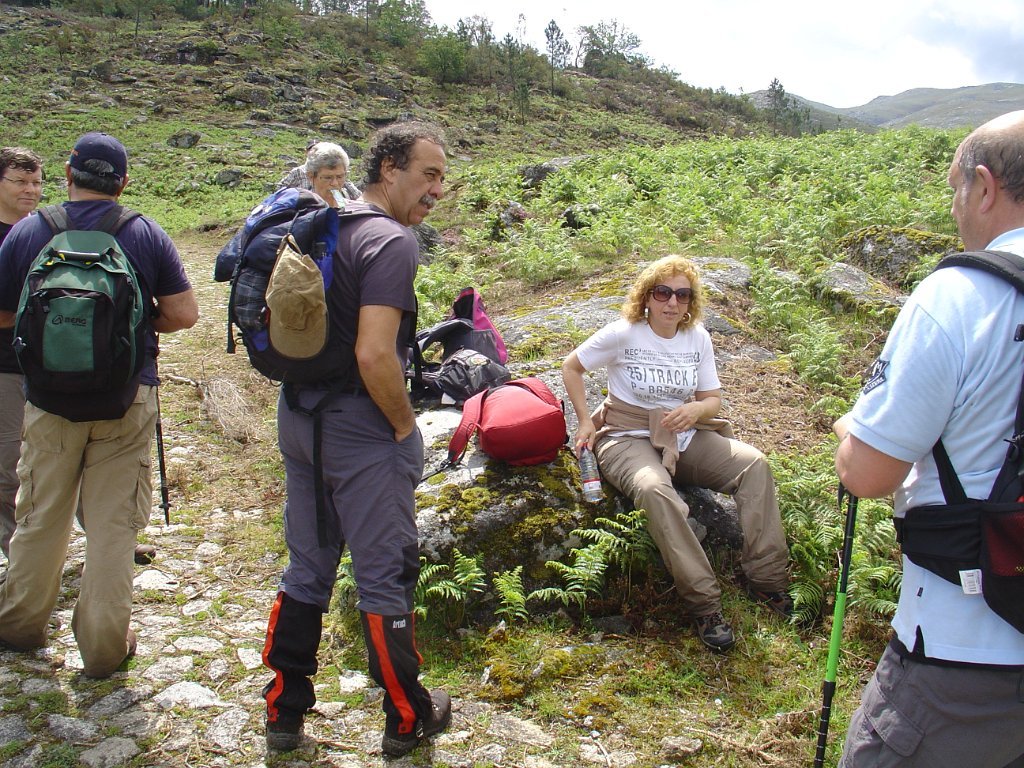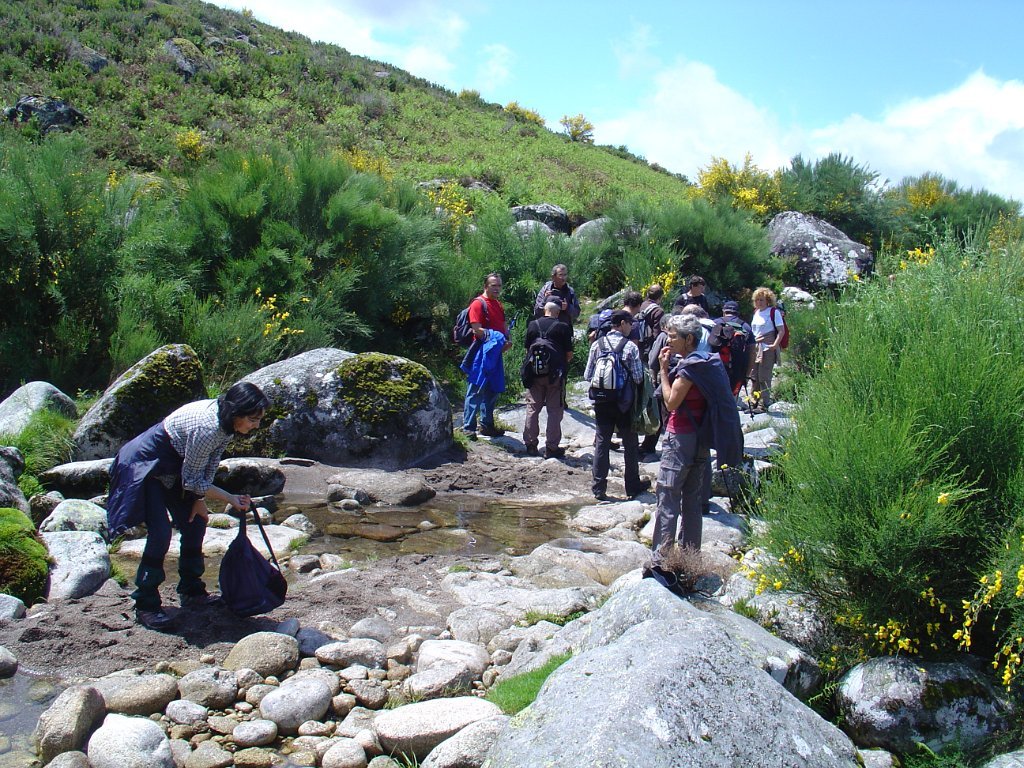 Lá atravessamos nas empondras do Froufe, rio para lá, rio para cá, com quedas de arrepiar qualquer truta, até que apanhamos o trilho original, outrora bem demarcado e limpo de vegetação e por onde passavam os carros de bois reduzidos no tamanho e típicos desta aldeia. Na subida, as giestas abafavam a urze e o tojo, escondendo o carreiro e dificultando a caminhada. Quanto mais subíamos, mais as giestas atrapalhavam a escalada, havendo necessidade de romper o caminho com as mãos…se a catana do Pimenta funcionasse, não havia necessidade…e para azarar o esforço dos caminheiros a chuva não se ficou pela ameaça, passando à molha efectiva, ainda que transitória.