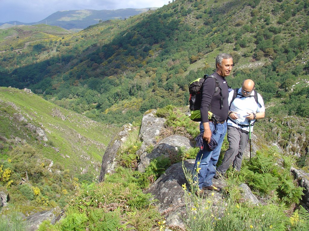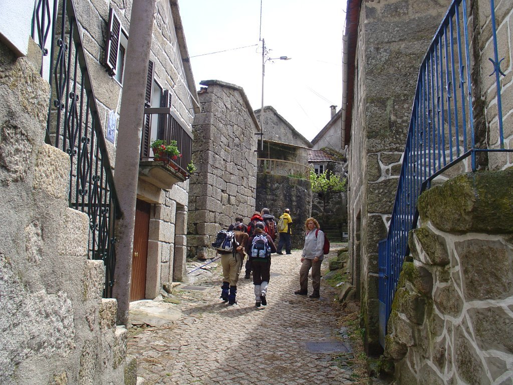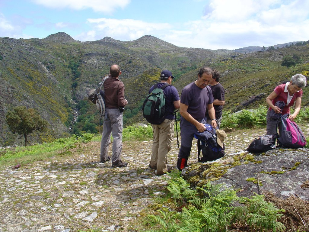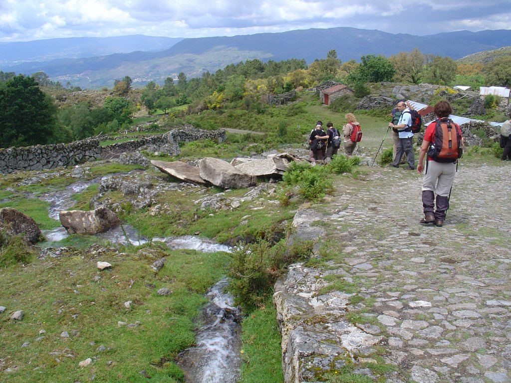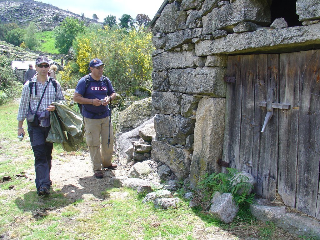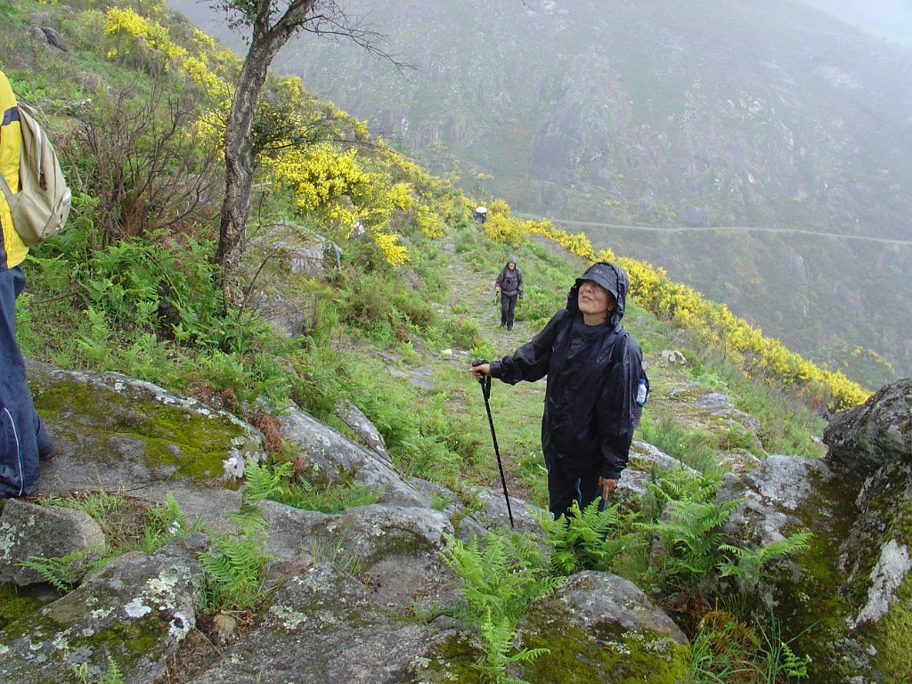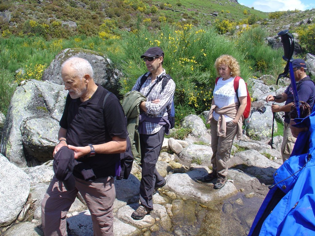Lá atravessamos nas empondras do Froufe, rio para lá, rio para cá, com quedas de arrepiar qualquer truta, até que apanhamos o trilho original, outrora bem demarcado e limpo de vegetação e por onde passavam os carros de bois reduzidos no tamanho e típicos desta aldeia. Na subida, as giestas abafavam a urze e o tojo, escondendo o carreiro e dificultando a caminhada. Quanto mais subíamos, mais as giestas atrapalhavam a escalada, havendo necessidade de romper o caminho com as mãos…se a catana do Pimenta funcionasse, não havia necessidade…e para azarar o esforço dos caminheiros a chuva não se ficou pela ameaça, passando à molha efectiva, ainda que transitória.
