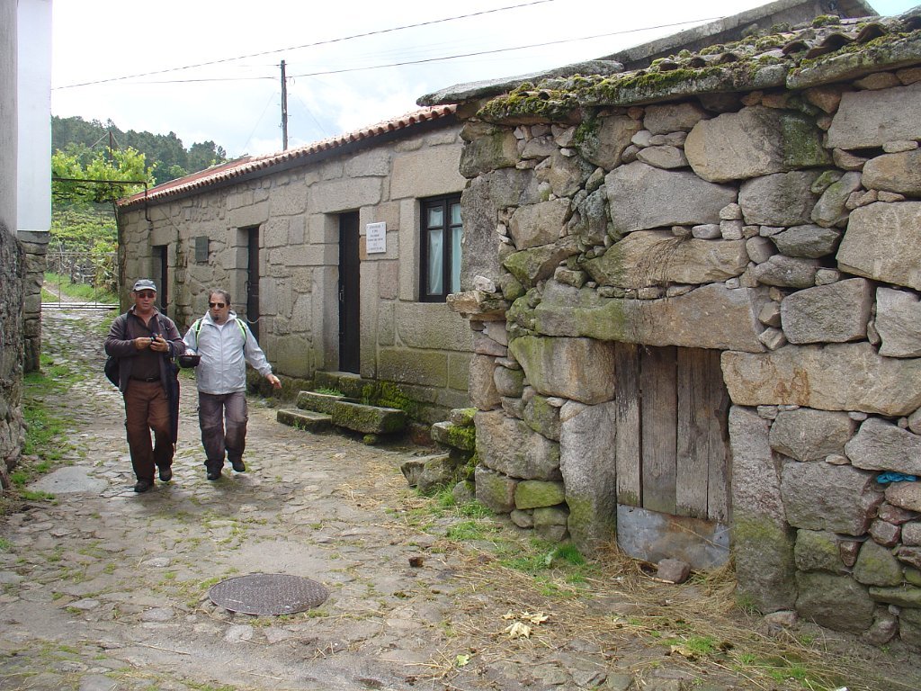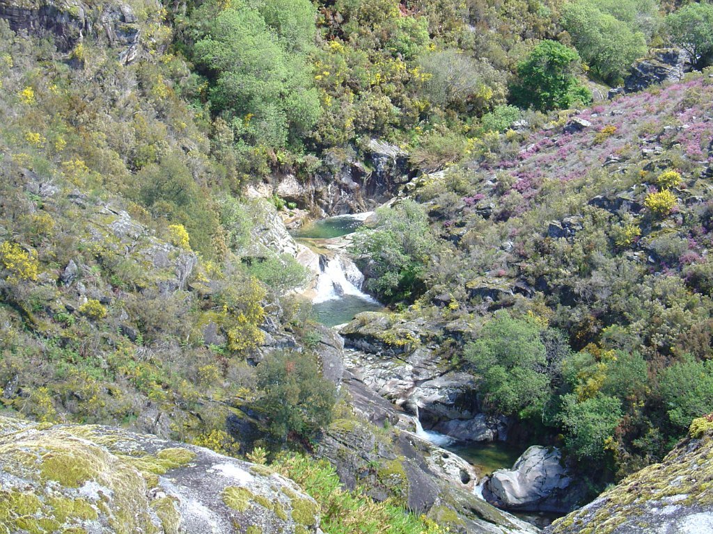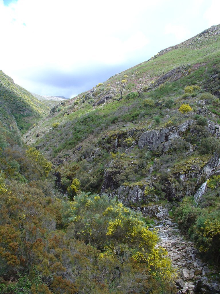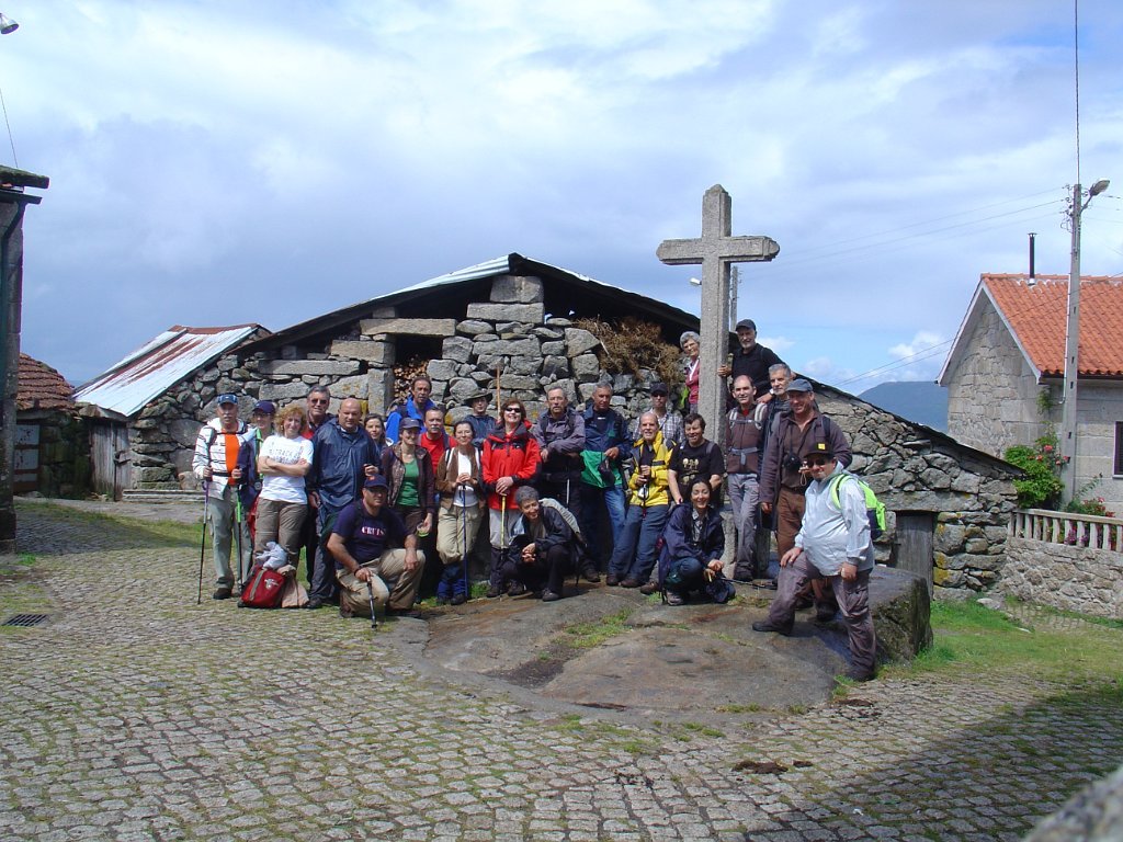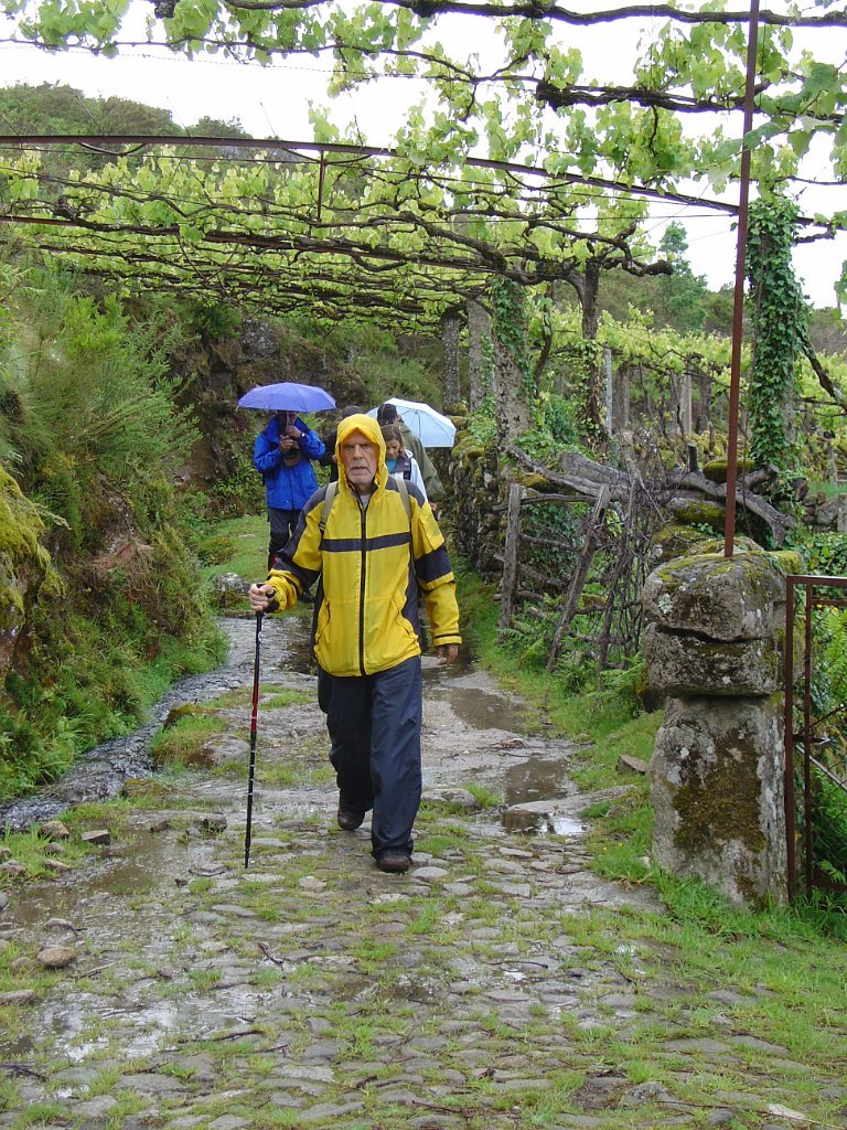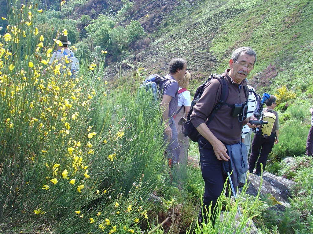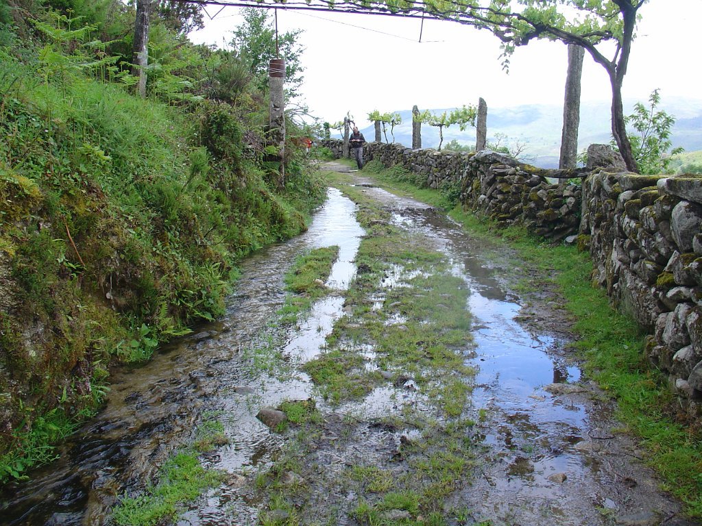 Lá atravessamos nas empondras do Froufe, rio para lá, rio para cá, com quedas de arrepiar qualquer truta, até que apanhamos o trilho original, outrora bem demarcado e limpo de vegetação e por onde passavam os carros de bois reduzidos no tamanho e típicos desta aldeia. Na subida, as giestas abafavam a urze e o tojo, escondendo o carreiro e dificultando a caminhada. Quanto mais subíamos, mais as giestas atrapalhavam a escalada, havendo necessidade de romper o caminho com as mãos…se a catana do Pimenta funcionasse, não havia necessidade…e para azarar o esforço dos caminheiros a chuva não se ficou pela ameaça, passando à molha efectiva, ainda que transitória.