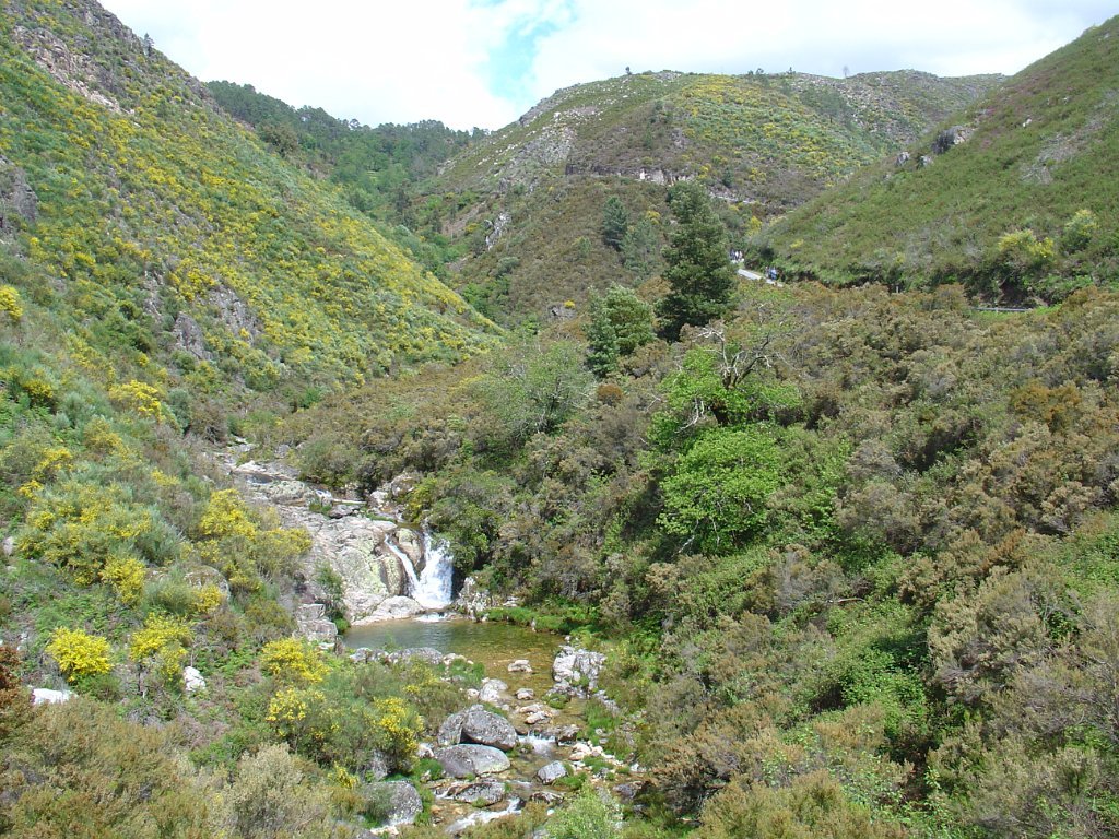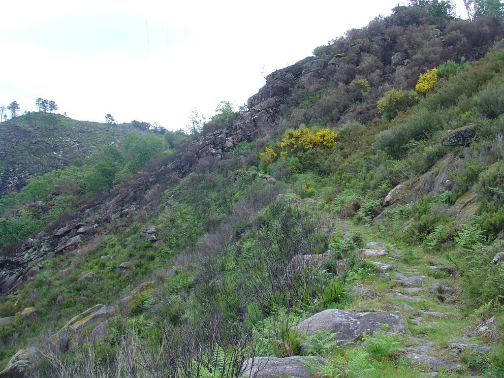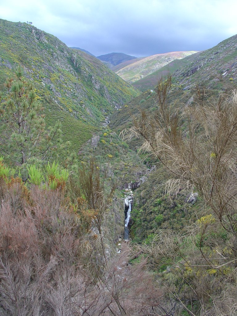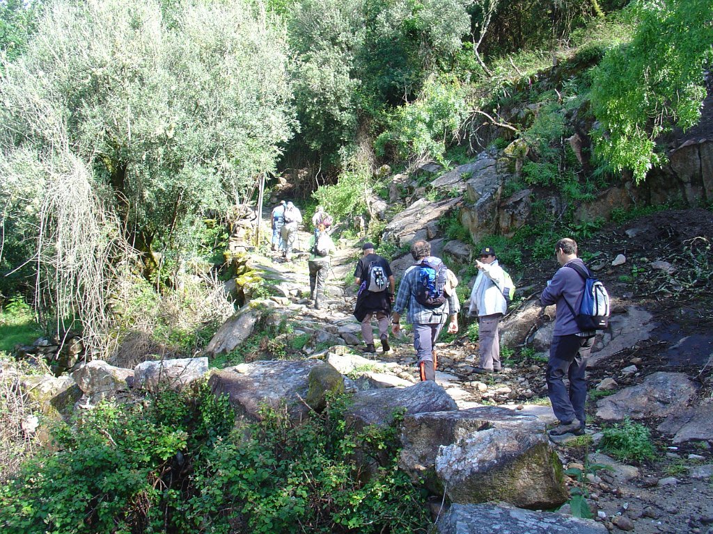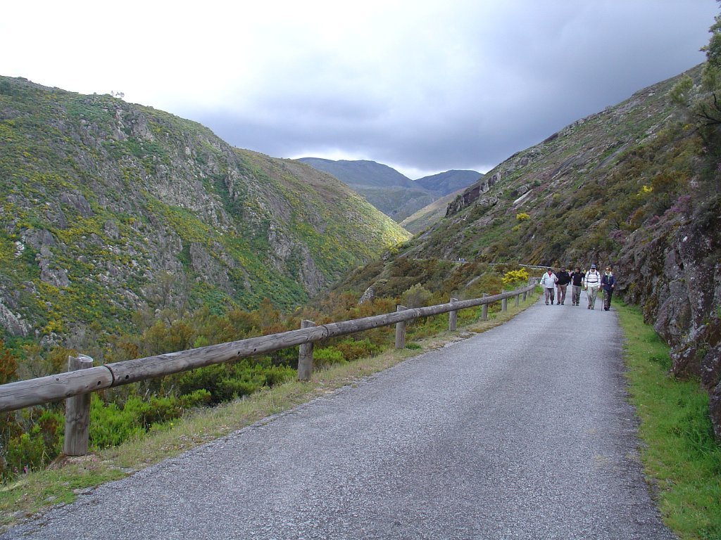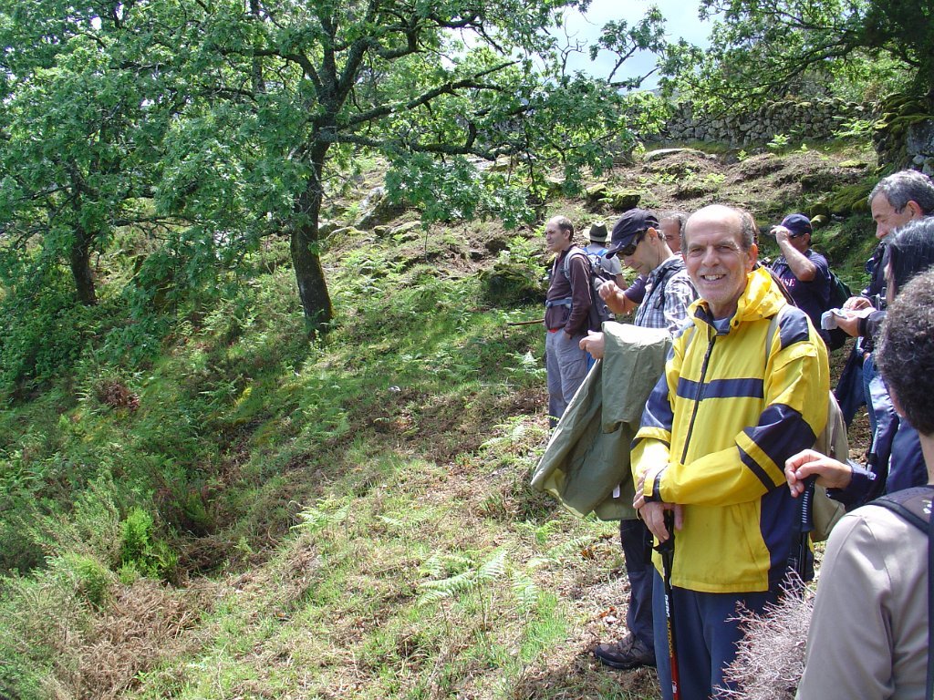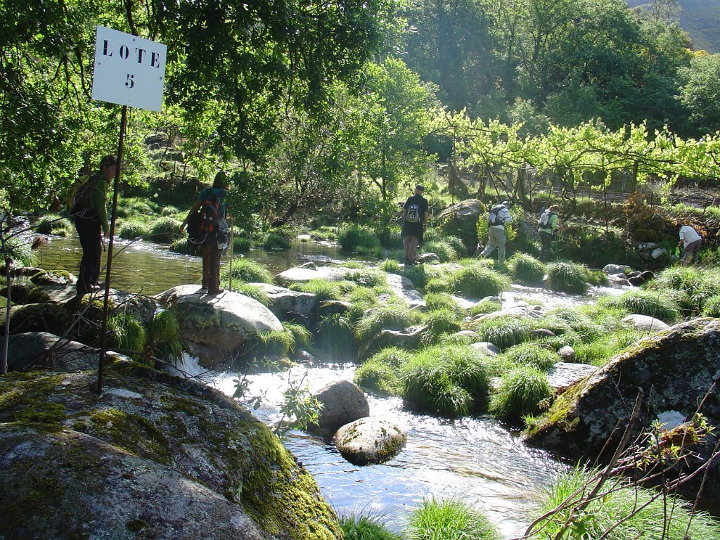 Lá atravessamos nas empondras do Froufe, rio para lá, rio para cá, com quedas de arrepiar qualquer truta, até que apanhamos o trilho original, outrora bem demarcado e limpo de vegetação e por onde passavam os carros de bois reduzidos no tamanho e típicos desta aldeia. Na subida, as giestas abafavam a urze e o tojo, escondendo o carreiro e dificultando a caminhada. Quanto mais subíamos, mais as giestas atrapalhavam a escalada, havendo necessidade de romper o caminho com as mãos…se a catana do Pimenta funcionasse, não havia necessidade…e para azarar o esforço dos caminheiros a chuva não se ficou pela ameaça, passando à molha efectiva, ainda que transitória.