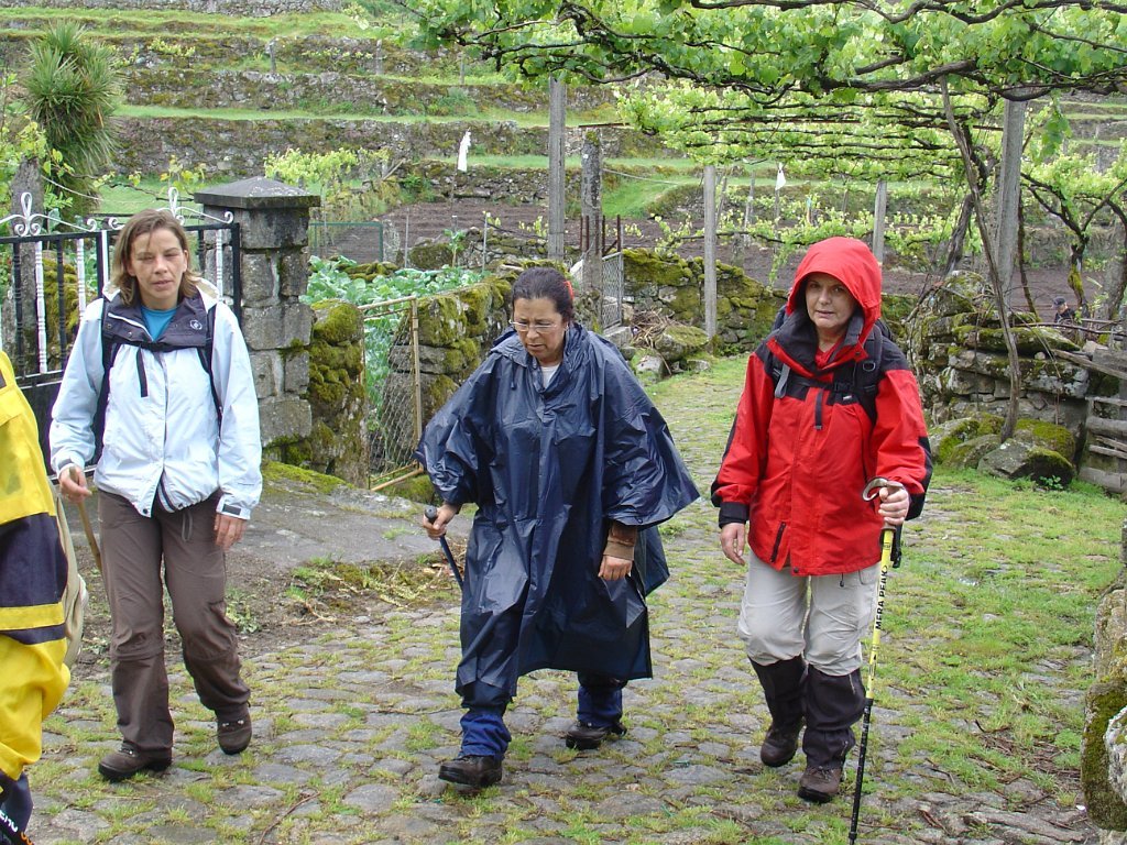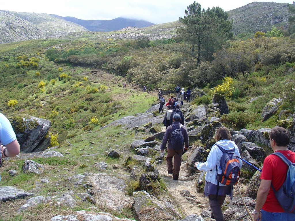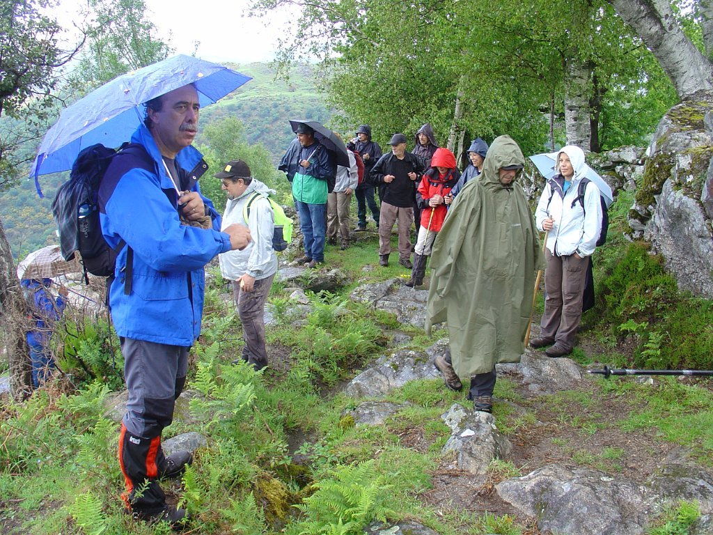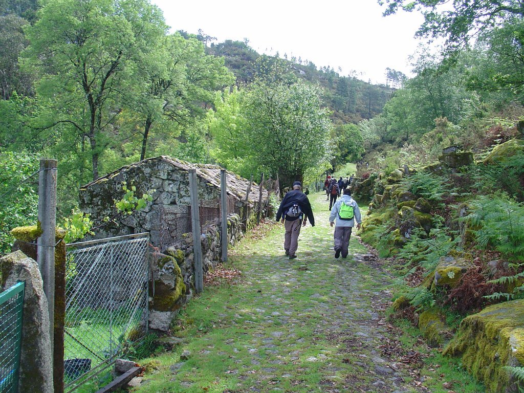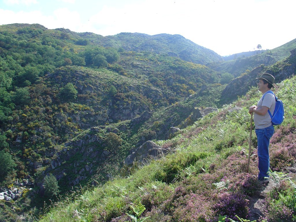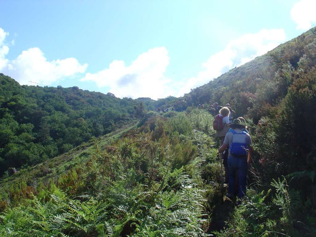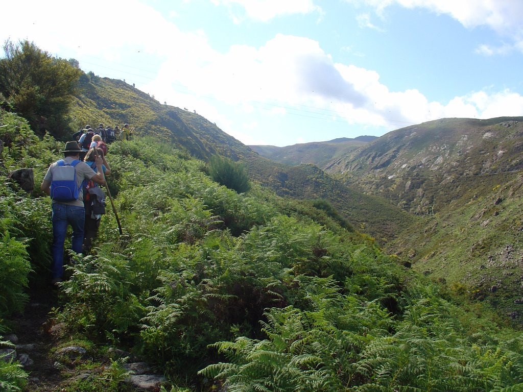 Lá atravessamos nas empondras do Froufe, rio para lá, rio para cá, com quedas de arrepiar qualquer truta, até que apanhamos o trilho original, outrora bem demarcado e limpo de vegetação e por onde passavam os carros de bois reduzidos no tamanho e típicos desta aldeia. Na subida, as giestas abafavam a urze e o tojo, escondendo o carreiro e dificultando a caminhada. Quanto mais subíamos, mais as giestas atrapalhavam a escalada, havendo necessidade de romper o caminho com as mãos…se a catana do Pimenta funcionasse, não havia necessidade…e para azarar o esforço dos caminheiros a chuva não se ficou pela ameaça, passando à molha efectiva, ainda que transitória.