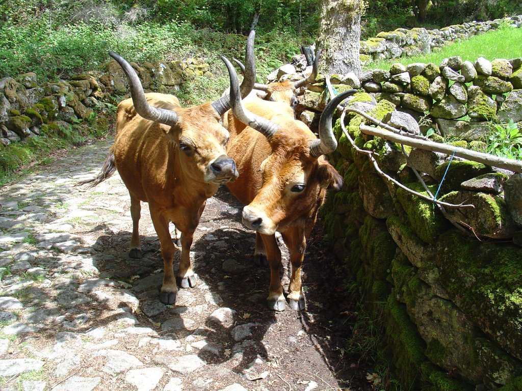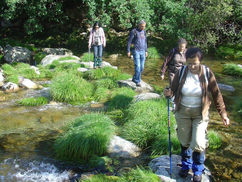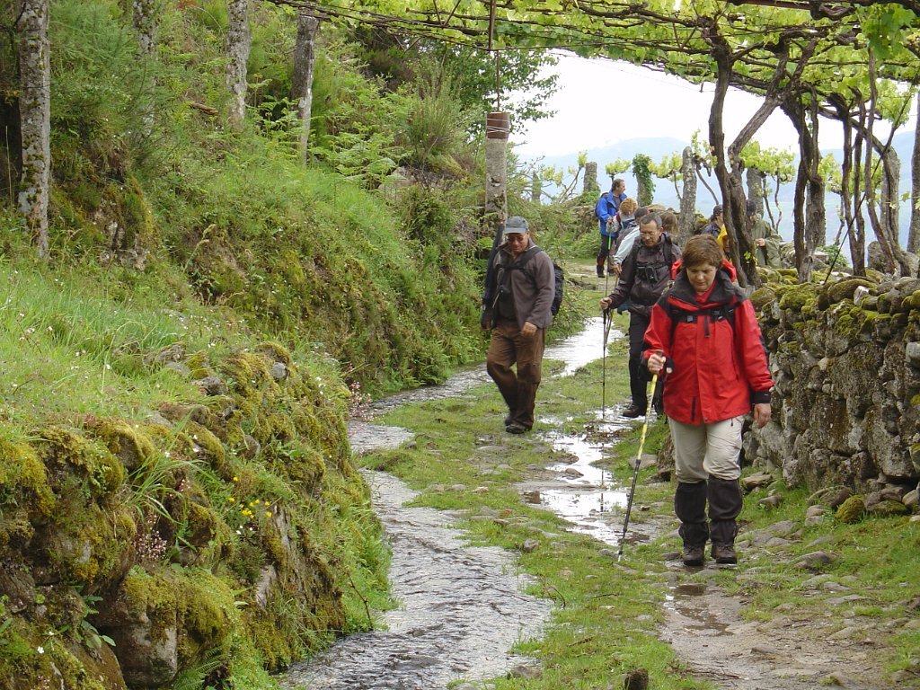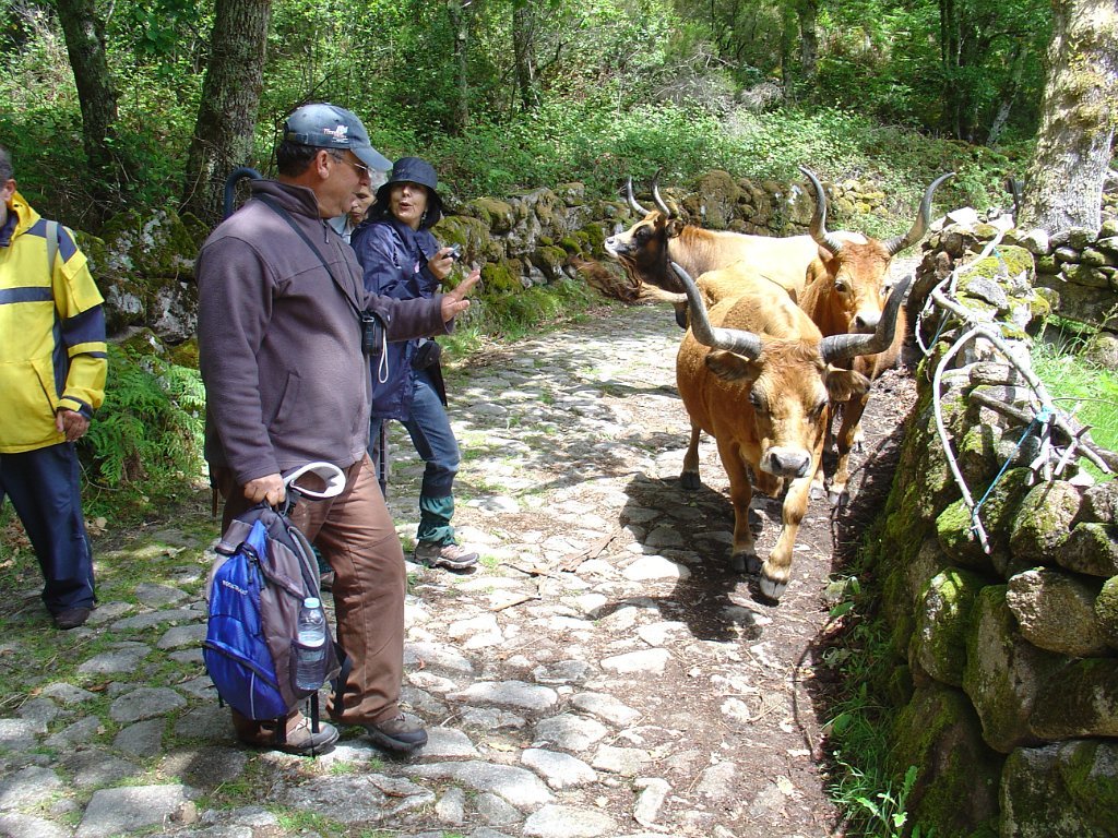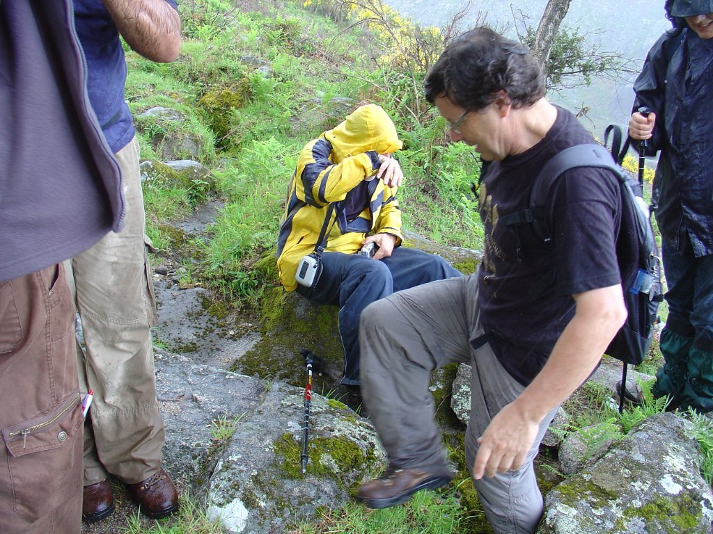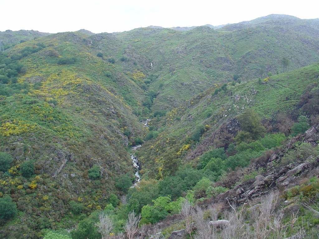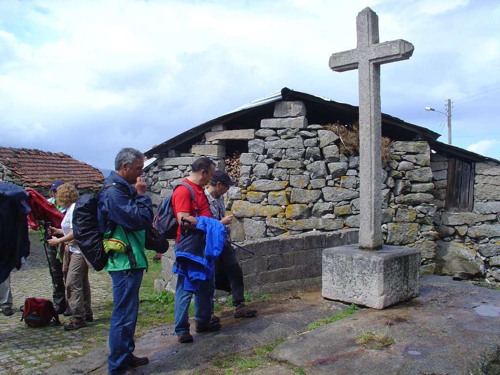 Lá atravessamos nas empondras do Froufe, rio para lá, rio para cá, com quedas de arrepiar qualquer truta, até que apanhamos o trilho original, outrora bem demarcado e limpo de vegetação e por onde passavam os carros de bois reduzidos no tamanho e típicos desta aldeia. Na subida, as giestas abafavam a urze e o tojo, escondendo o carreiro e dificultando a caminhada. Quanto mais subíamos, mais as giestas atrapalhavam a escalada, havendo necessidade de romper o caminho com as mãos…se a catana do Pimenta funcionasse, não havia necessidade…e para azarar o esforço dos caminheiros a chuva não se ficou pela ameaça, passando à molha efectiva, ainda que transitória.